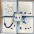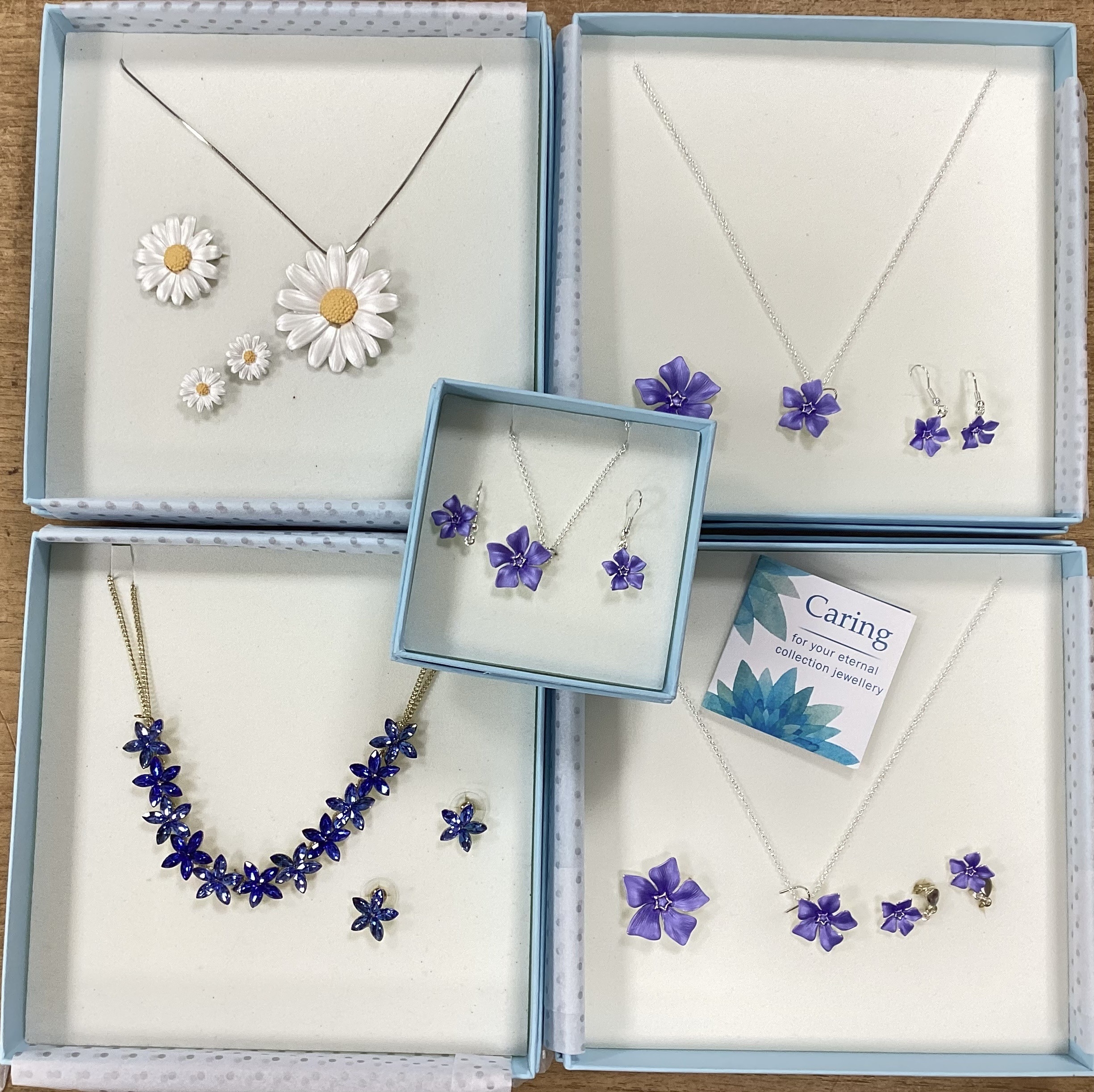 Eternal Collection; A Small Collection of Floral Style Jewellery Sets, including 'Dainty Daisy' enamelled pendant necklace, brooch and earring set, Forget Me Not enamelled necklace, brooch and drop earring set, gilt tone diamanté necklace and earring set, of flowerhead design etc, in original boxes :- One Tray