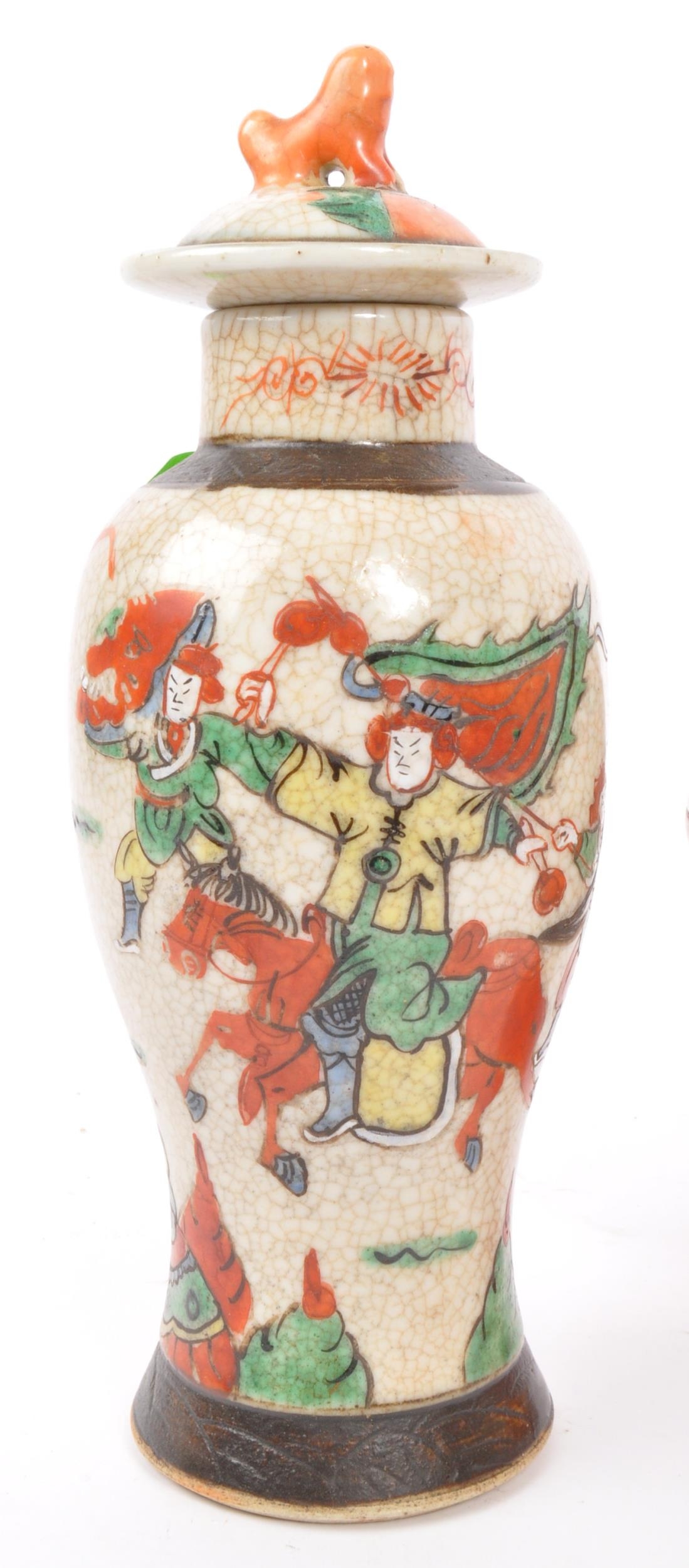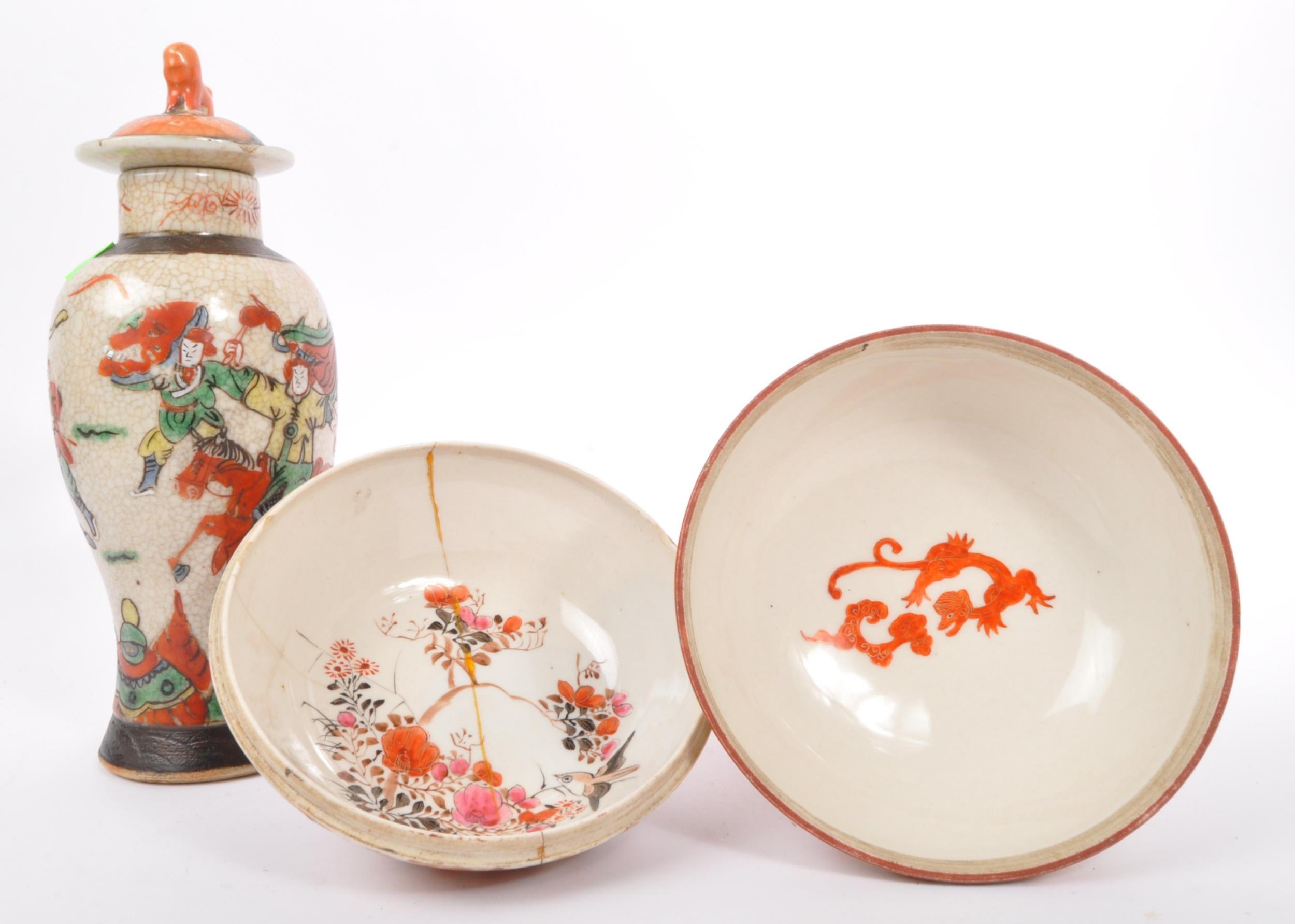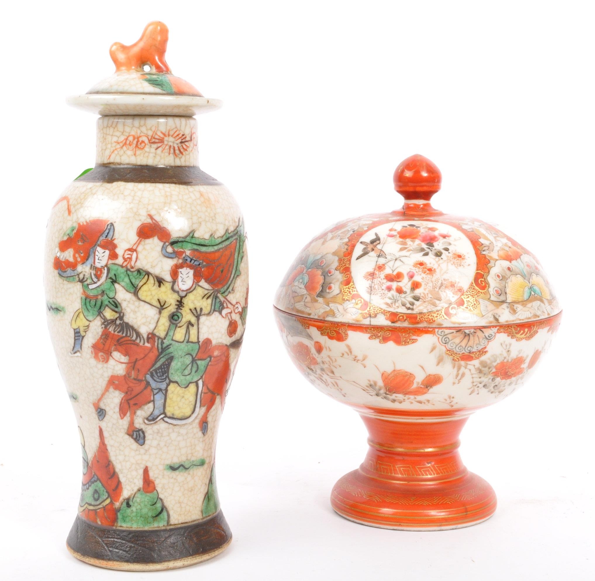 A 19th Century Japanese Kutani lidded dish atop a plinth stand with red ochre grounds and gilded decoration, accompanied by a 19th century Chinese Oriental crackle glaze hand painted ceramic baluster shaped lidded vase. The vase having a lid with foo dog shaped handle over a straight tall neck. Decorated with hand painted scenes of warriors. Kutani dish condition AF.