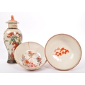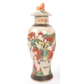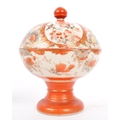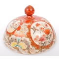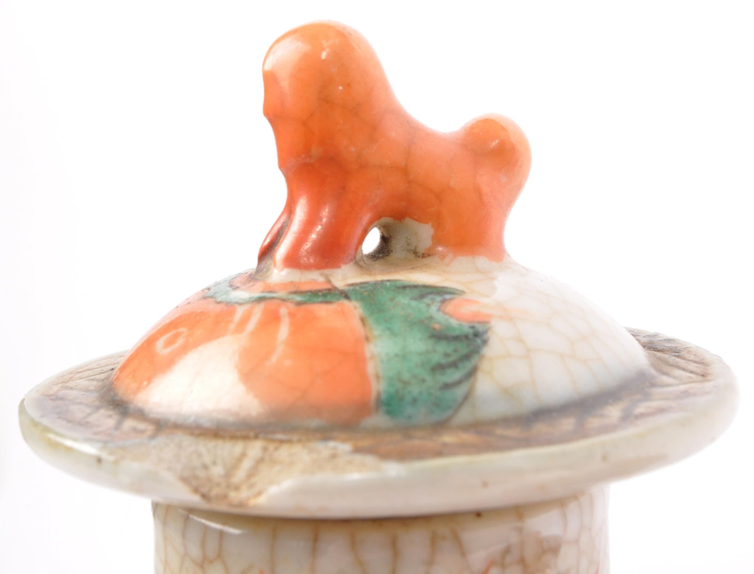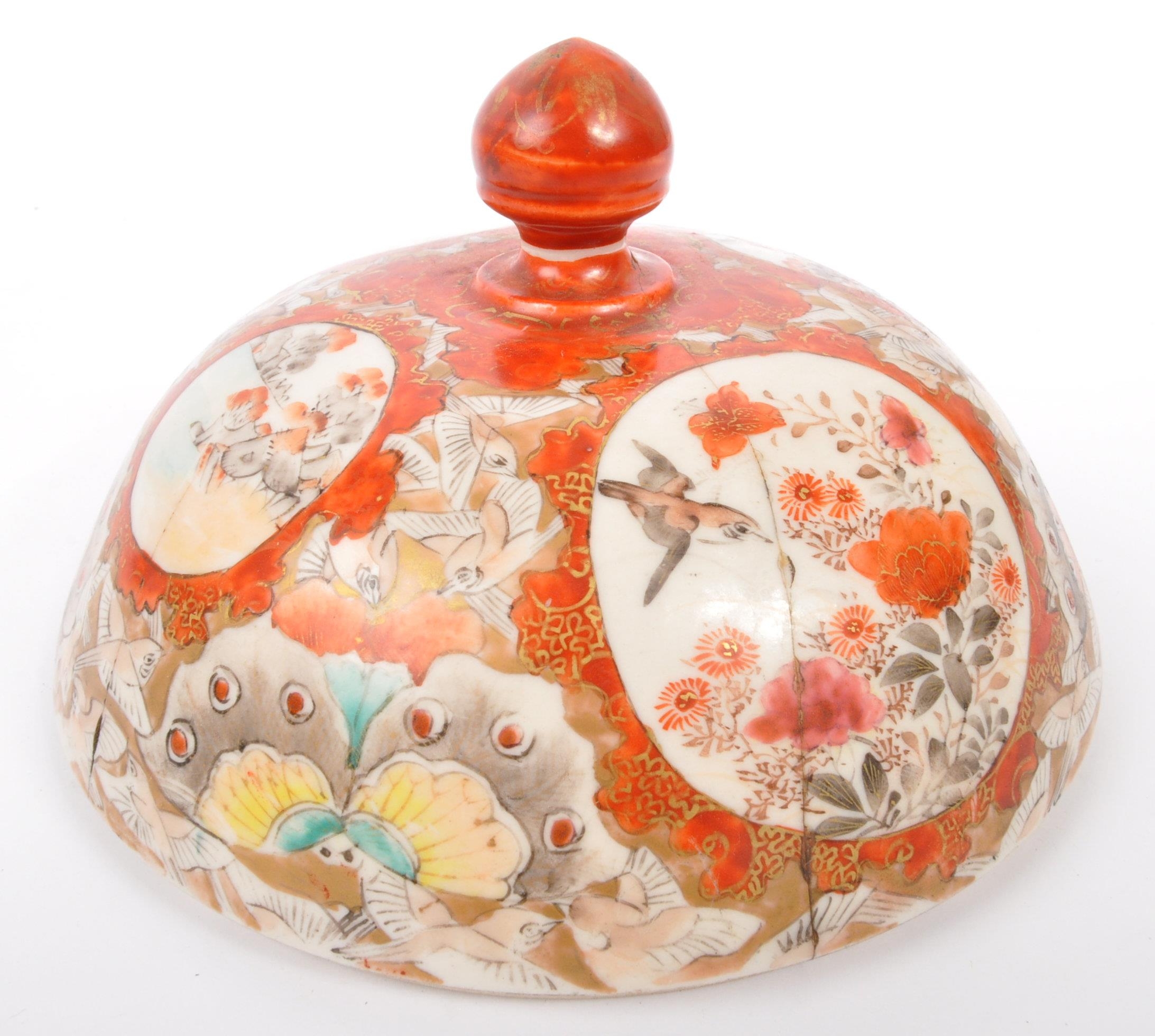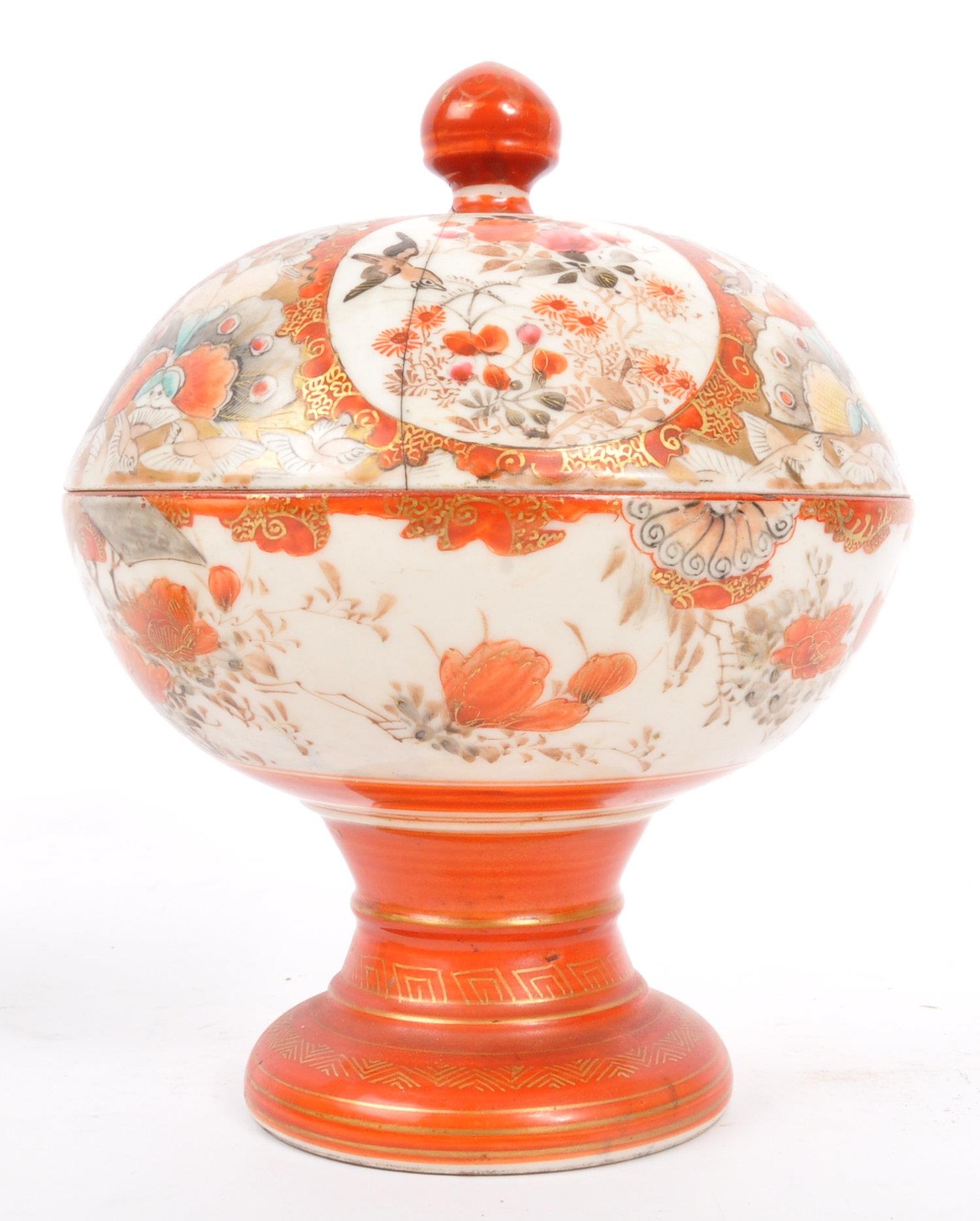 A 19th Century Japanese Kutani lidded dish atop a plinth stand with red ochre grounds and gilded decoration, accompanied by a 19th century Chinese Oriental crackle glaze hand painted ceramic baluster shaped lidded vase. The vase having a lid with foo dog shaped handle over a straight tall neck. Decorated with hand painted scenes of warriors. Kutani dish condition AF.
