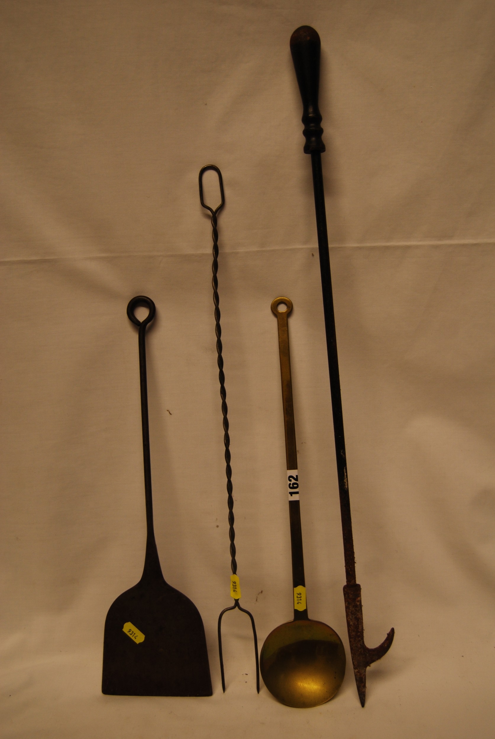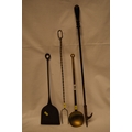 19TH CENTURY IRON POKER, IRON SKILLET, BRASS LADLE & WIRE TWIST TOASTING FORK