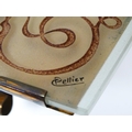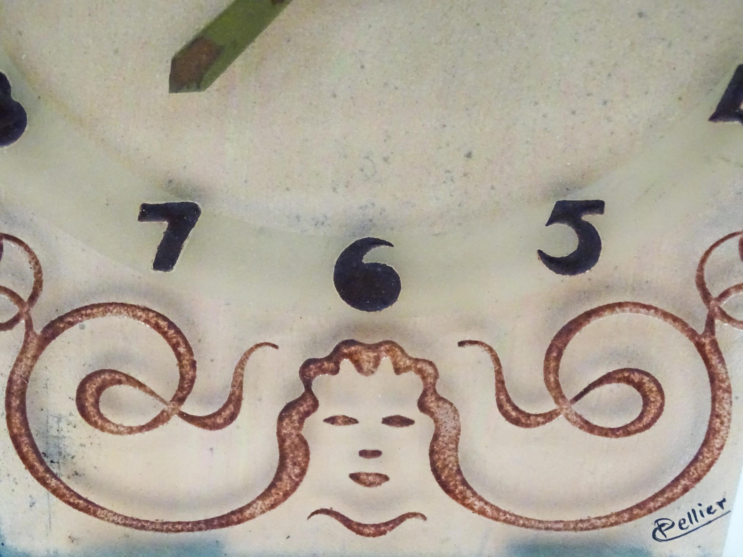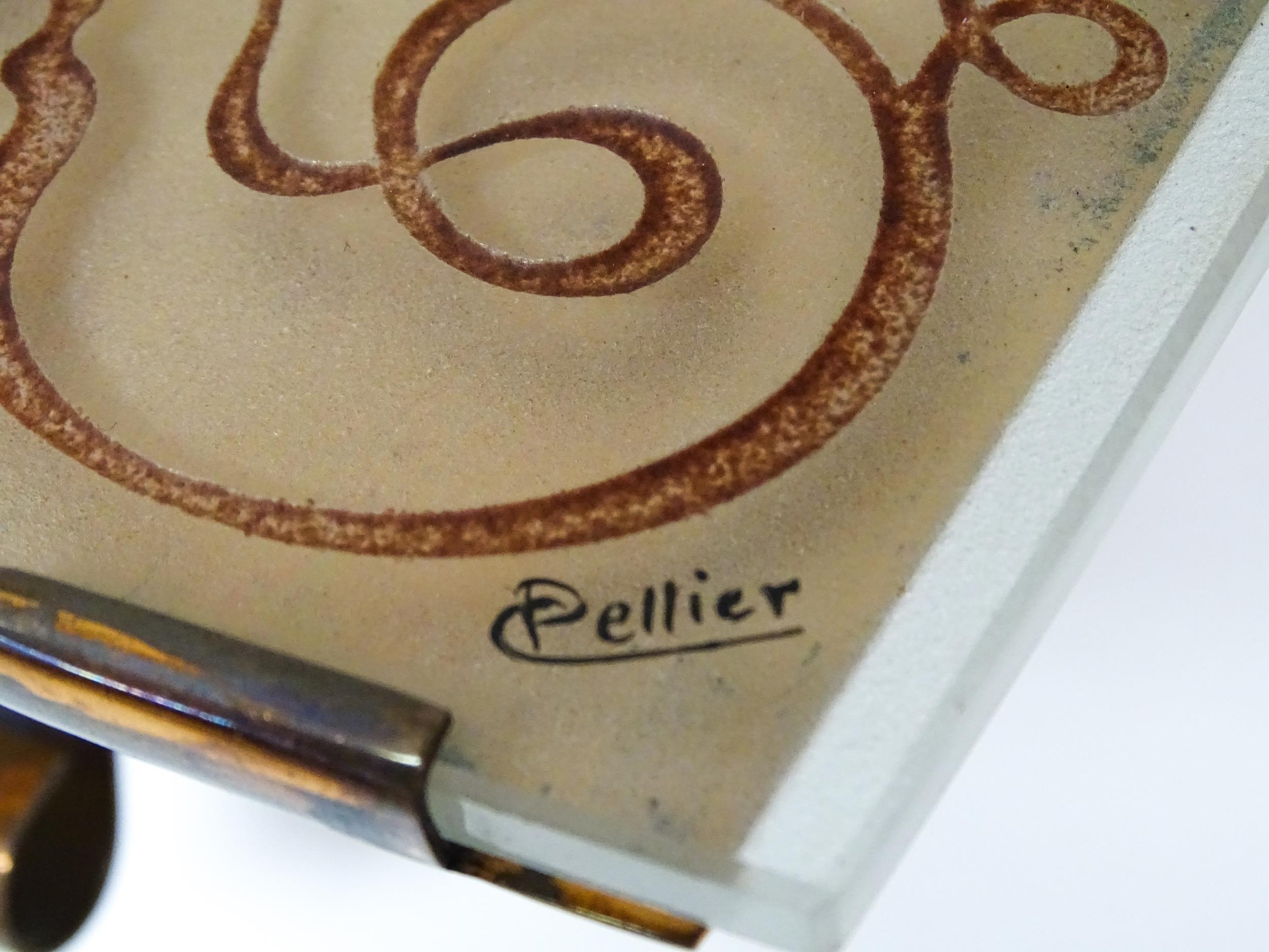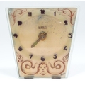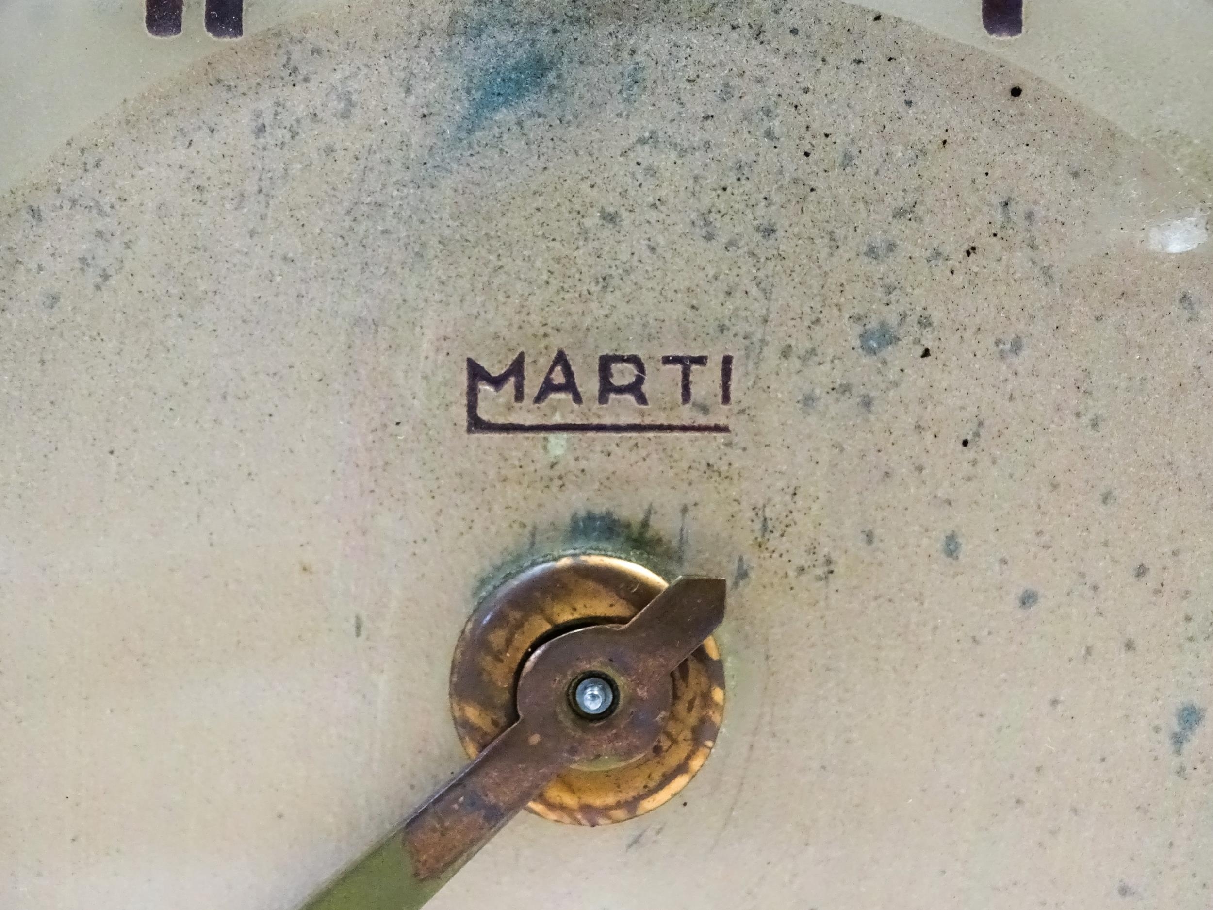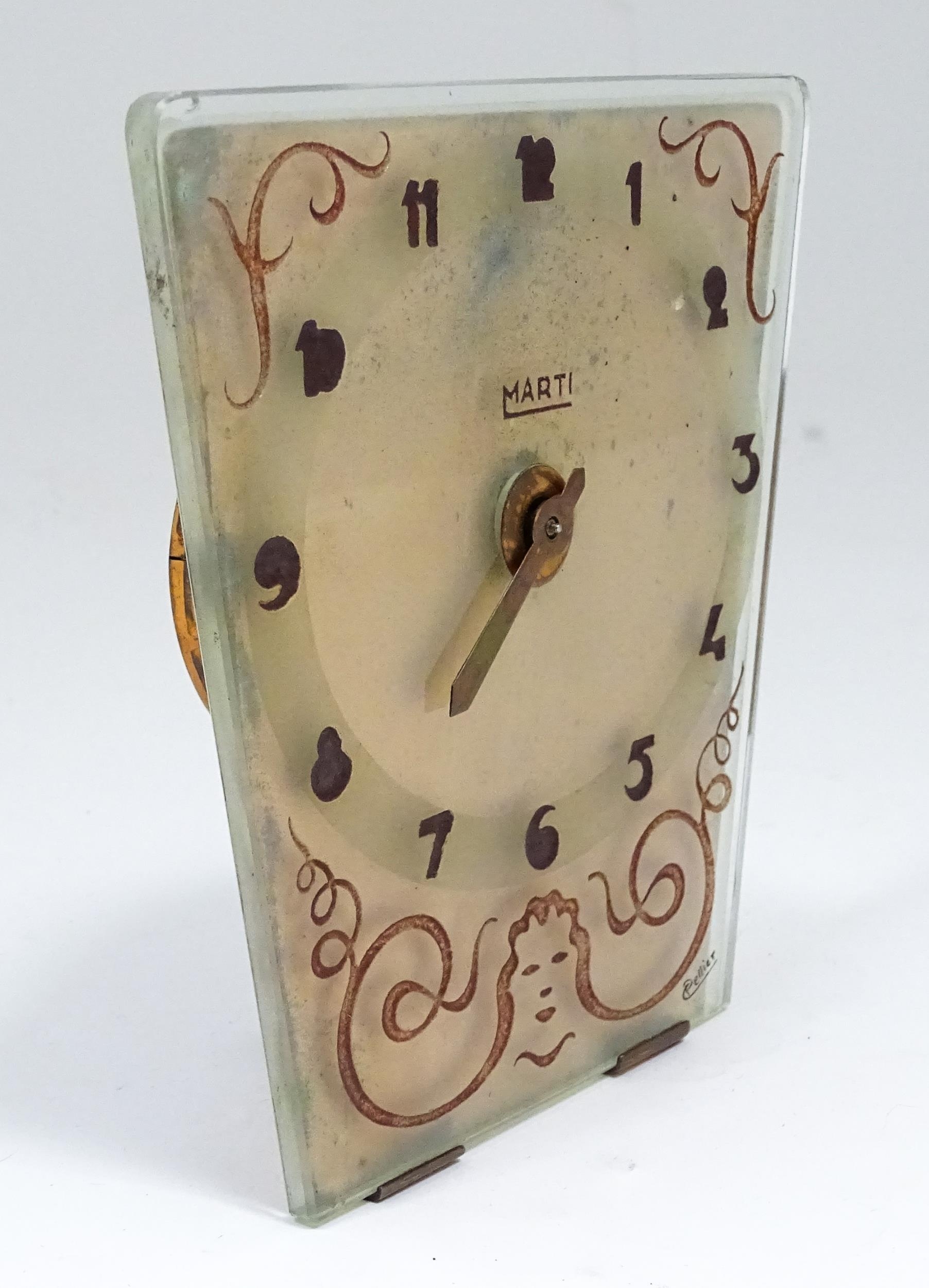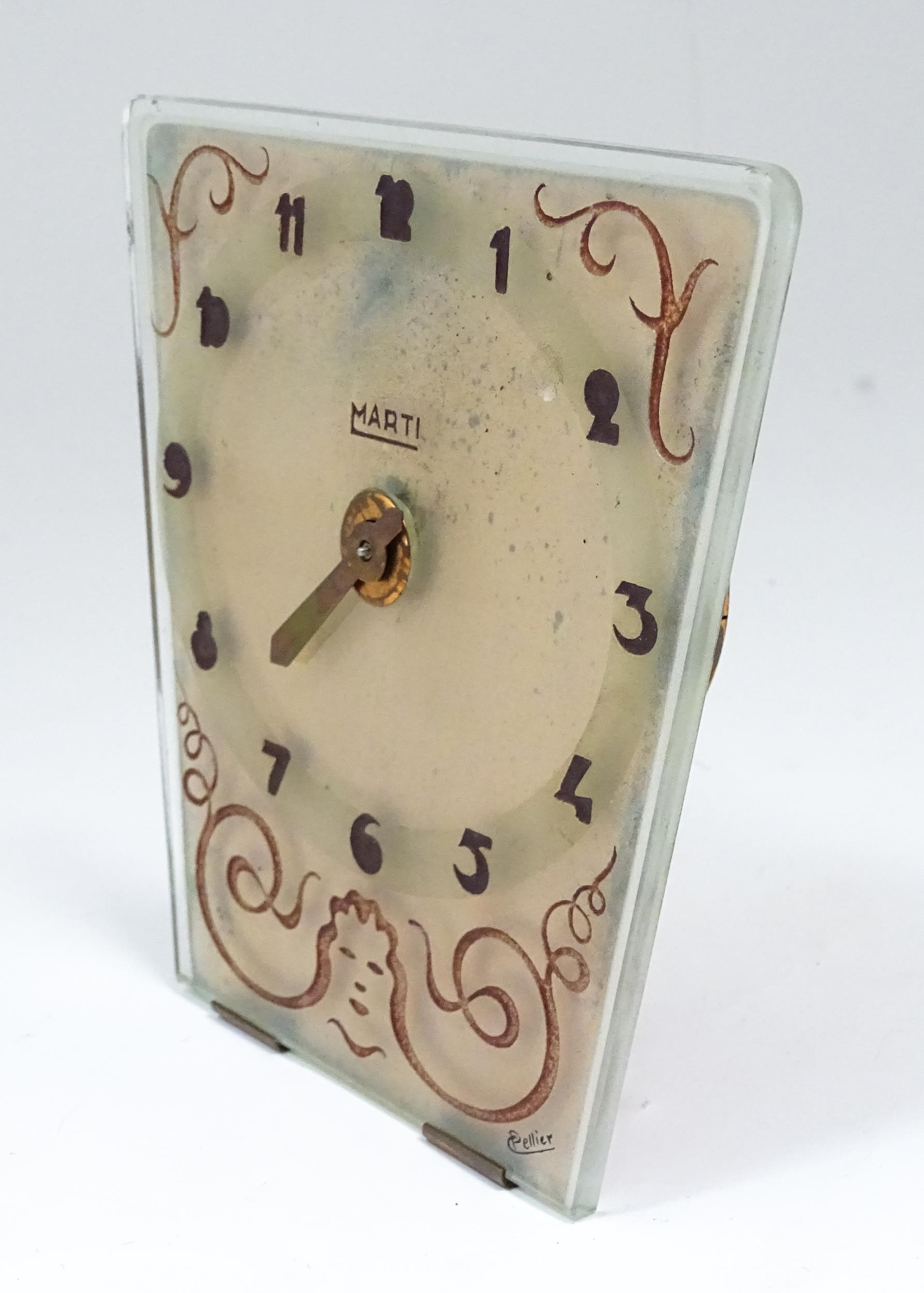 A French Art Deco mantle clock, the glass face with etched and engraved detail, Arabic chapter ring, the dial signed Marti, and further signed Pellier lower right. Approx. 6" high