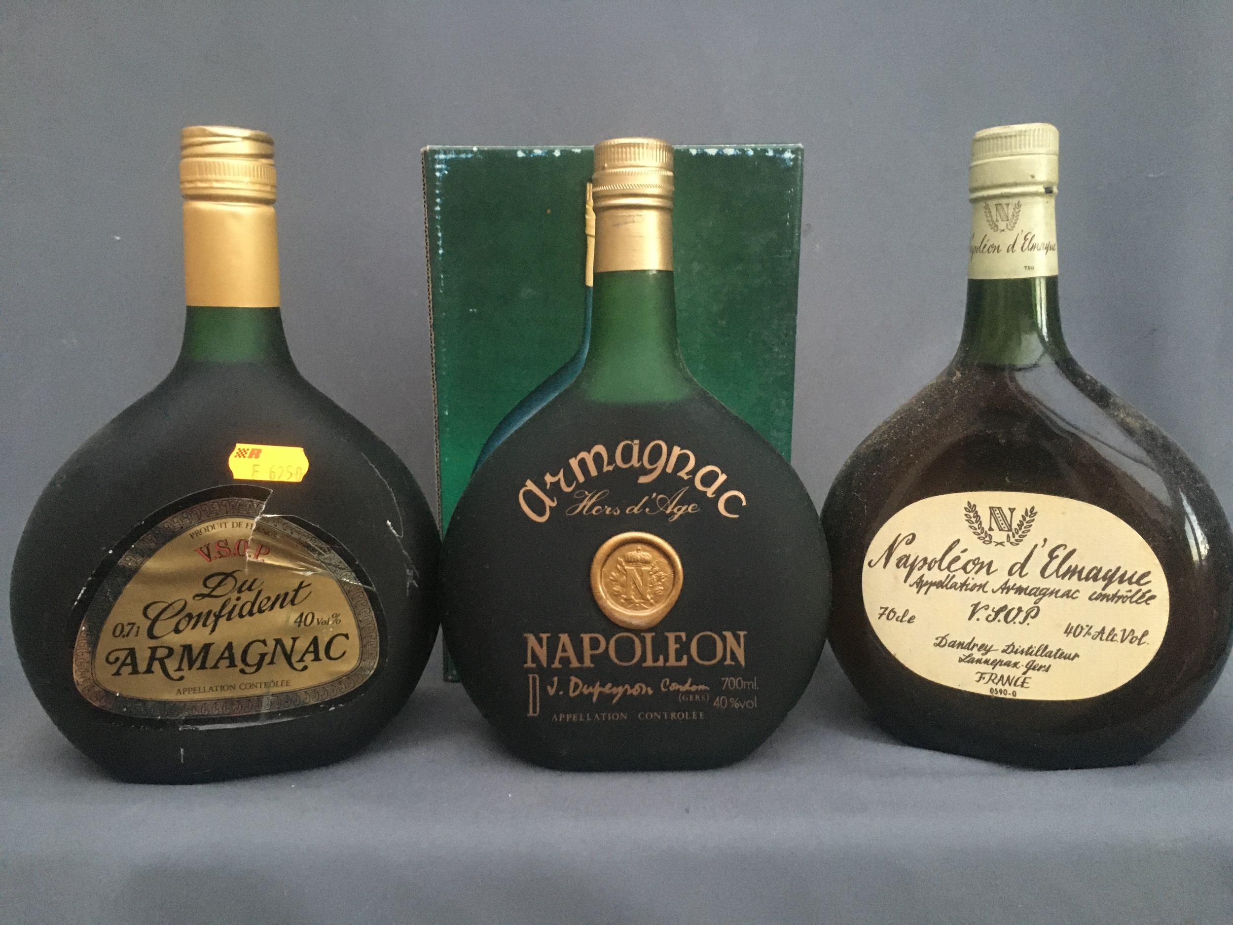 NAPOLEON D'ELMAQUE VSOP Armagnac brandy 40% abv. 70cl, DU CONFIDENT VSOP Armagnac brandy 40% abv. 70cl and NAPOLEON Hors d'Age Armagnac brandy 40% abv. 70cl boxed. (3)