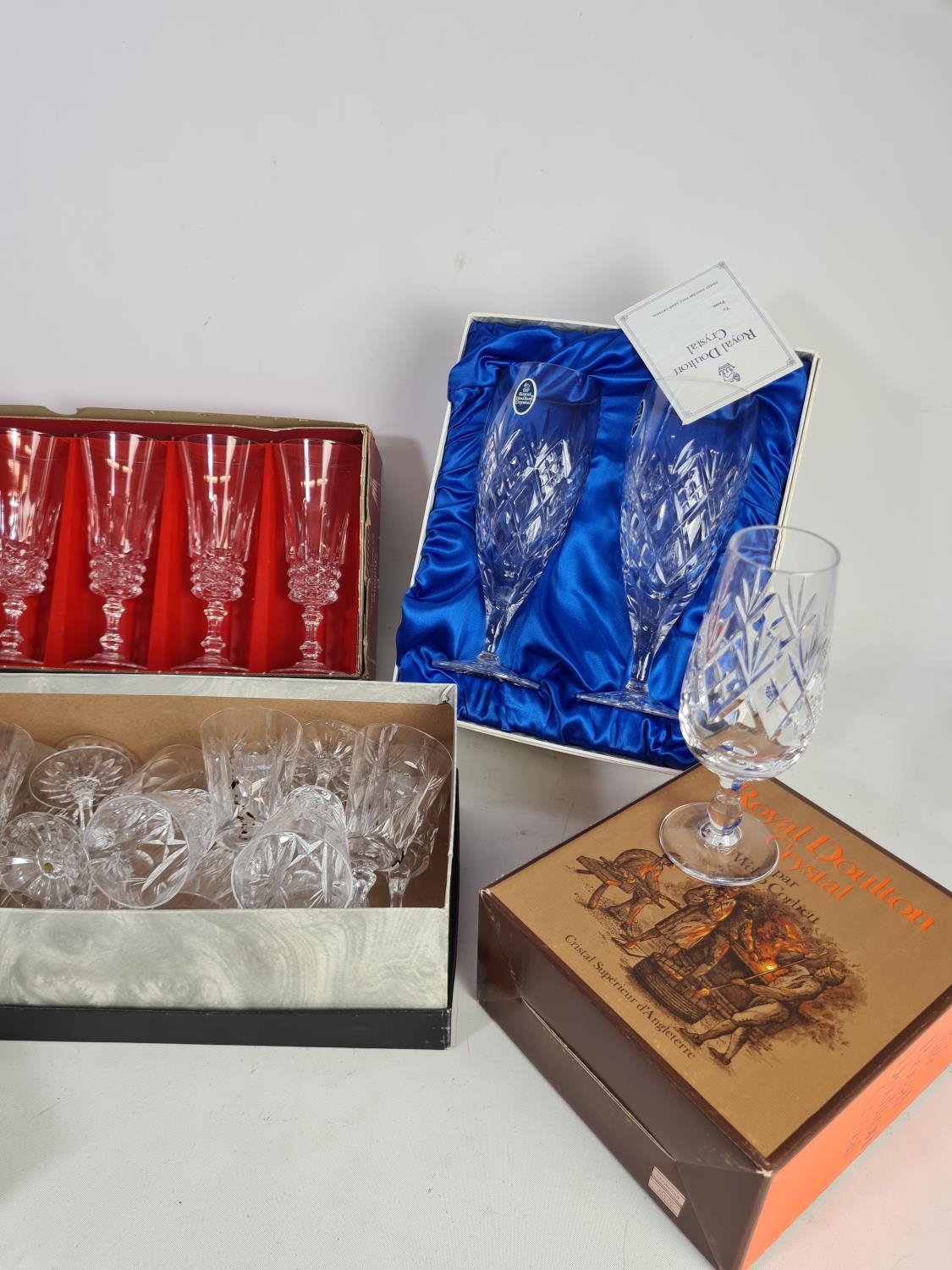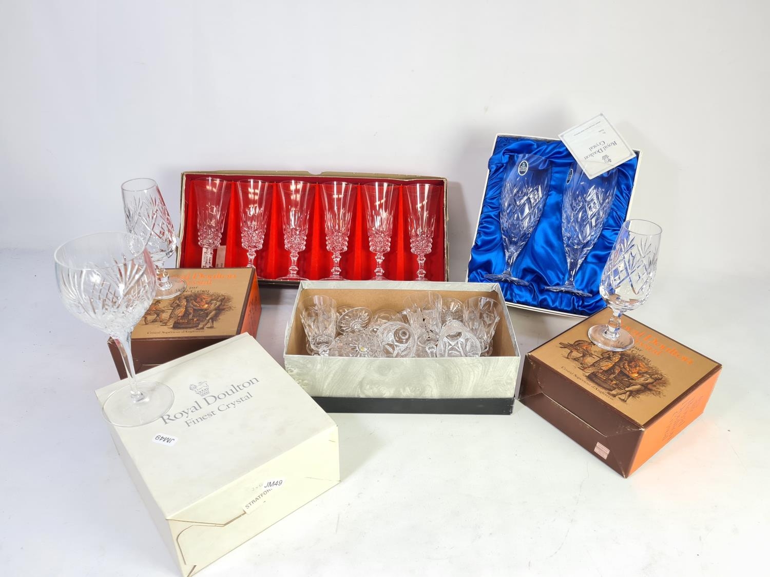 A collection of assorted glassware to include a boxed pair of Royal Doulton Stratford finest crystal goblets, set of six Cristal D’arques Taille glasses, two boxed pairs of Royal Doulton crystal par Webb Corbett champagne flutes etc.