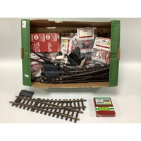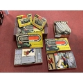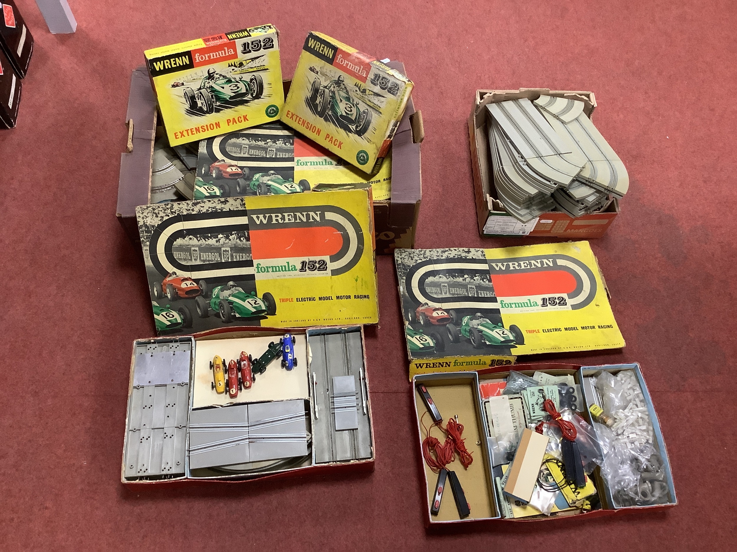 A Quantity of Wrenn Formula 152 Electric Model Motor Racing components to include five racing cars (all with faults/damages), Track Extension Pack, Bridge Supports, Spare Tyres, etc. All playworn. (Two Boxes).