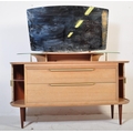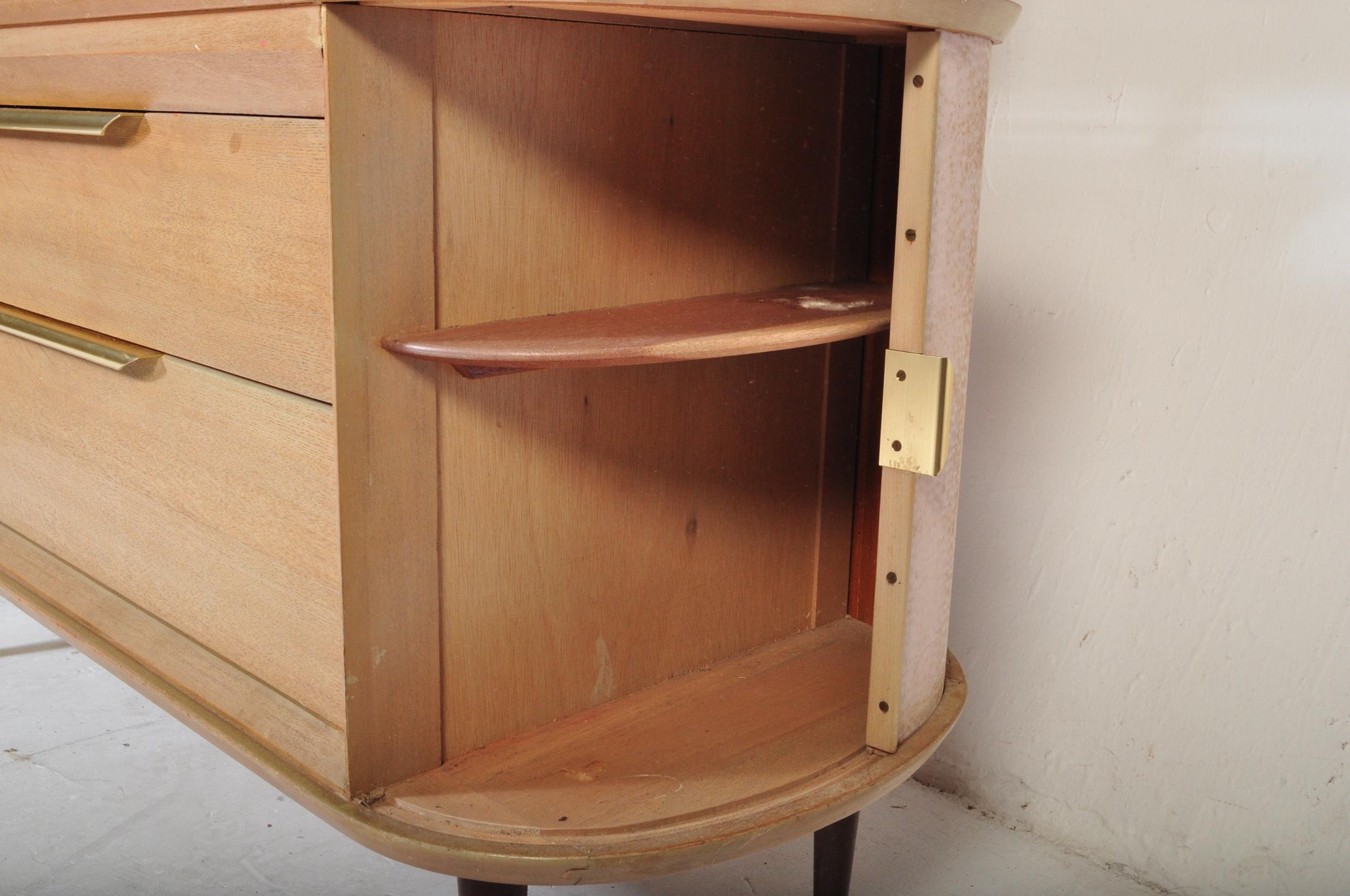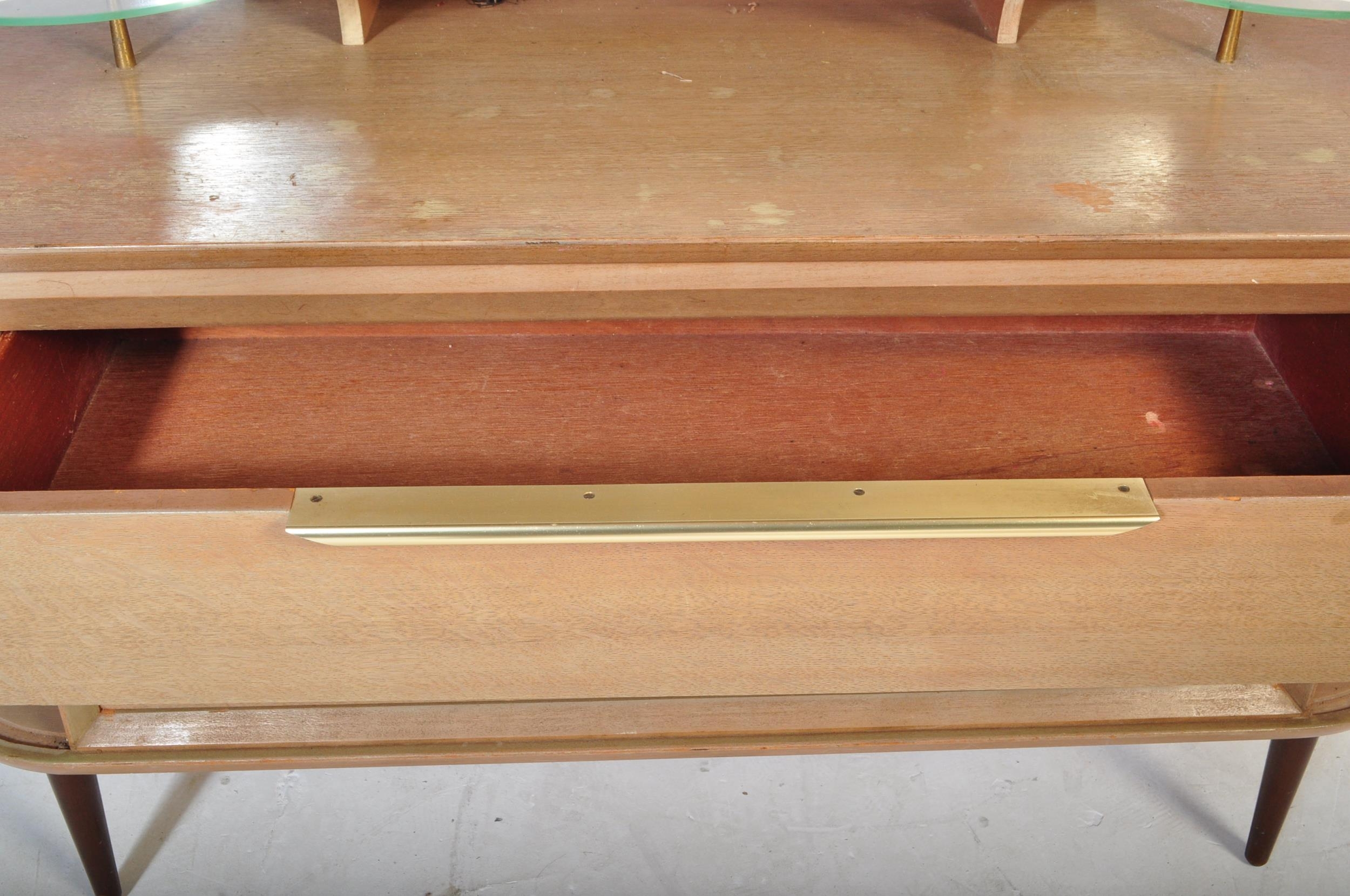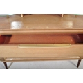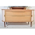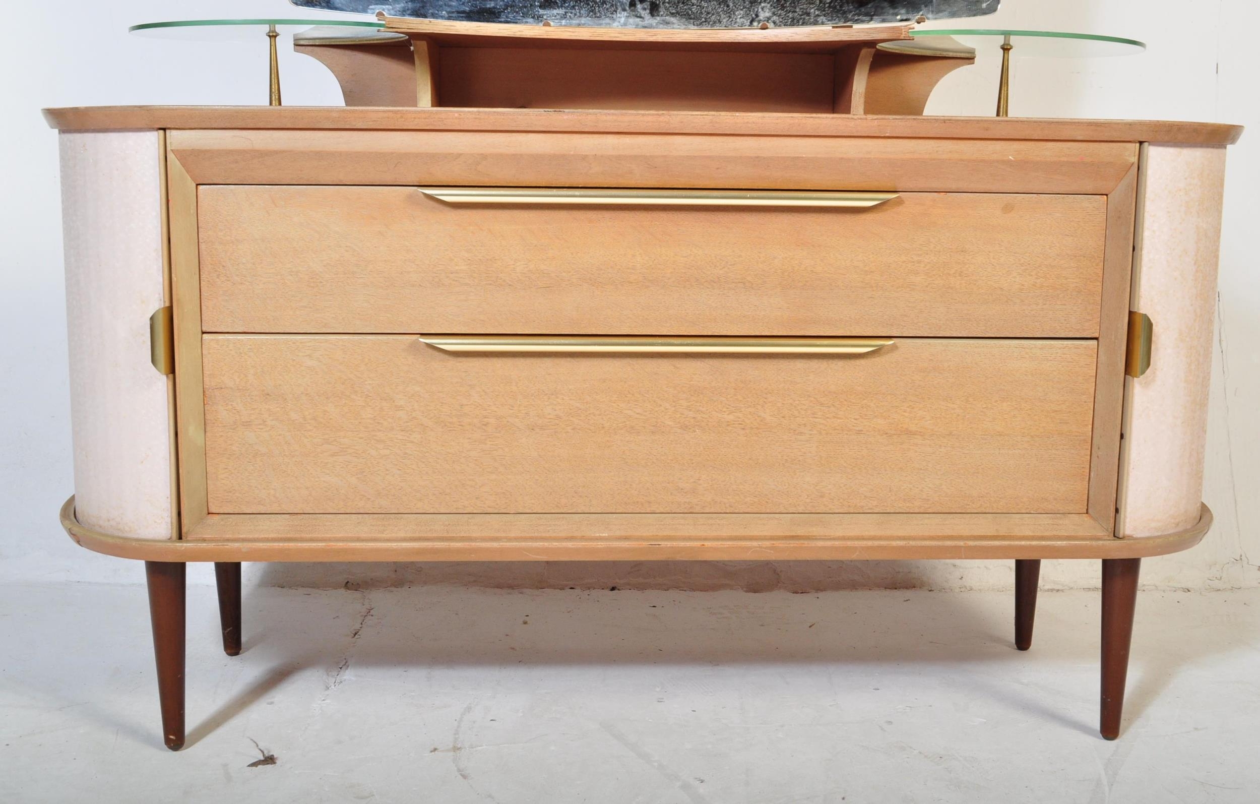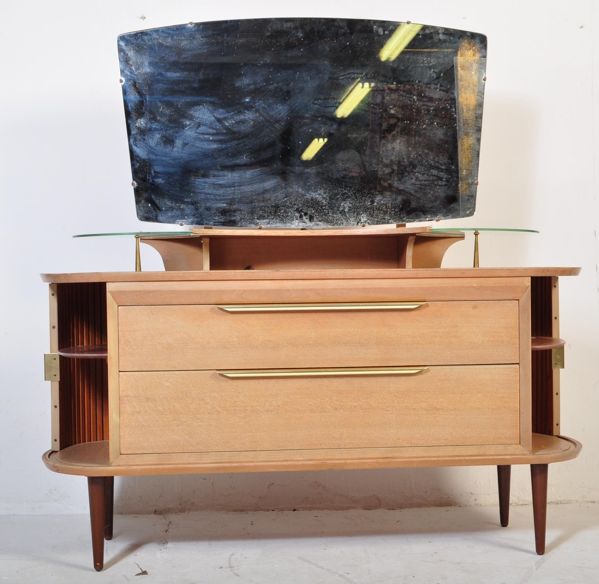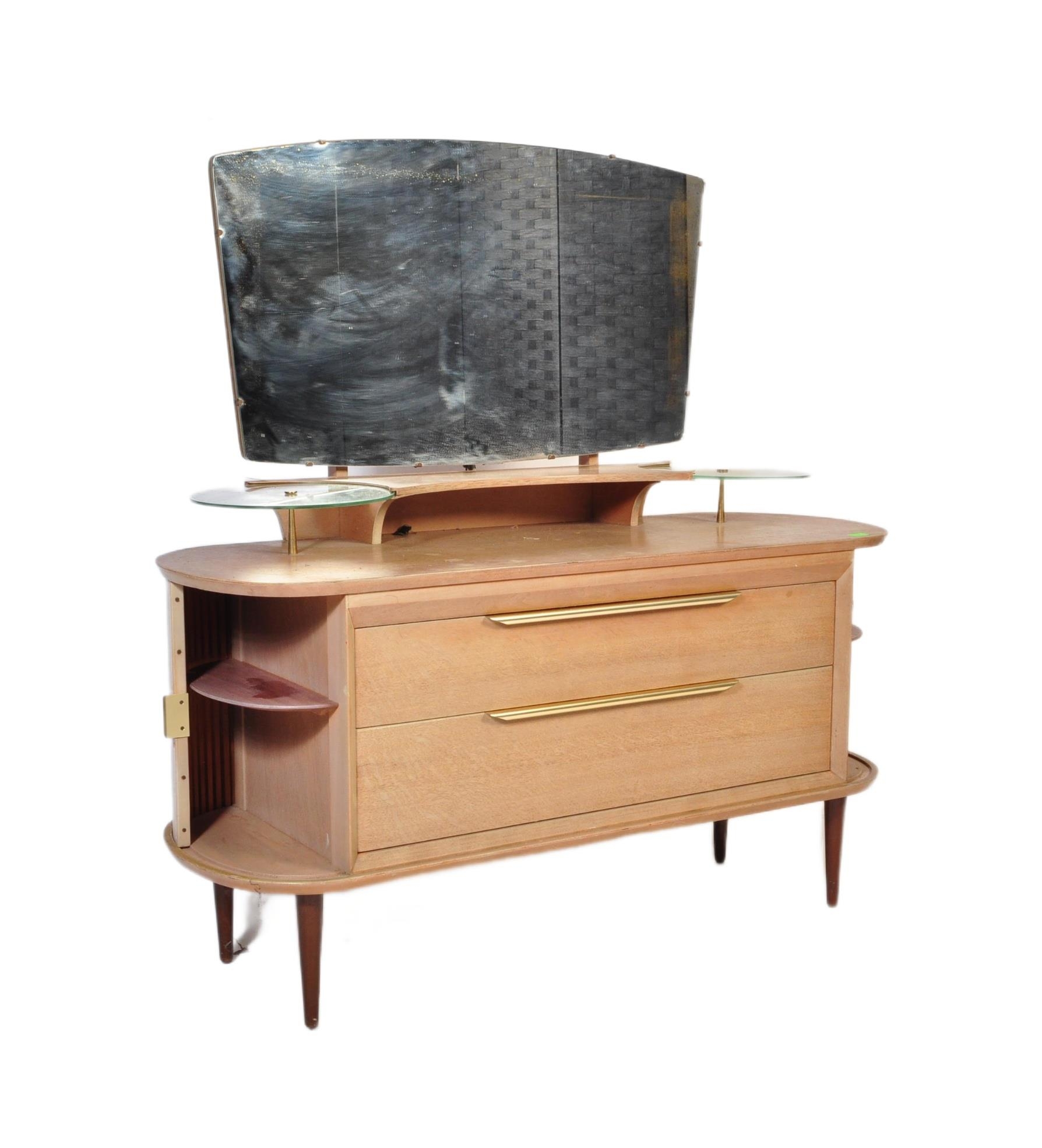 A retro vintage mid 20th Century oak dressing table having a mirror to back with twin suspension set circular glass sections, central knee hole flanked by tambour doors. Measures approx; 129cm x 125cm x 49cm.
