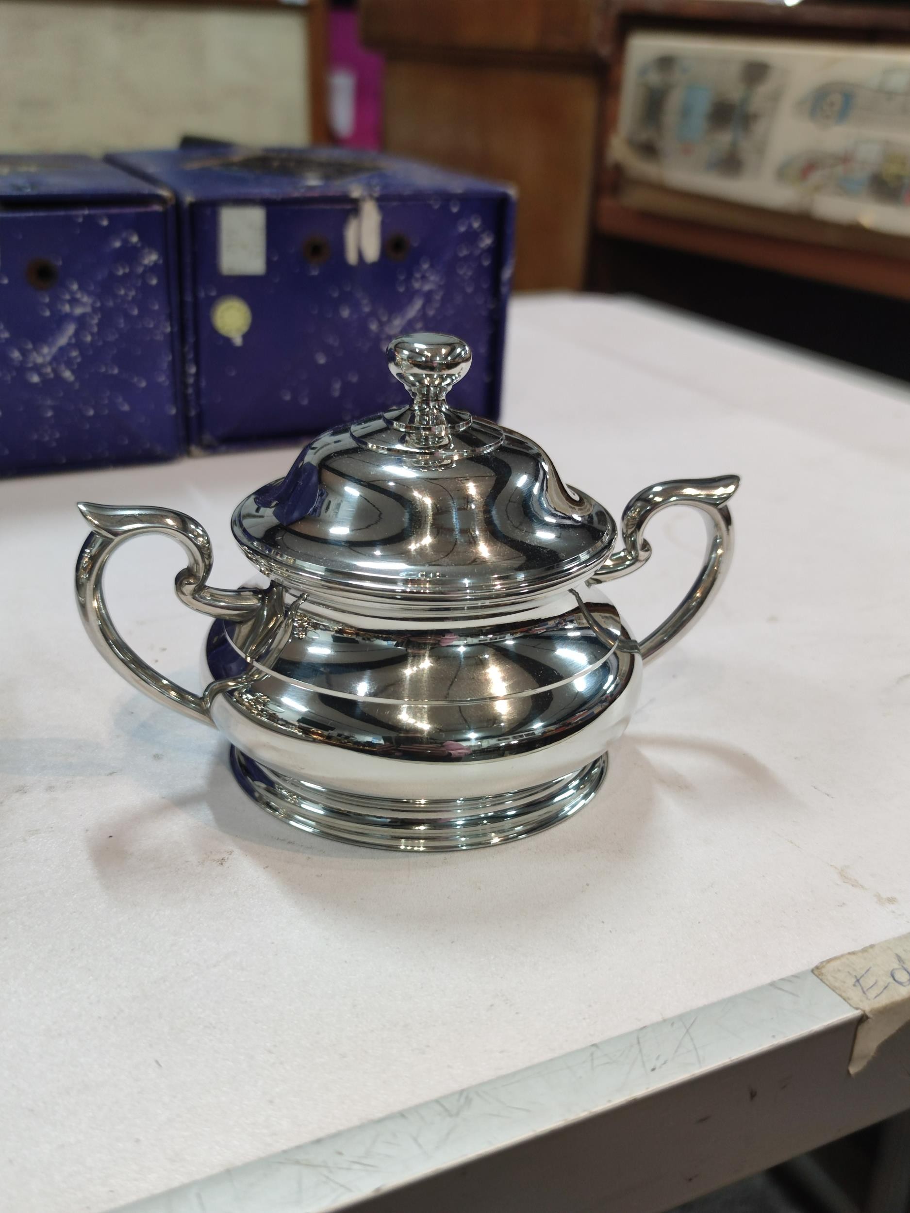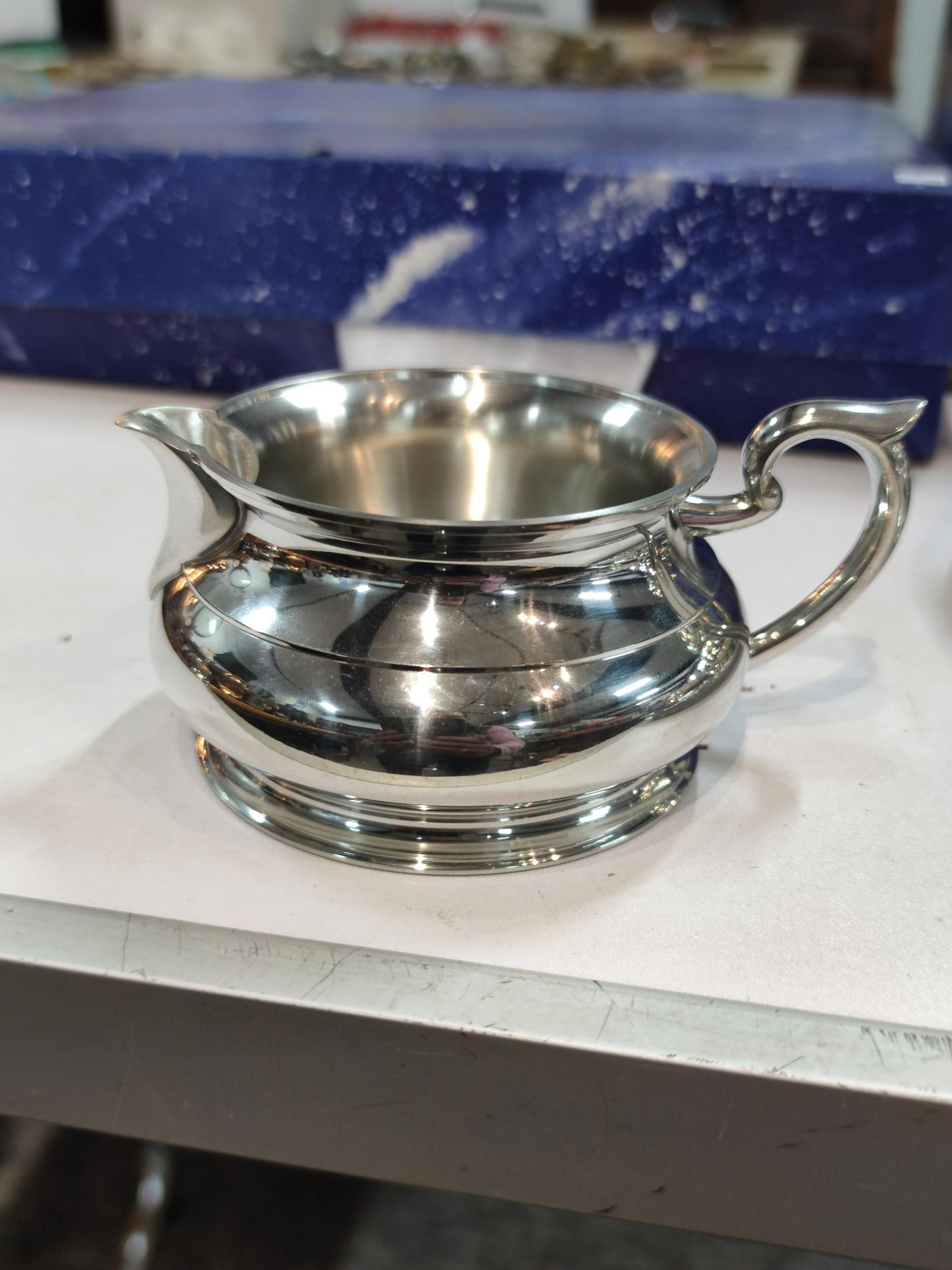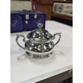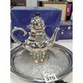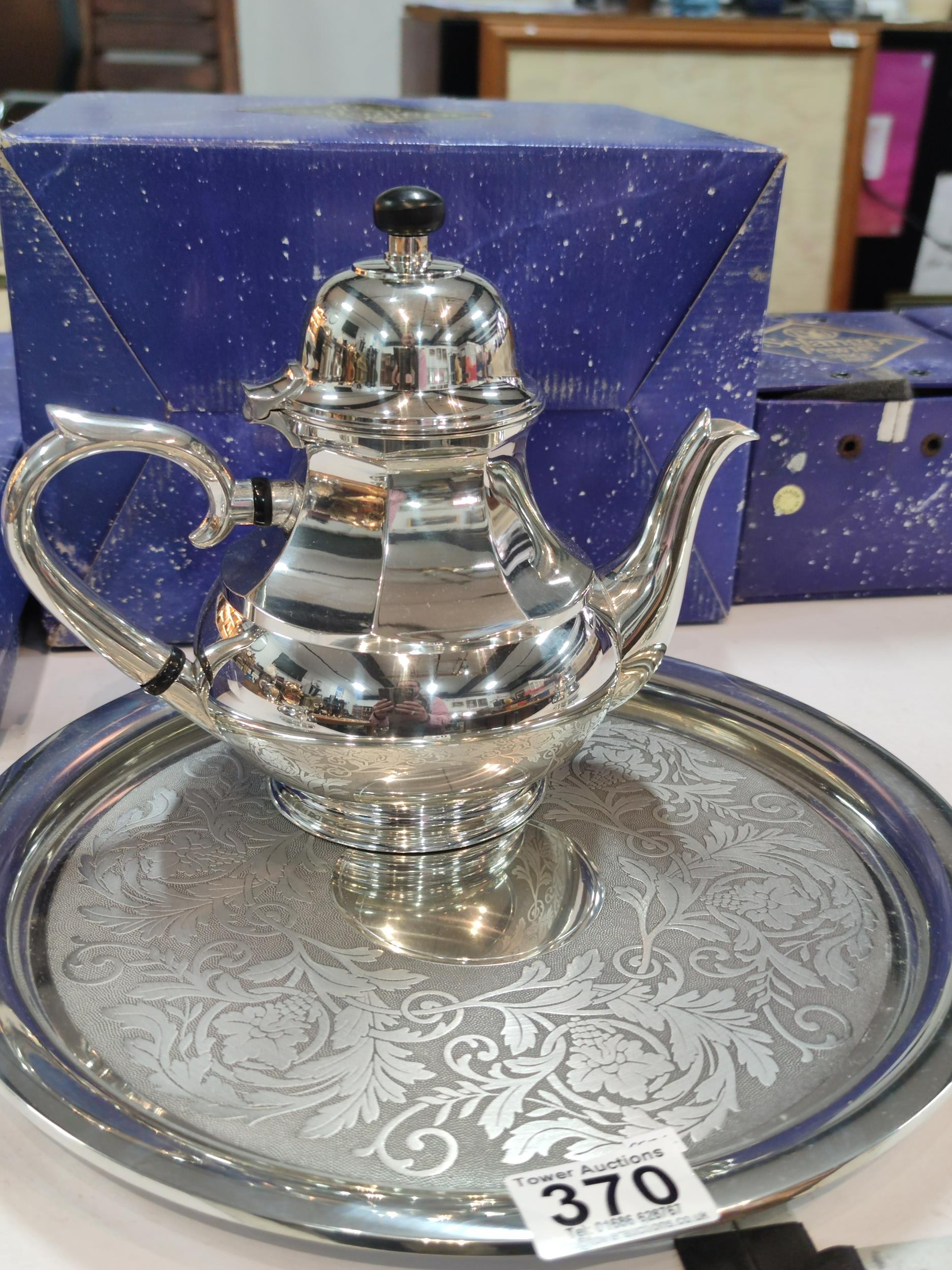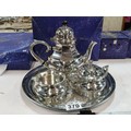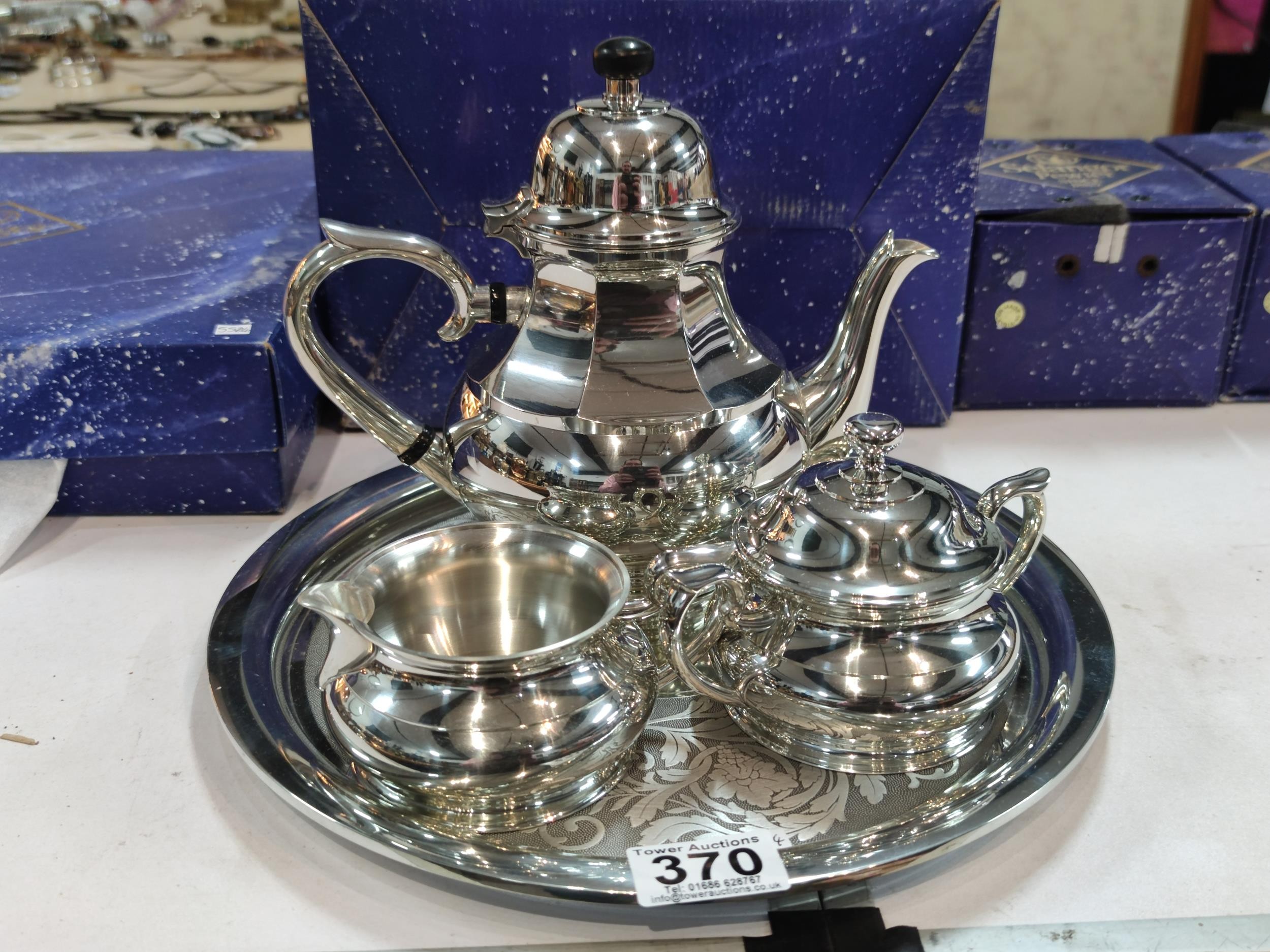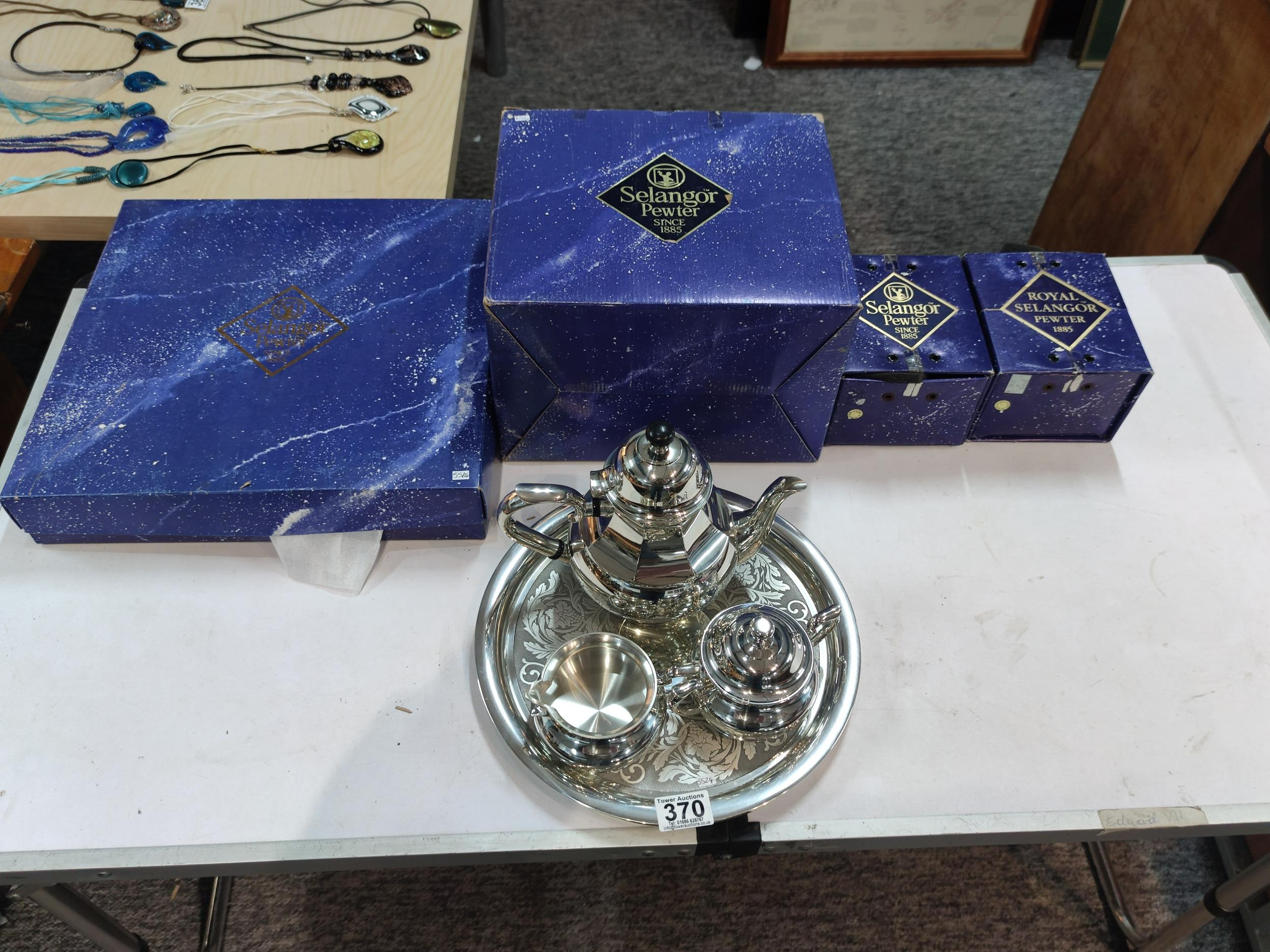 A complete Royal Selangor hand finished pewter teaset consisting of teapot, milk jug, sugar bowl and tray. Each piece is marked to the base Royal Selangor, complete with original boxes. The largest piece stands art 22cm high.