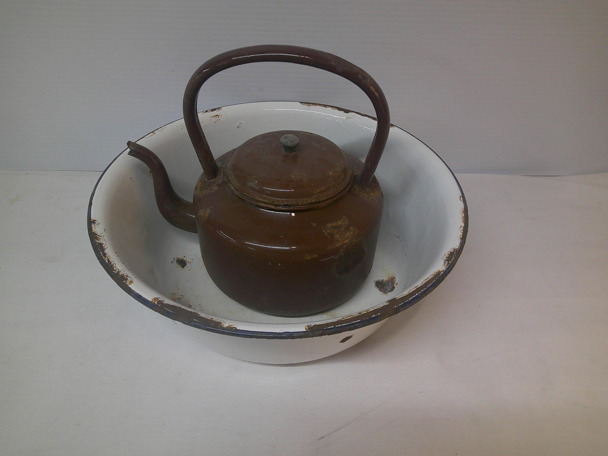 Large enamel basin 46cmD & large enamel kettle