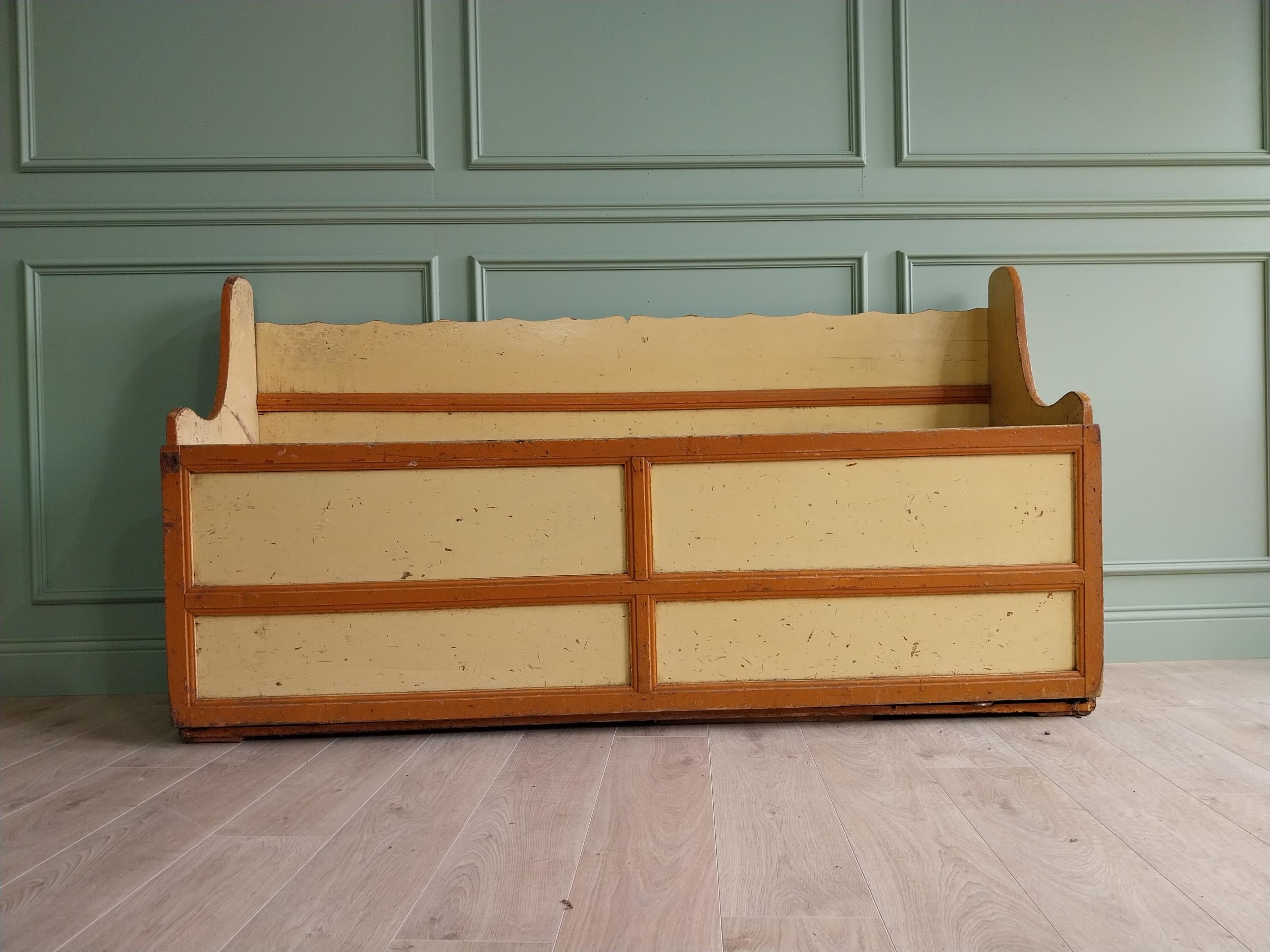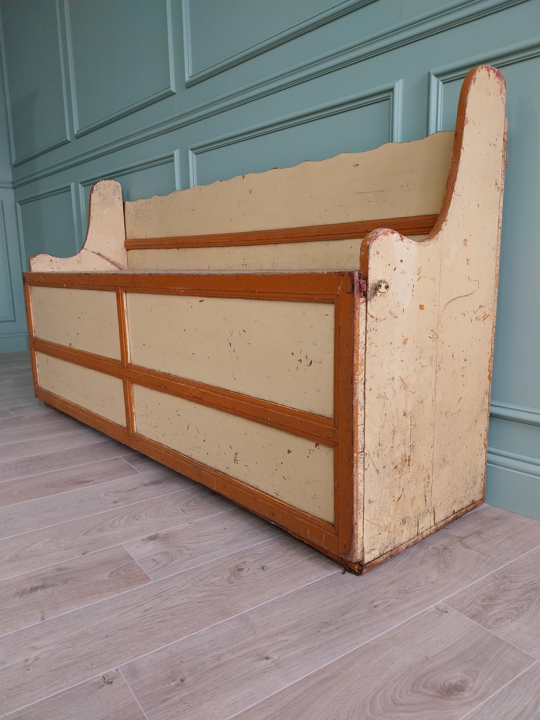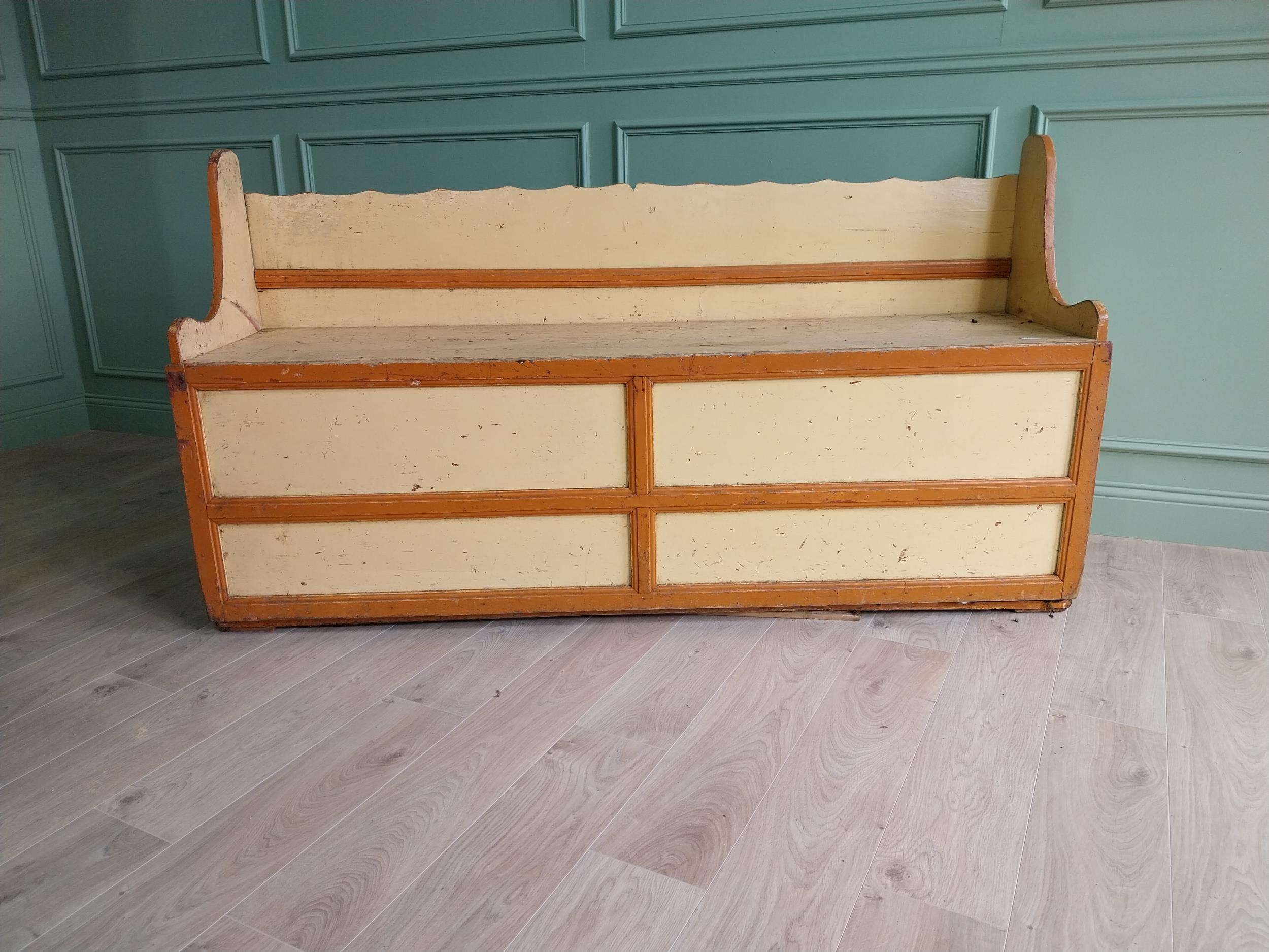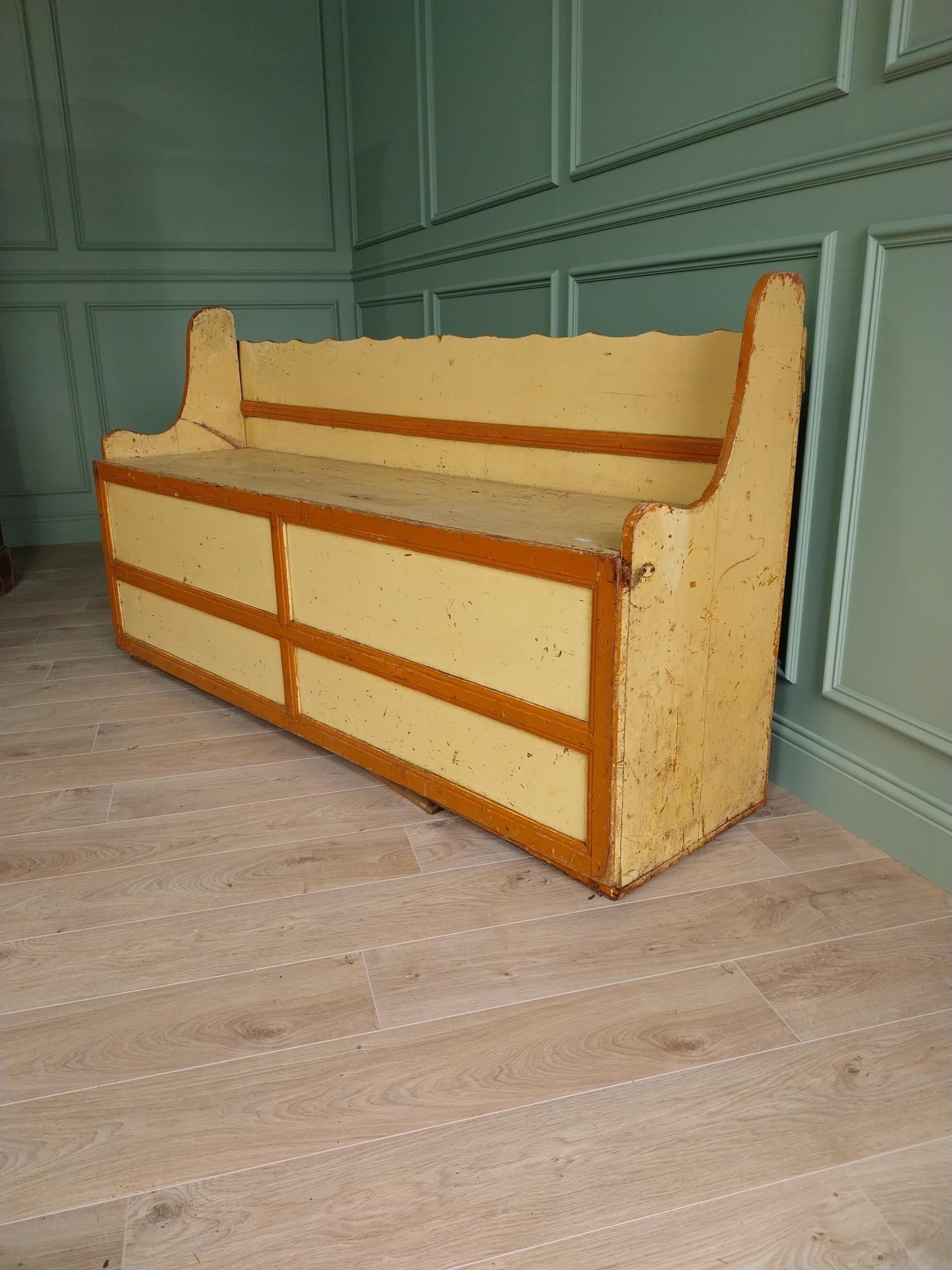 19th C. North of Ireland painted pine settle bench with original paint. {102 cm H x 188 cm W x 52 cm D}. U