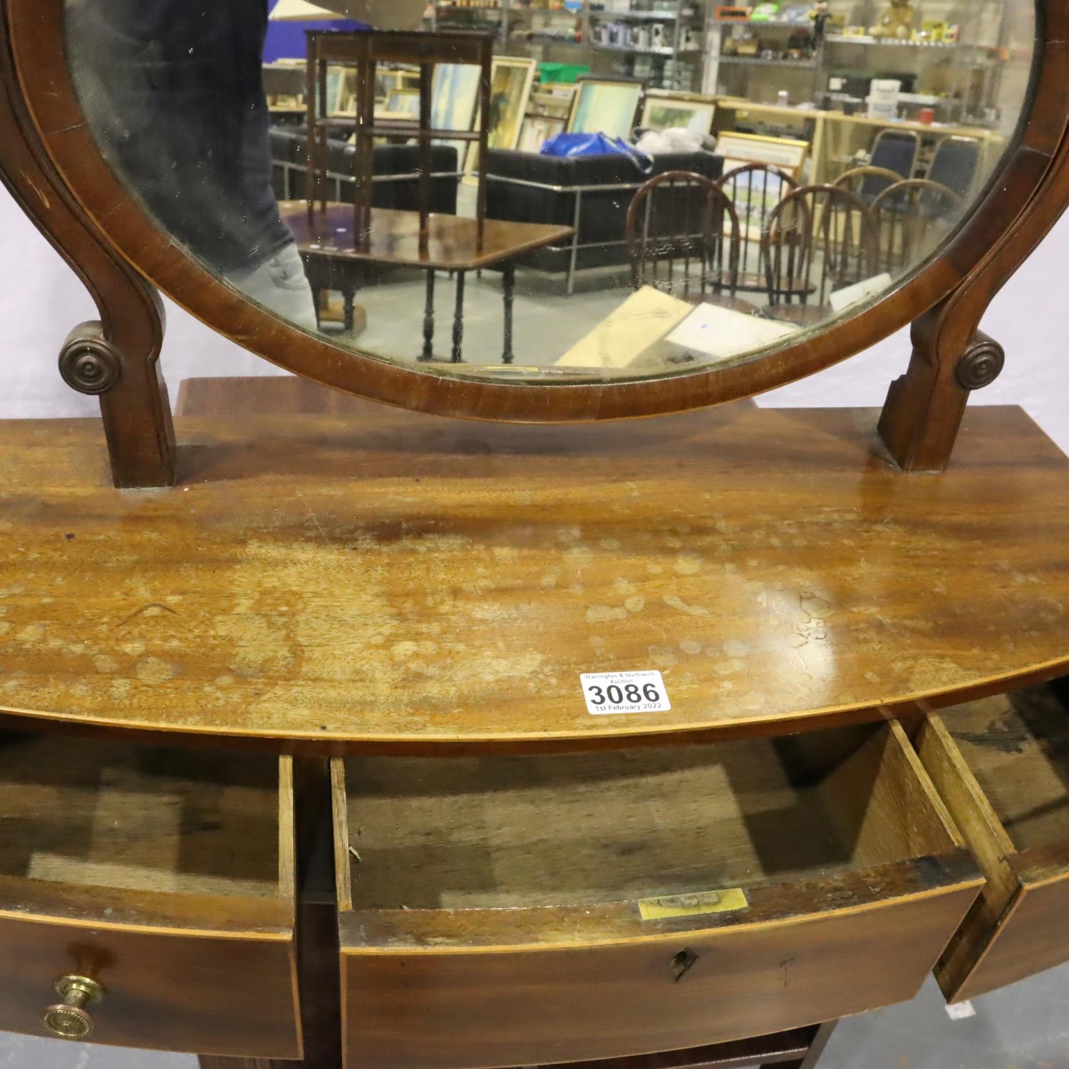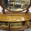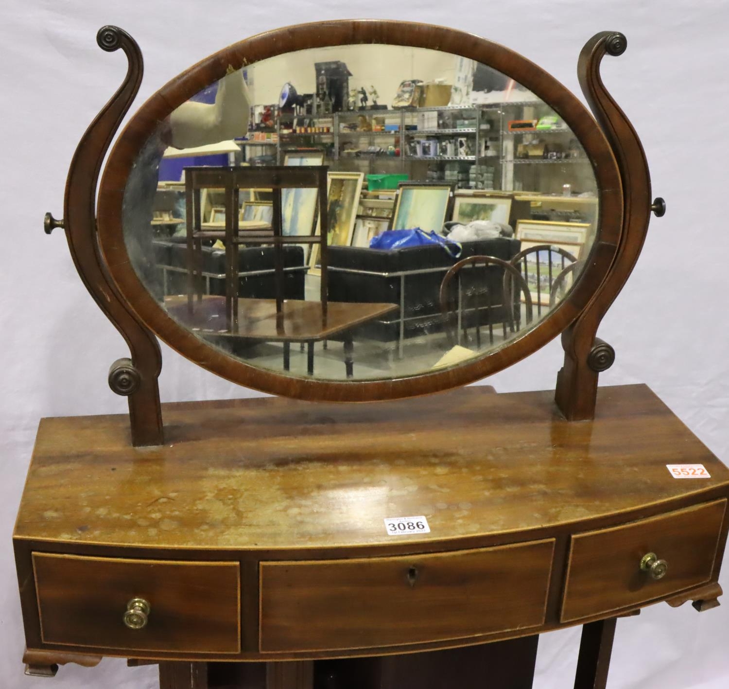 George III oval toilet swing mirror raised on a bow front three drawer support, 69 x 27 x 60 cm H.