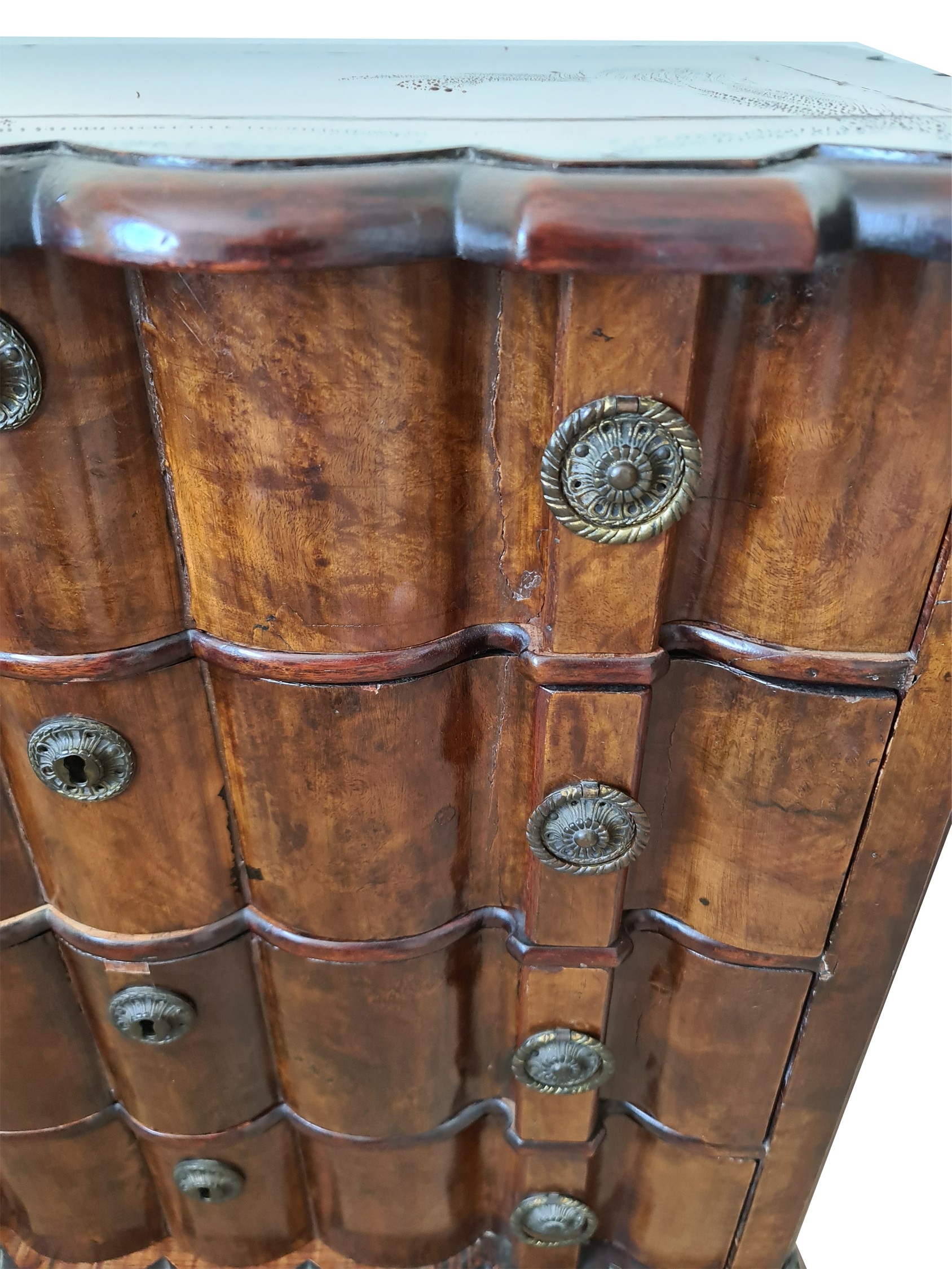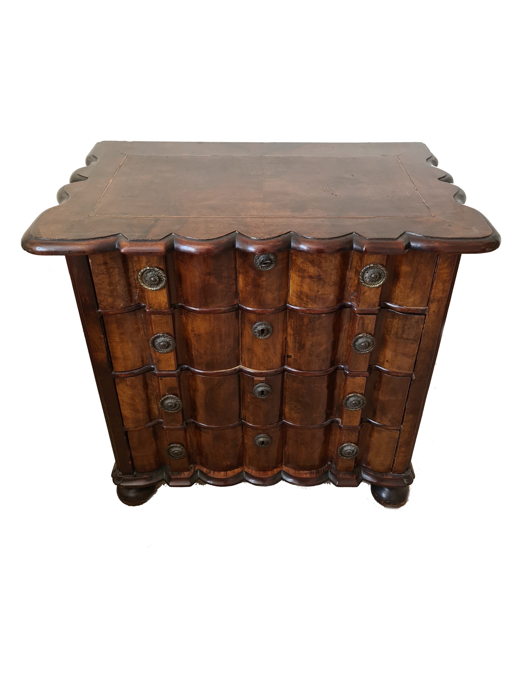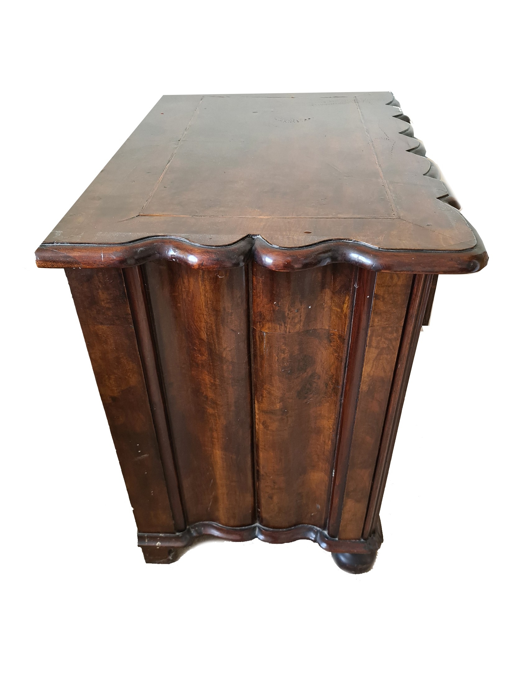 Antique Dutch Serpentine Fronted Set of Drawers. Bun feet at front. Great veneer. Measures 33 inches wide, 21 inches deep and 31 inches tall. Shipping is available. Please ask for a quote before bidding. Where possible we combine shipping costs. Remember, if you are the highest bidder above reserve on this Lot you have bought the item and are legally responsible for the item. Viewing is recommended in either person or via video link. Contact us to arrange.