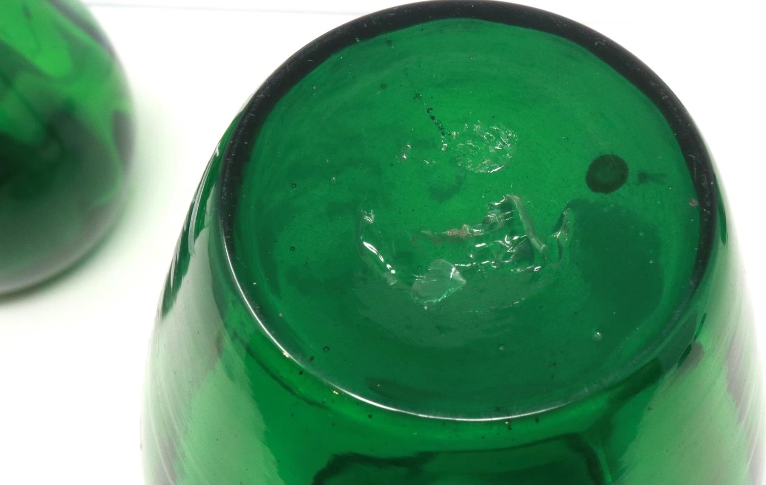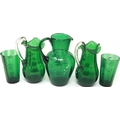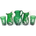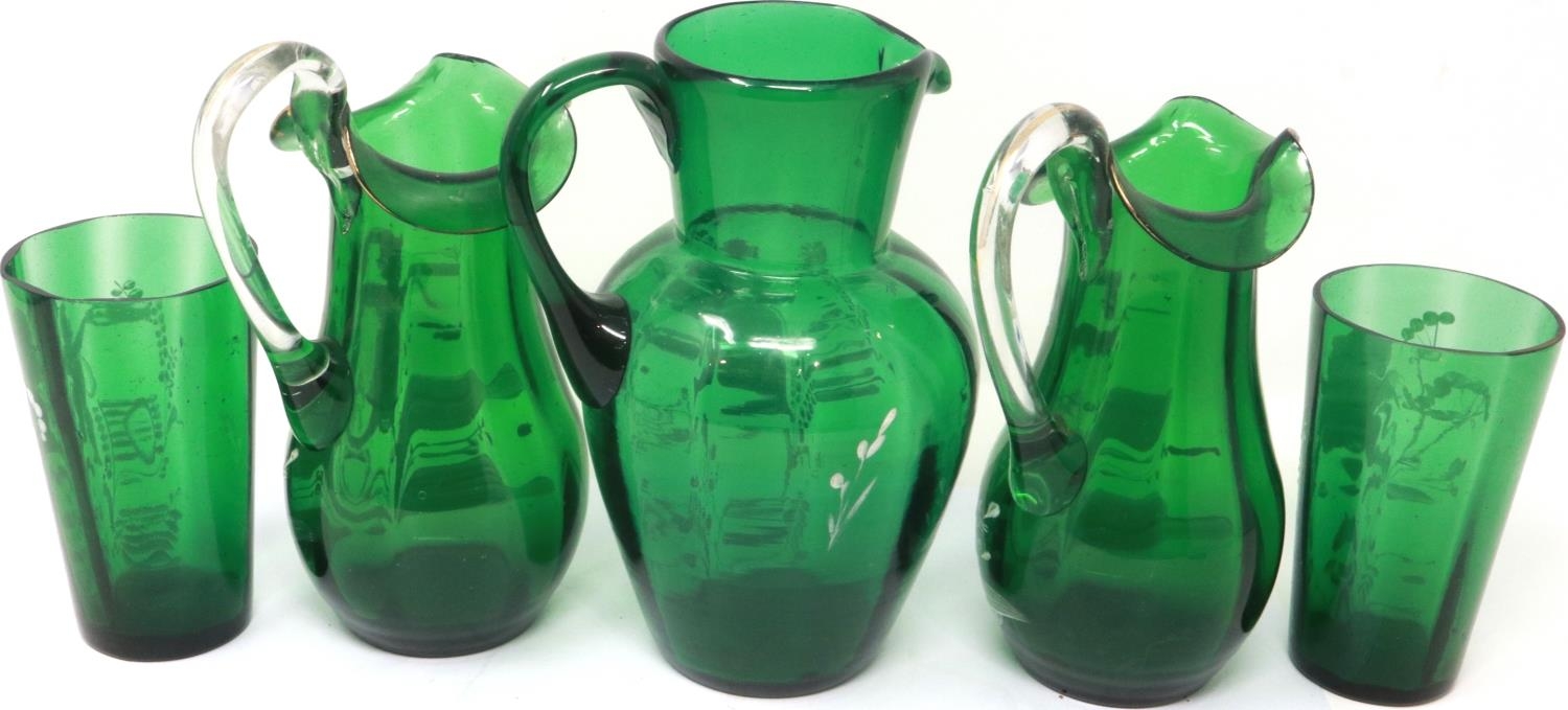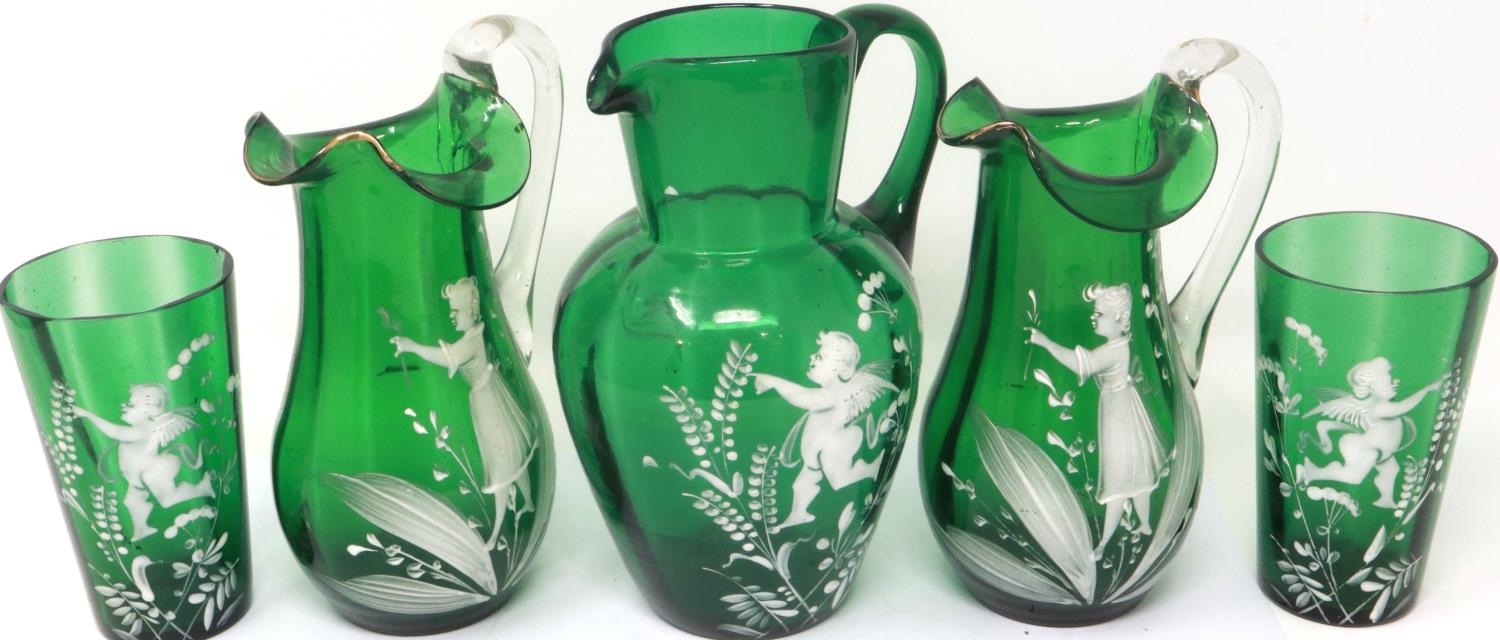 Five pieces of Mary Gregory glass including a jug decorated with enamelled cherubs, largest H: 17 cm. Chip to rims of the pair of jugs, all pieces have fleabites otherwise good condition. P&P Group 3 (£25+VAT for the first lot and £5+VAT for subsequent lots)