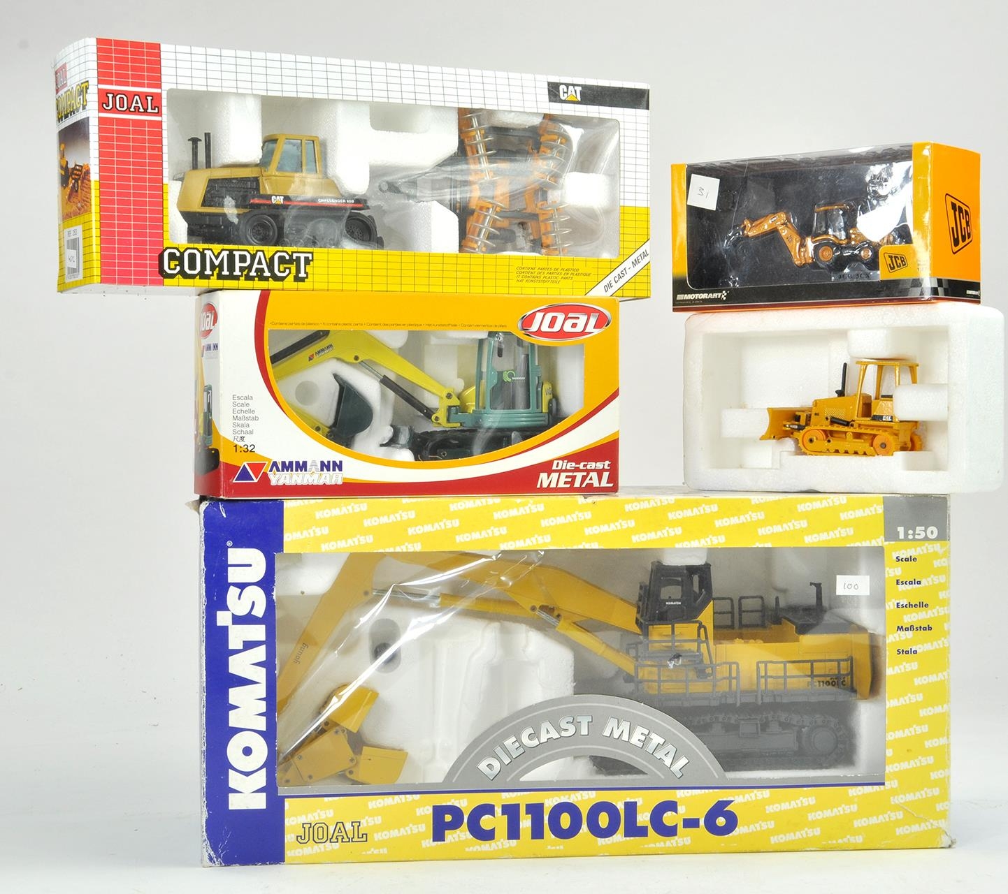 A selection of boxed farm and construction issues from Joal and Motorart including Komatsu PC1100LC-6 Excavator, CAT Crawler tractor with attachment and others. Appear excellent and mostly boxed.