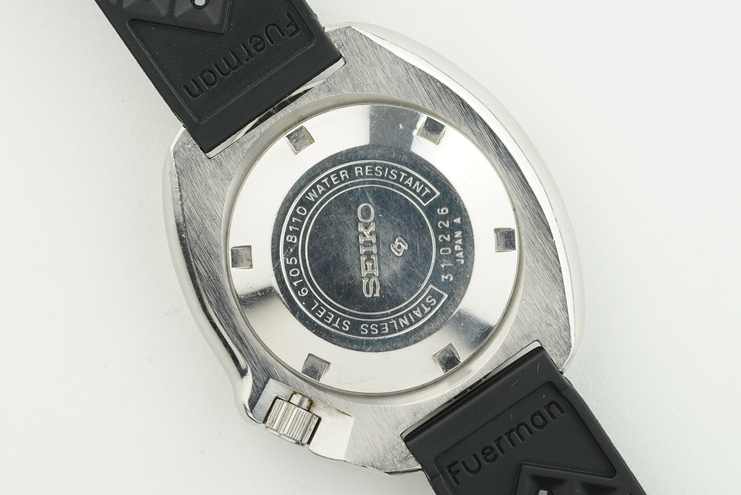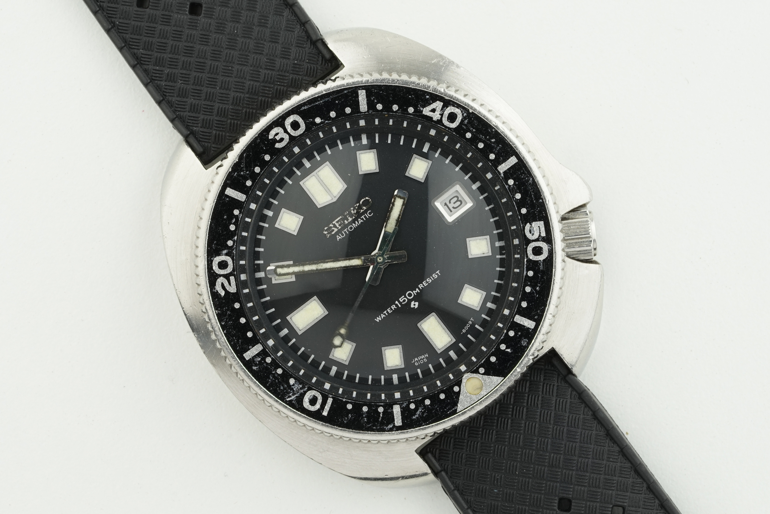 SEIKO 'CAPTAIN WILLARD' APOCALYPSE NOW AUTOMATIC DIVERS REF. 6105-8110 CIRCA 1973, circular black dial with hour markers and hands, 44mm stainless steel case with a crown and case back, inside is an automatic movement, on a rubber strap, watch is currently running.