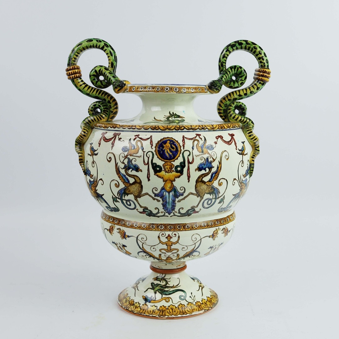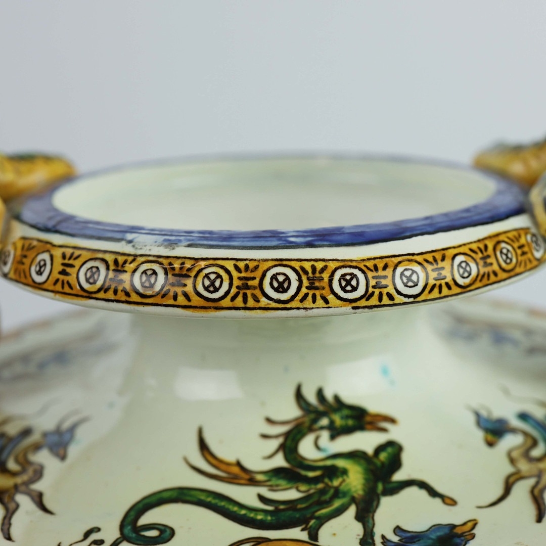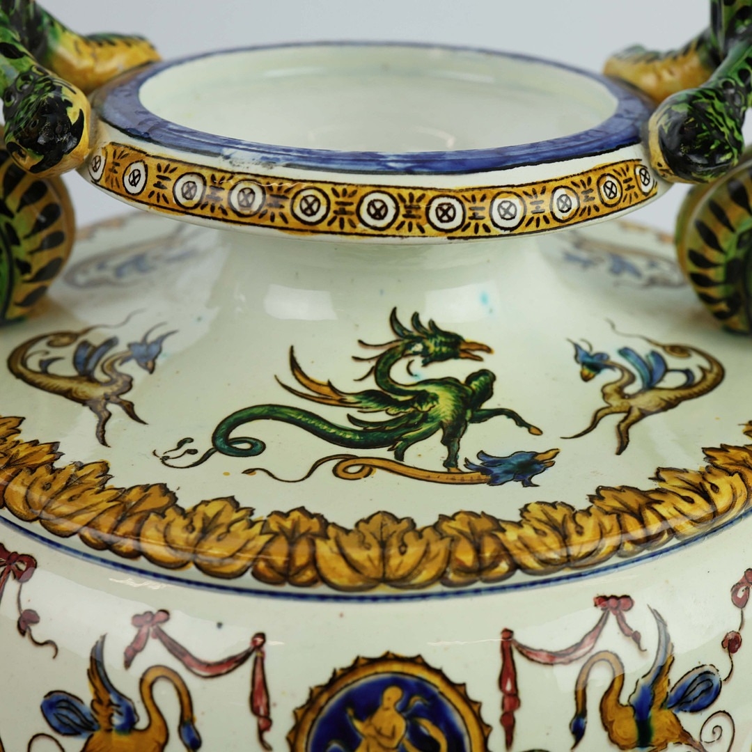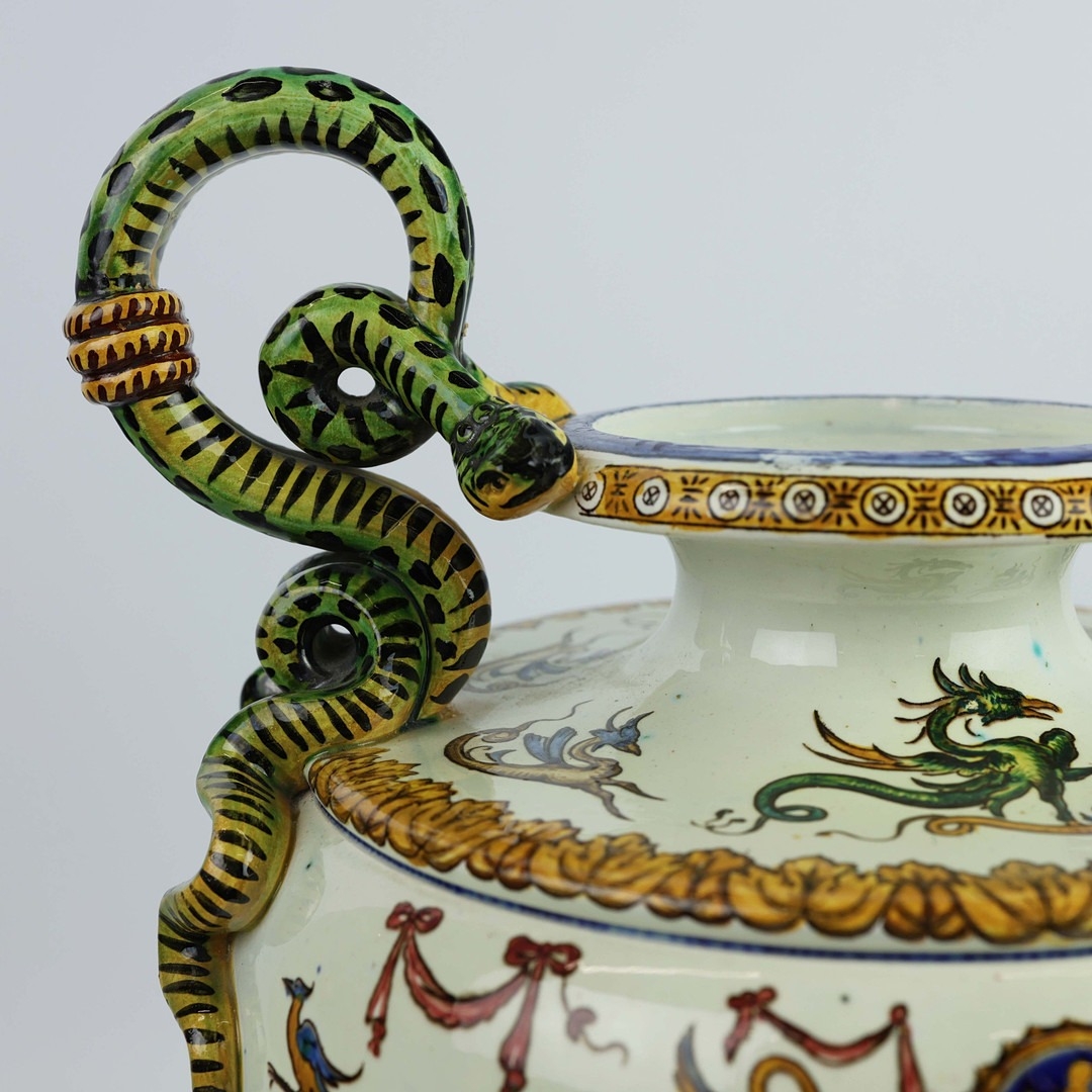 A GIEN FAIENCE TWIN HANDLED VASE. late 19th century, hand painted with snakes and dragons, grotesque figures, 38cm high, 28cm across.