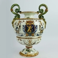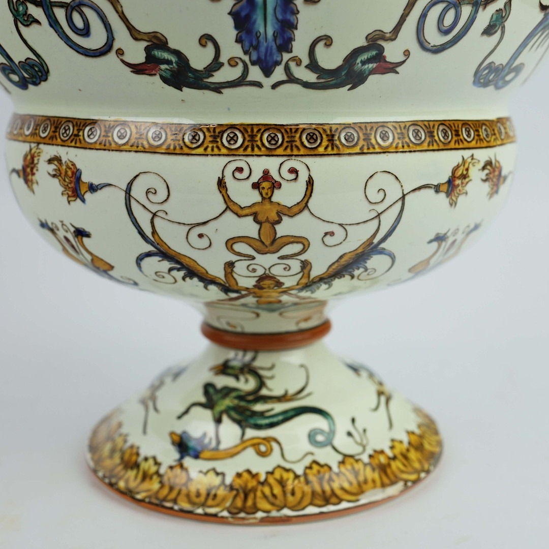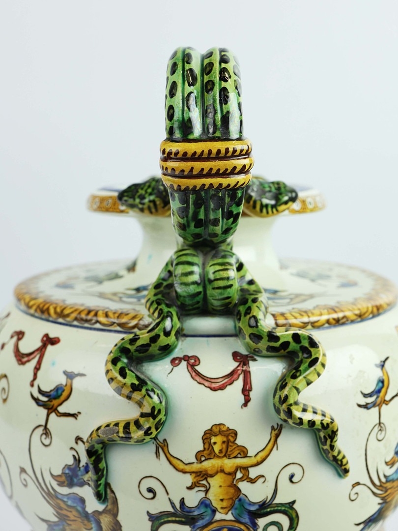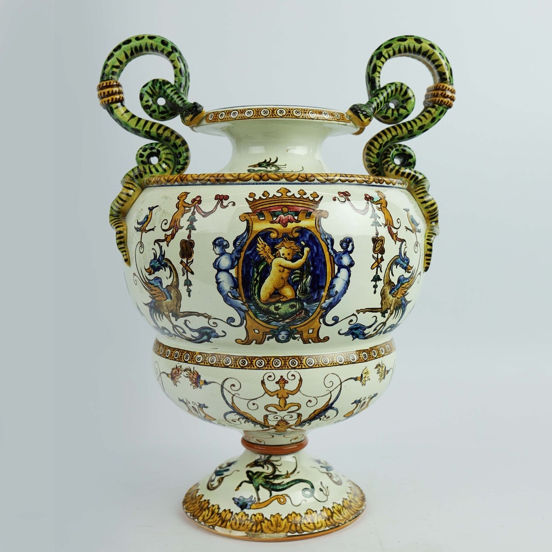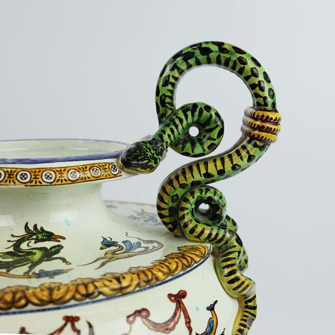 A GIEN FAIENCE TWIN HANDLED VASE. late 19th century, hand painted with snakes and dragons, grotesque figures, 38cm high, 28cm across.