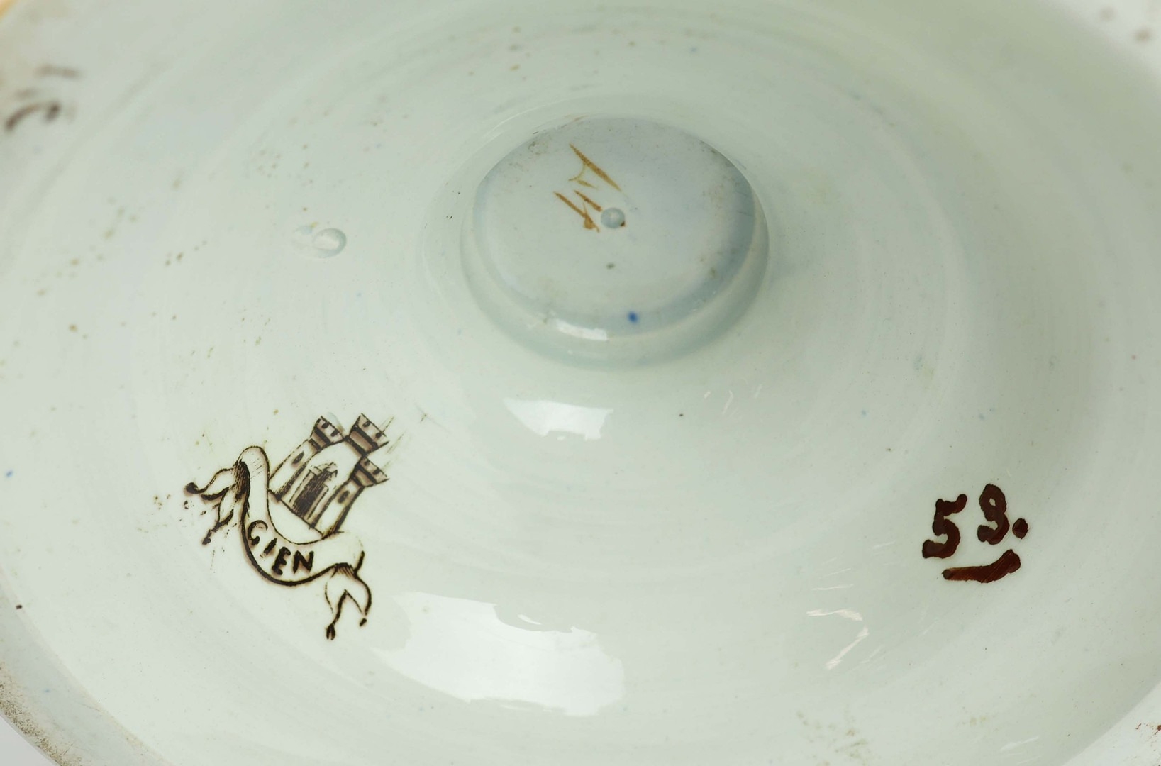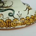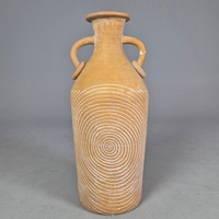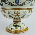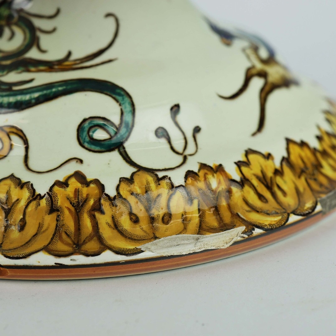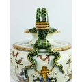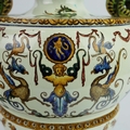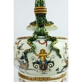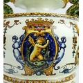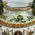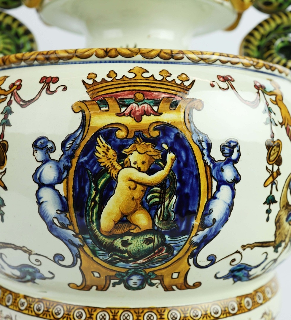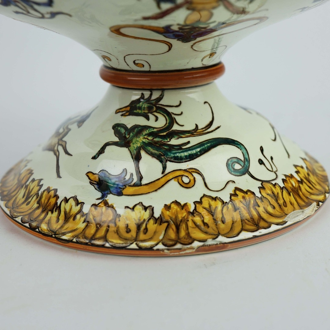 A GIEN FAIENCE TWIN HANDLED VASE. late 19th century, hand painted with snakes and dragons, grotesque figures, 38cm high, 28cm across.