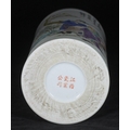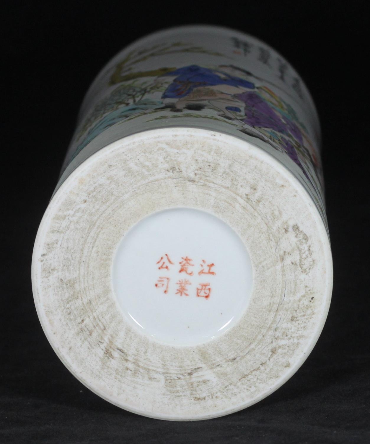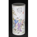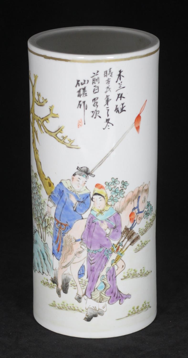 A 20th century Chinese pottery cylindrical poem vase, painted with a scene of a huntress holding a bow and quiver, a man with spear and a horse amongst flowers and trees to a white ground, red character marks to base, approx. 28cm high