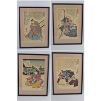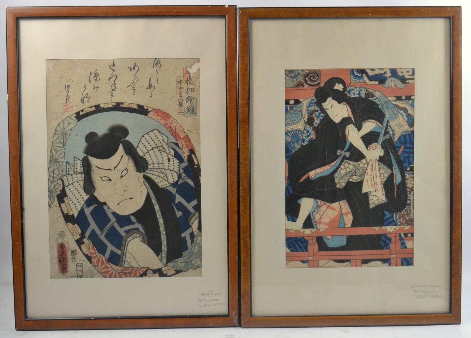 A pair of UNIQUE and RARE Japanese woodblock prints by two artists Ishukawa Goemon 21cm x 32cm and Koyarino Gonzo 24cm x 34cm by Toyokuni painted in 1850's subject depicting ferocious Japanese Lords in traditional dress