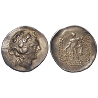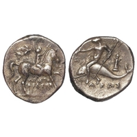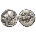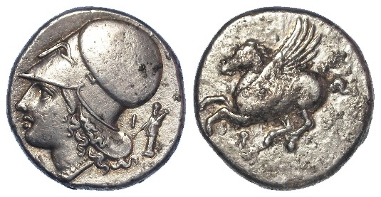 Ancient Greek: Corinth silver Stater 345-307 BC. Pegasos flying left. / Helmeted head of Athena left; (Δ)-I across field; to right, statue of Hermes holding caduceus and cornucopia. Pegasi 460; BMC Corinth 318. 8.29g. NVF/VF, rusty die or corrosion obv.