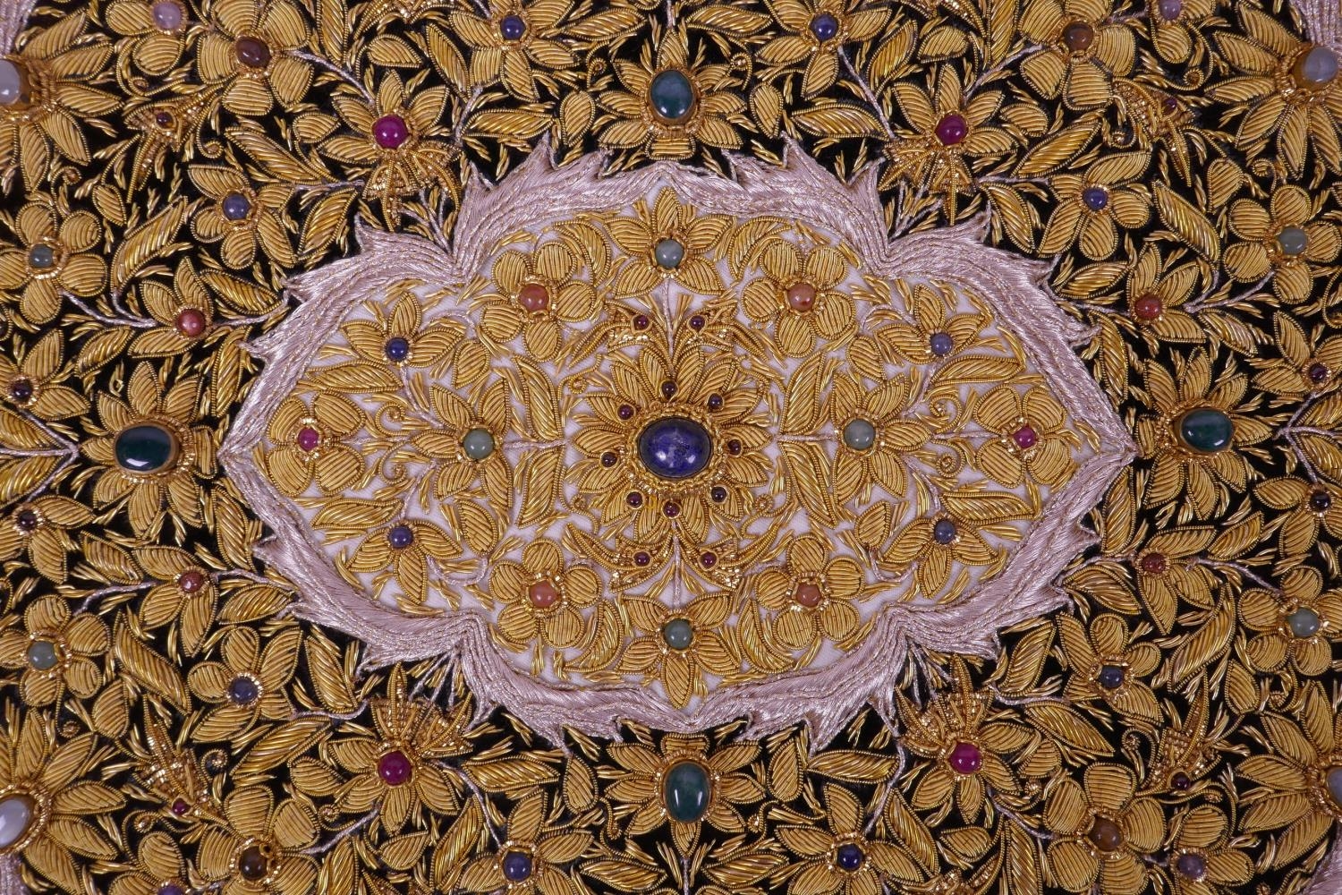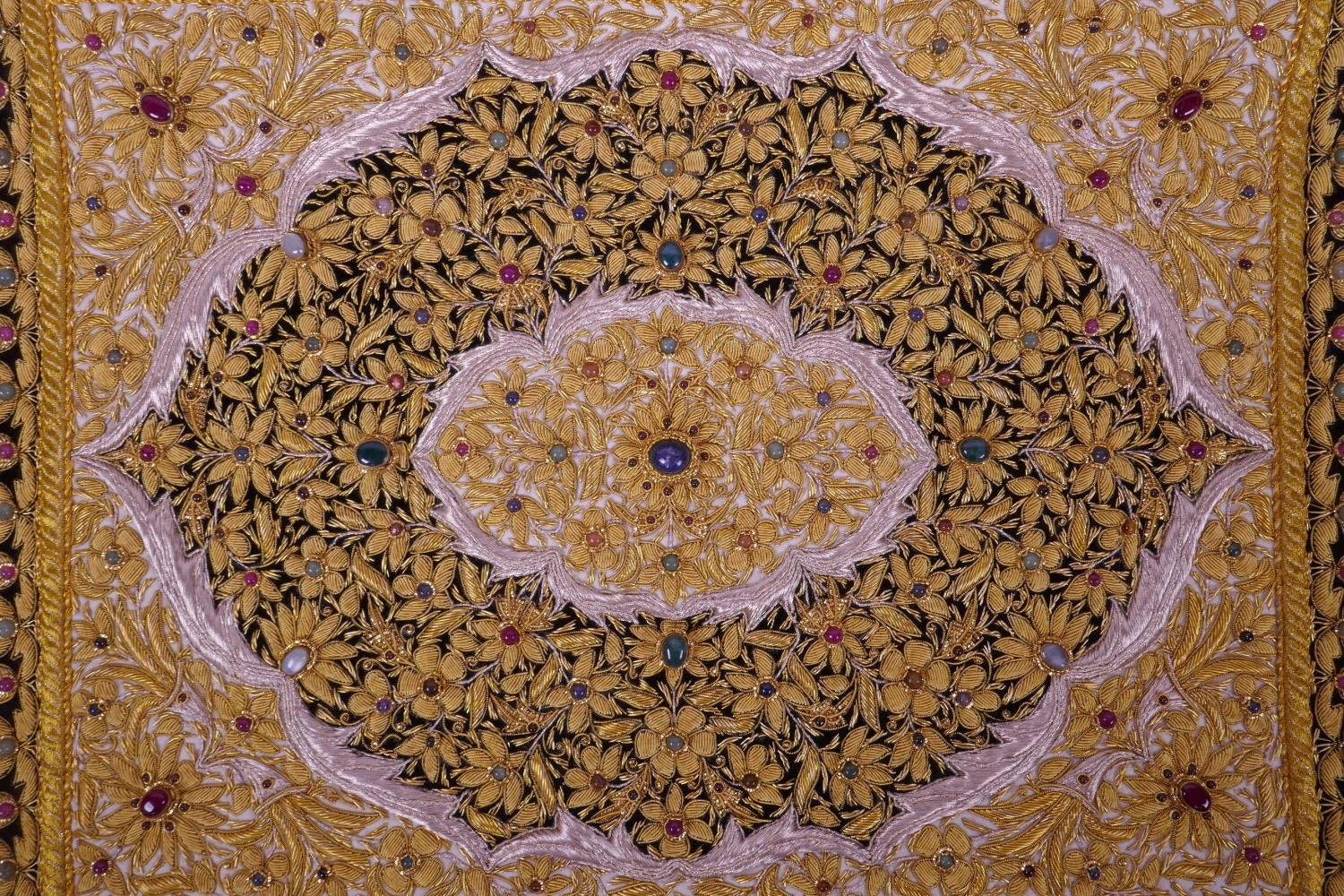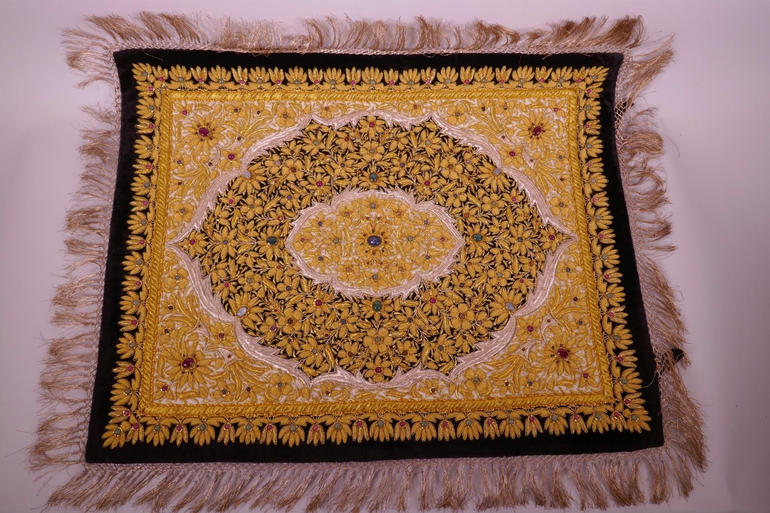 A mid C20th Indian gilt thread wall hanging with floral decoration inset with hardstones, 24" x 19"