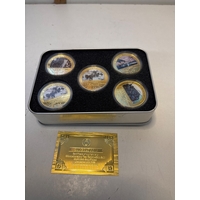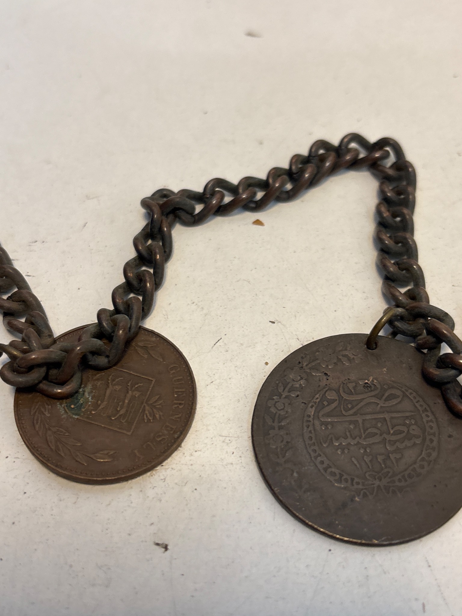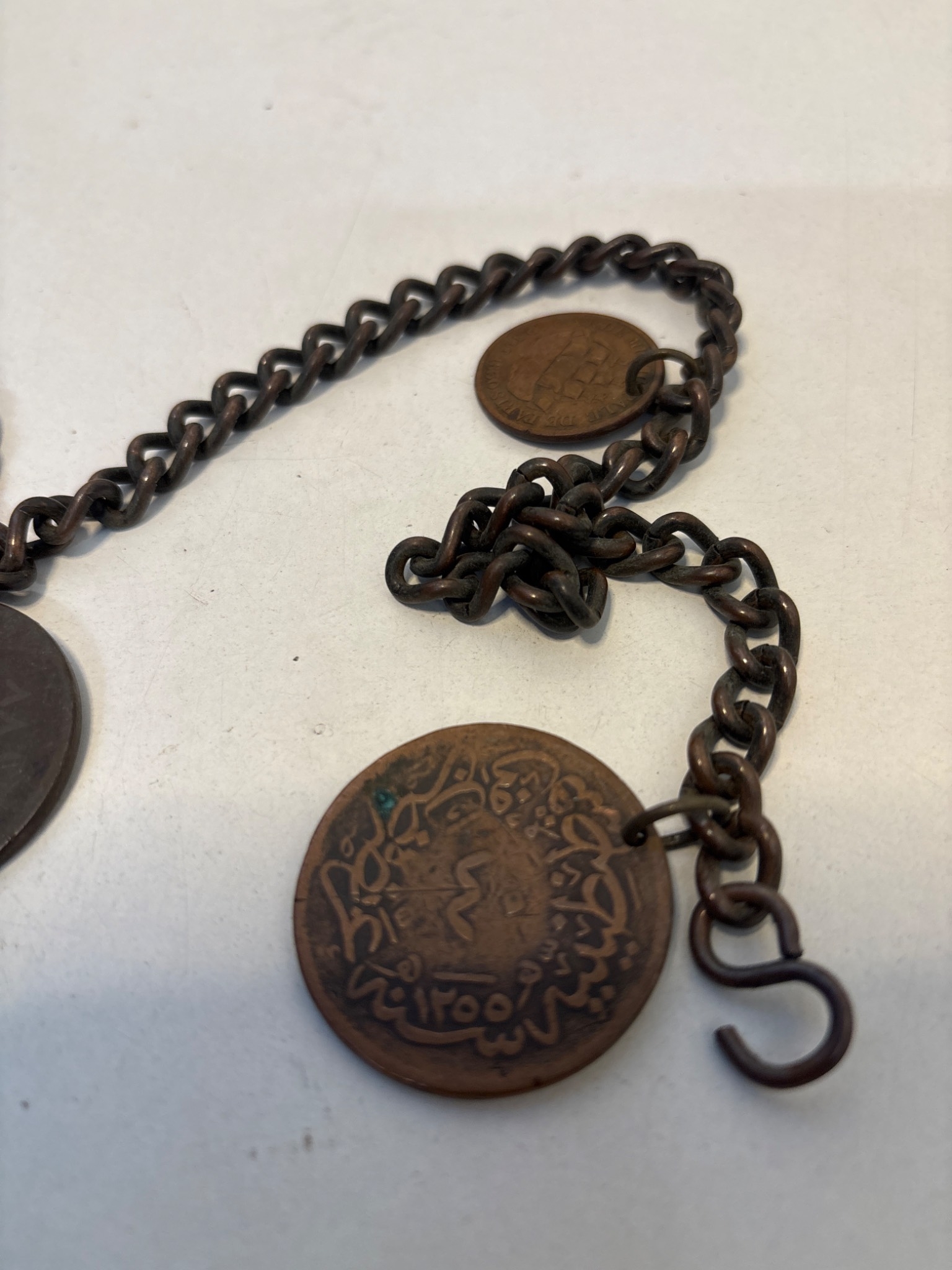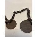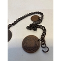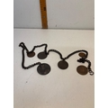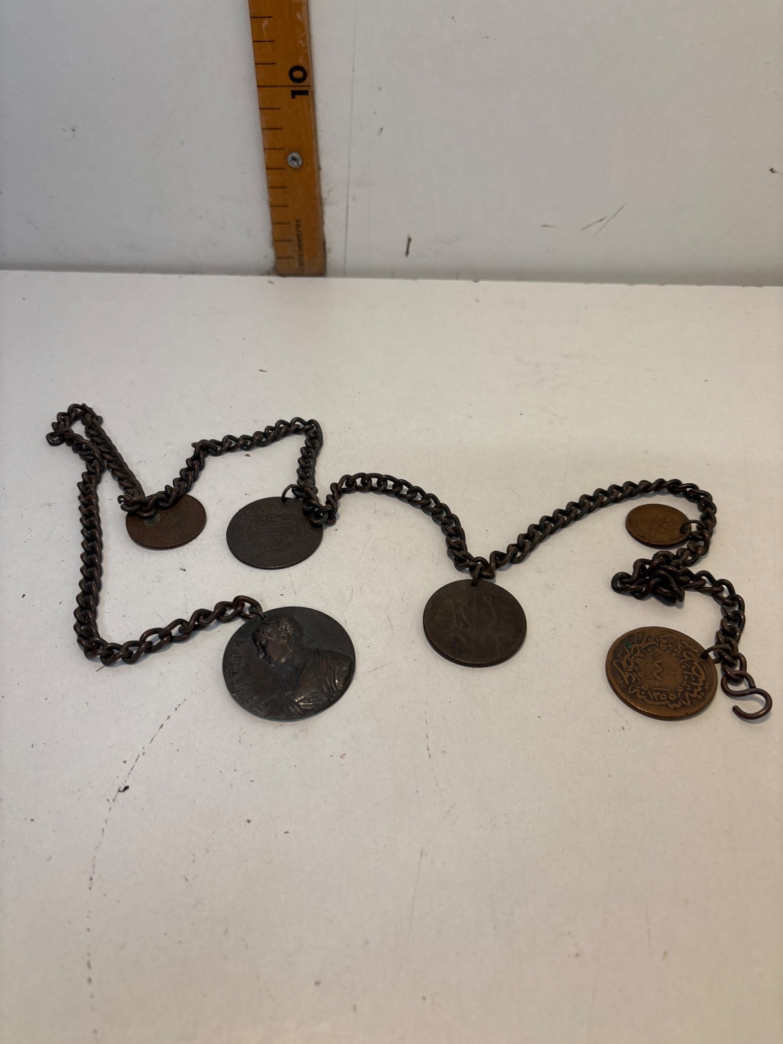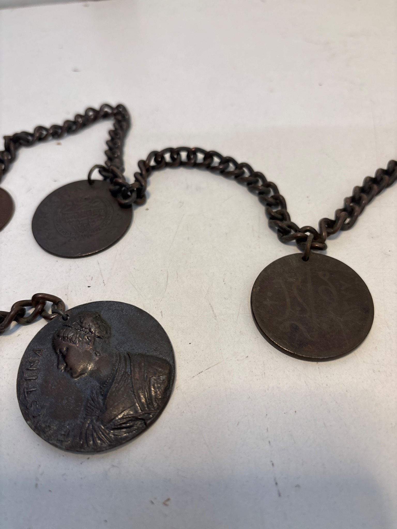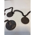 Chain with multiple bronze medallions featuring various engraved designs and inscriptions,