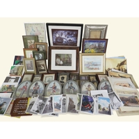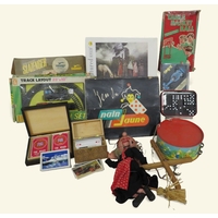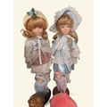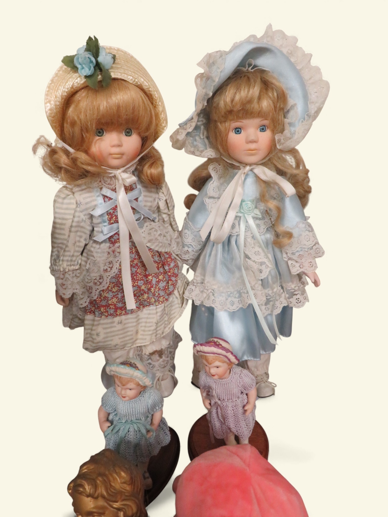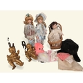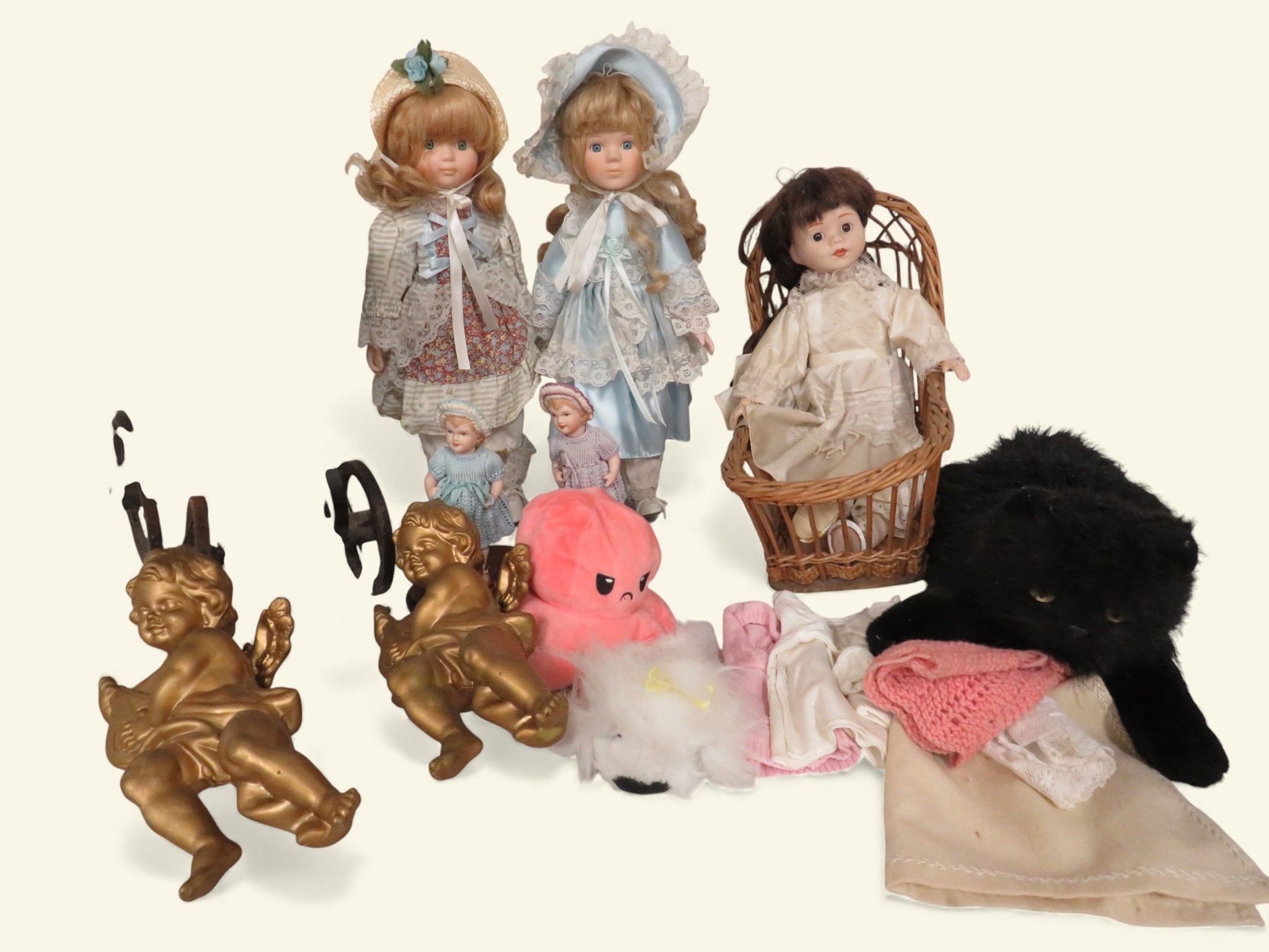 Collection of dolls and soft toys. Mixed lot comprising pair of porcelain dolls with blonde hair, blue eyes, and period costume including floral dresses and bonnets (approximately 12-14 inches tall), porcelain doll with dark hair seated in wicker chair wearing white period dress with lace trim, pair of small bisque or composition dolls in vintage clothing, pair of gilt metal or brass cherub figures showing classical putti forms, pink plush pig or piglet soft toy, large black plush poodle or similar dog with curly fur, plus collection of vintage doll clothing including knitted items, white garments, and accessories. Decorative dolls and toys from mid to late 20th century. Appealing lot for doll collectors.