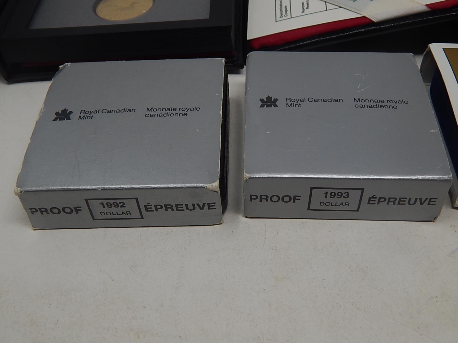 Canada Proof Set 1989 including .925 silver Dollar; Canada proof set 1990 including .925 silver Dollar; Canada proof set 1992 including .925 silver Dollar; Canada Proof Dollars 1992 (2) struck in .925 silver; 1993 struck in .925 silver (2) and 1994 Proof Dollar, all about as struck