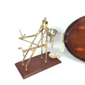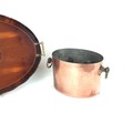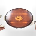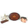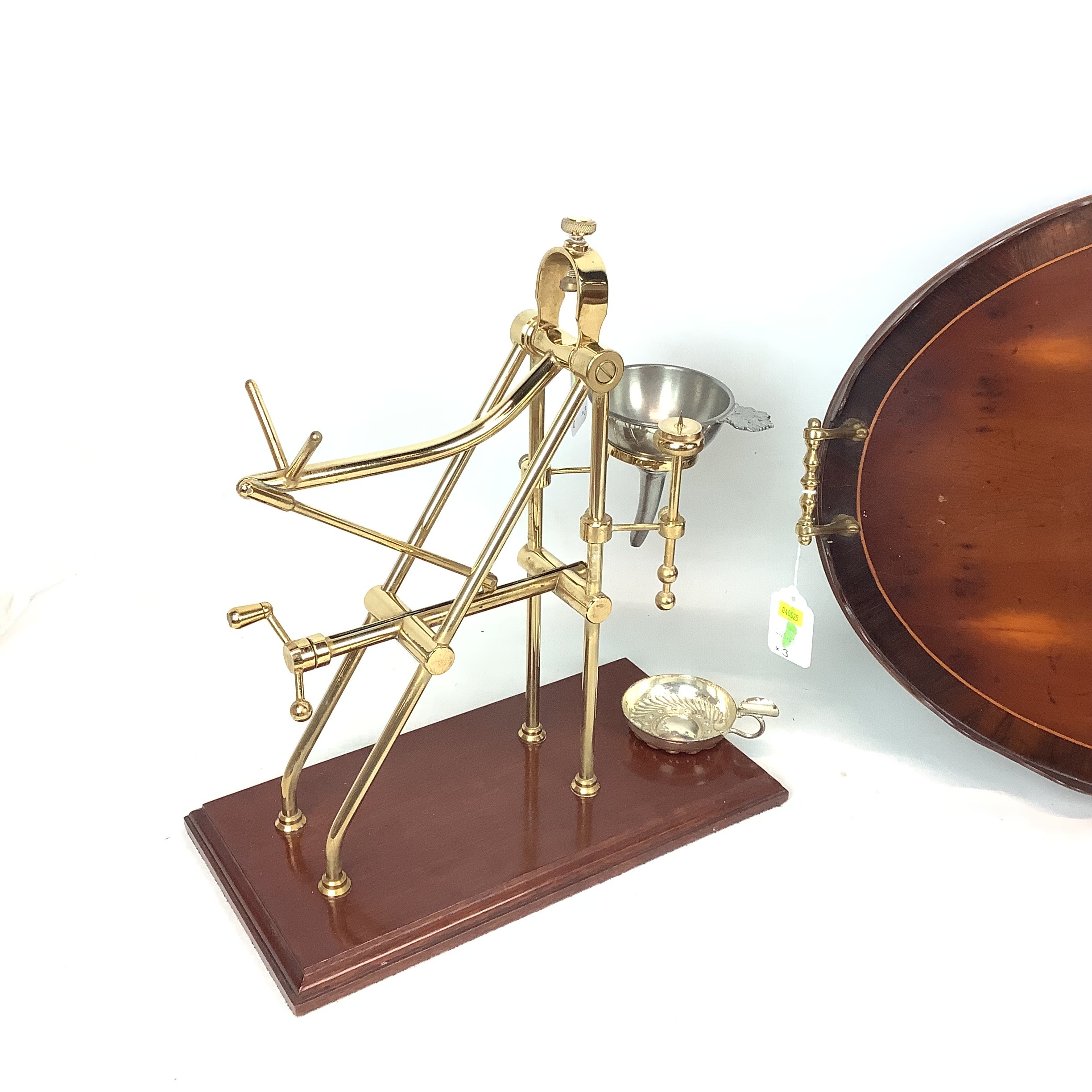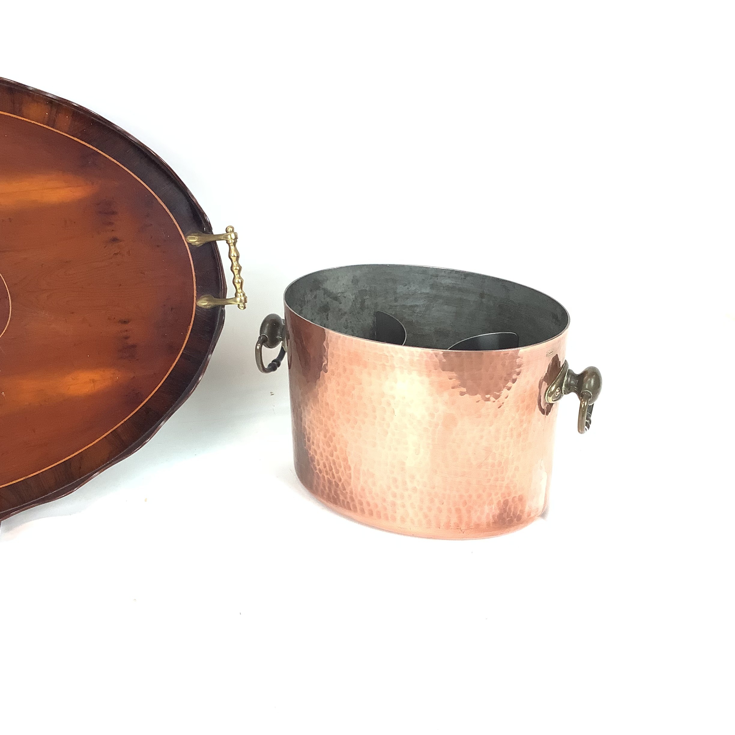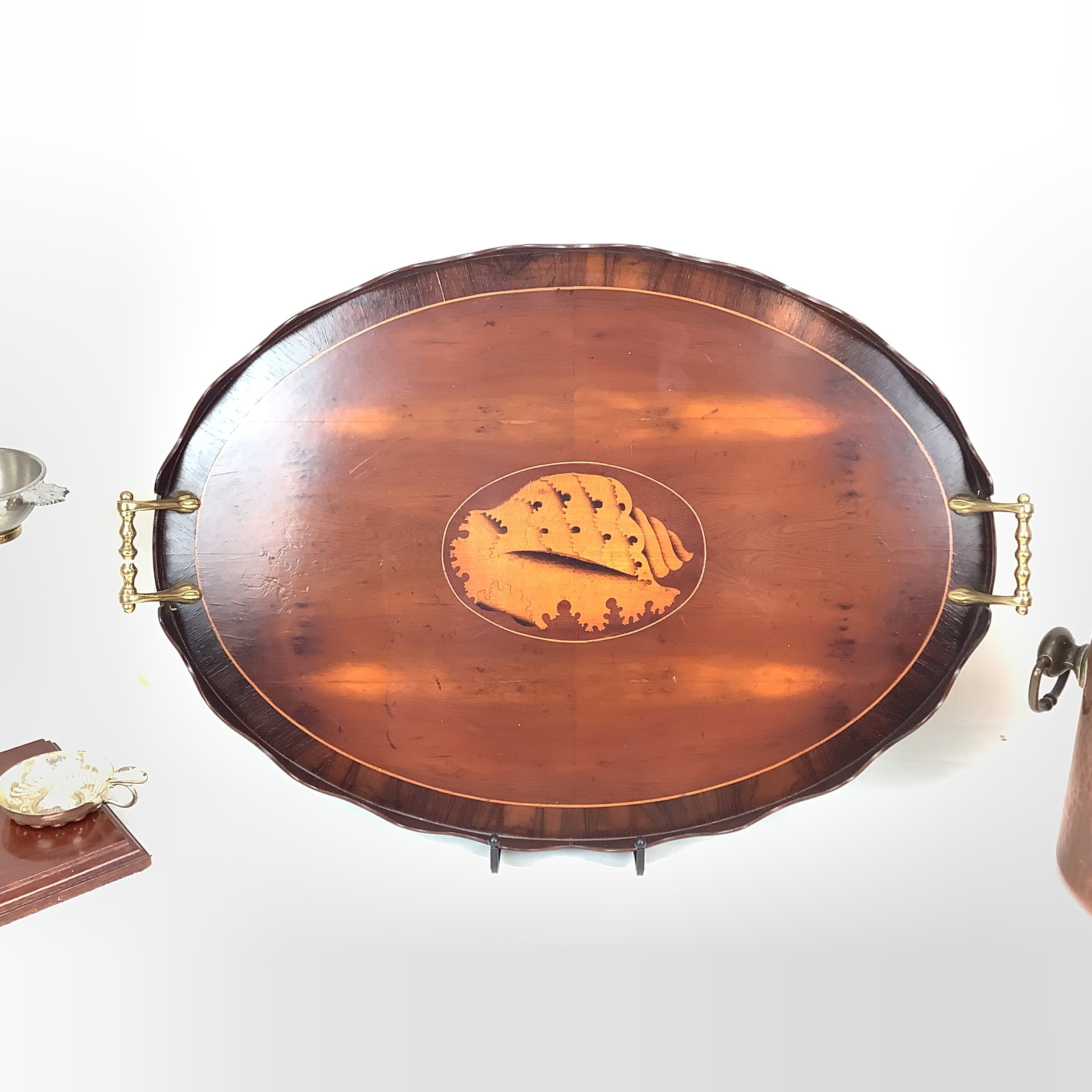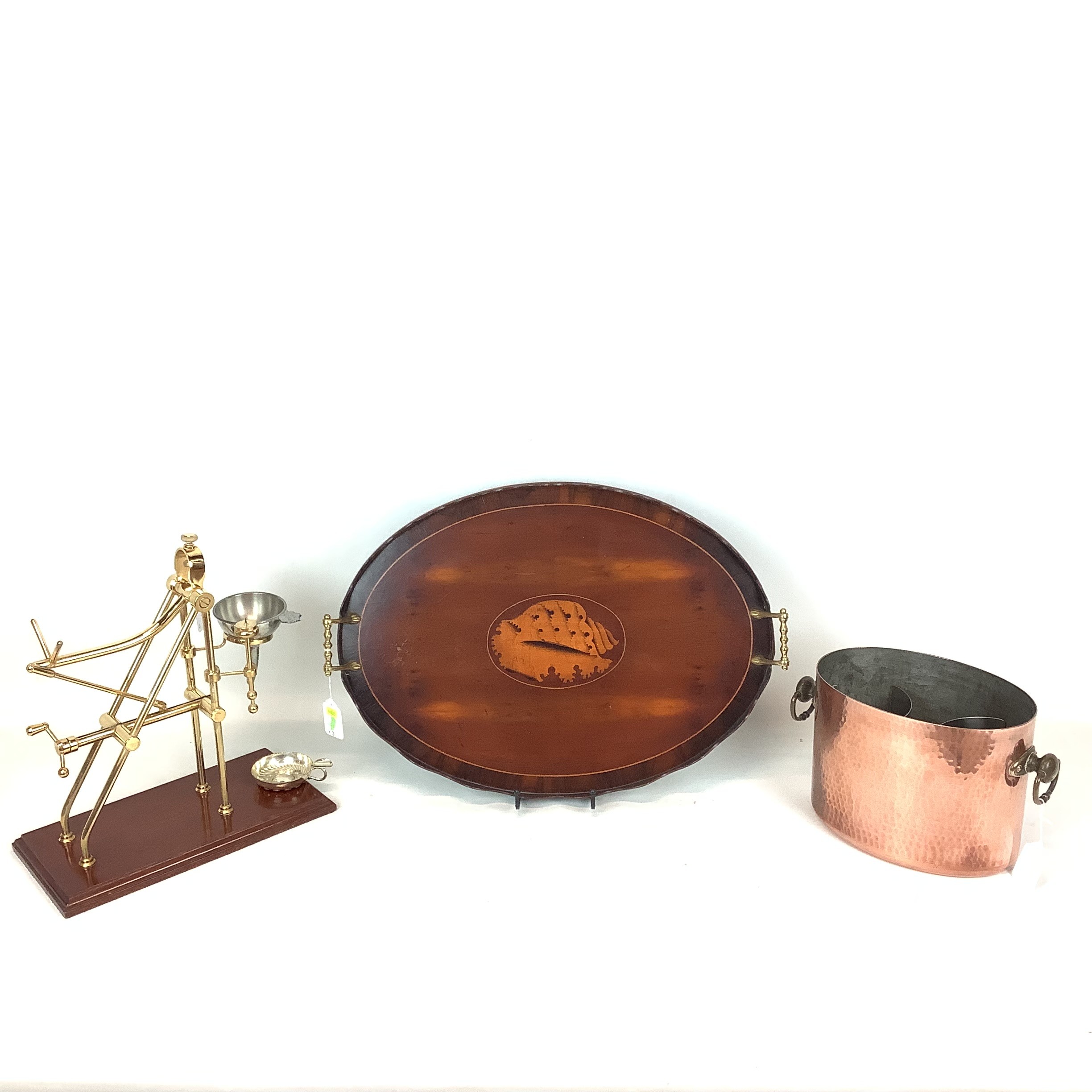 Inlaid yew oval twin handled tray with central shell cartouche, 59.5cm x 41cm. A brass decanting cradle mounted on a mahogany plinth, purchased from Harrods, and a French twin copper wine cooler.