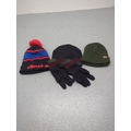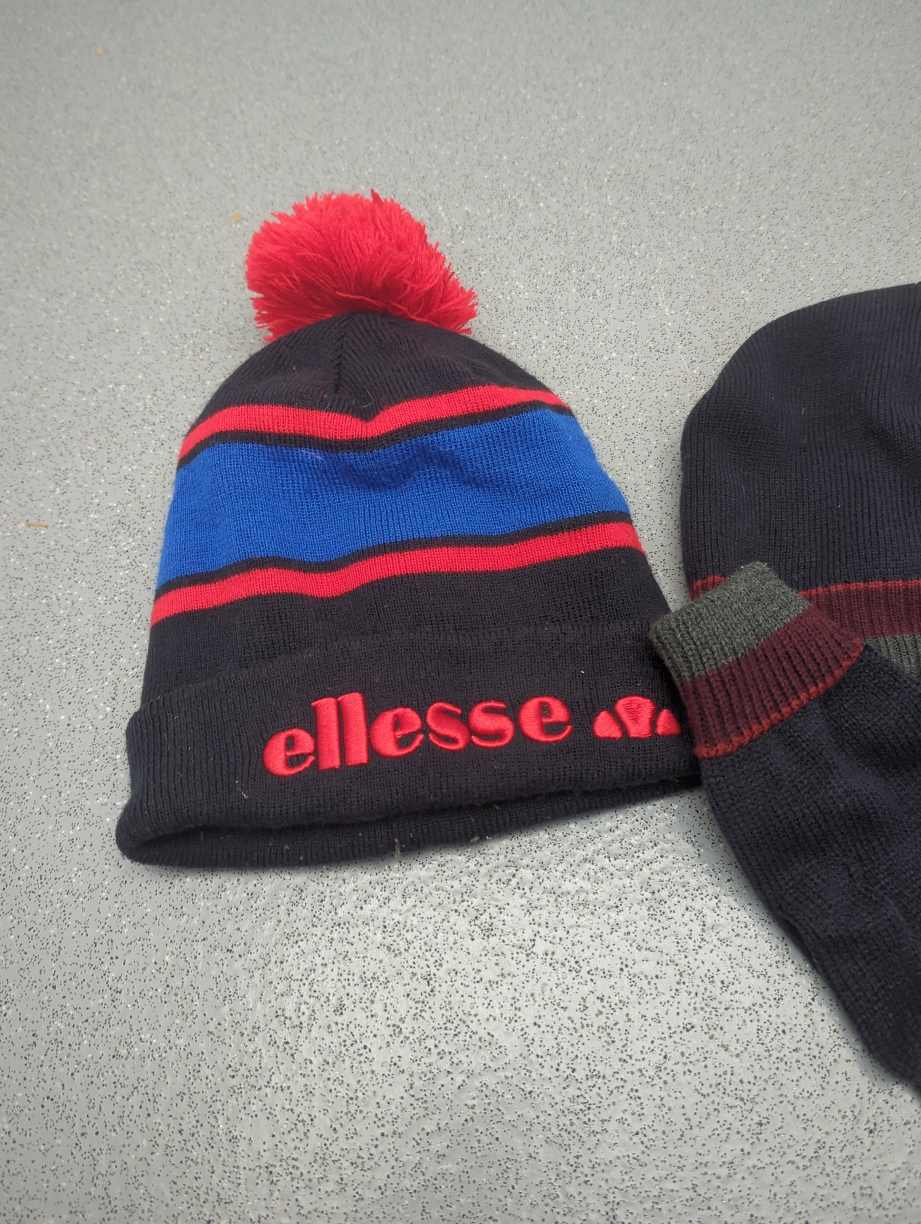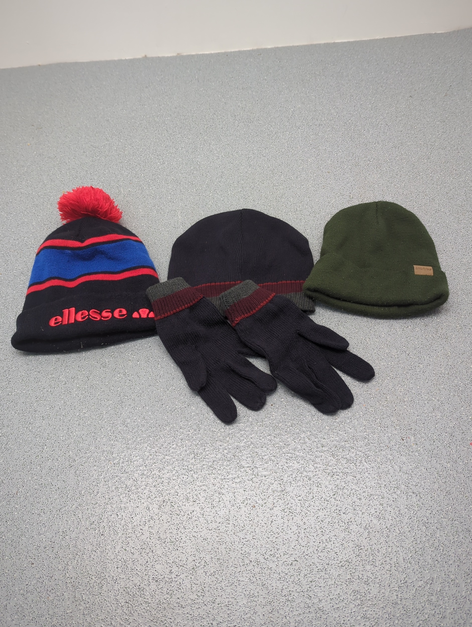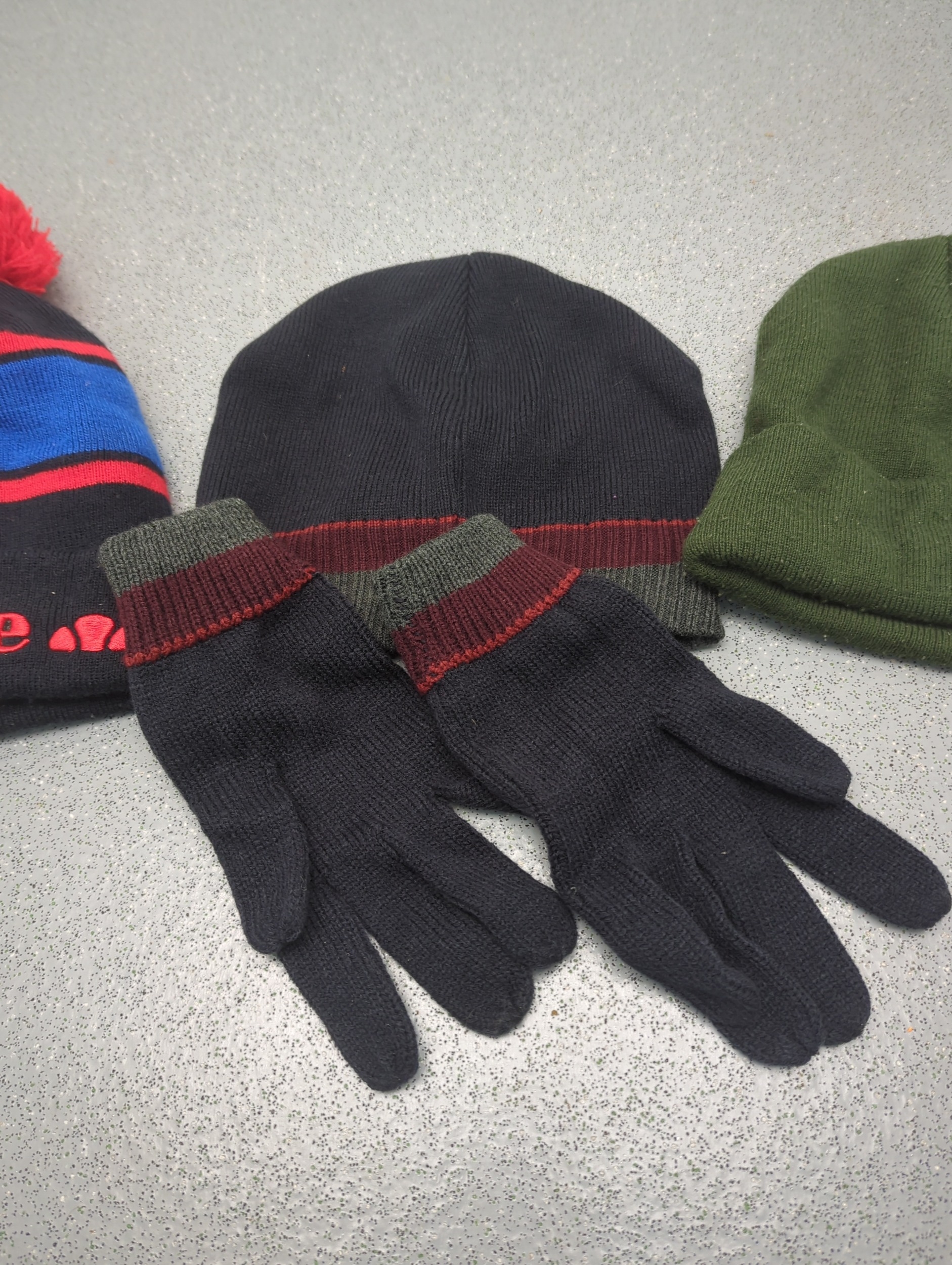 This lot includes a selection of winter hats and gloves, perfect for cold weather. The items consist of an Ellesse branded beanie, a plain green beanie with a visible label, and a pair of black gloves. Ideal for staying warm, these accessories offer both style and functionality.