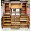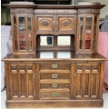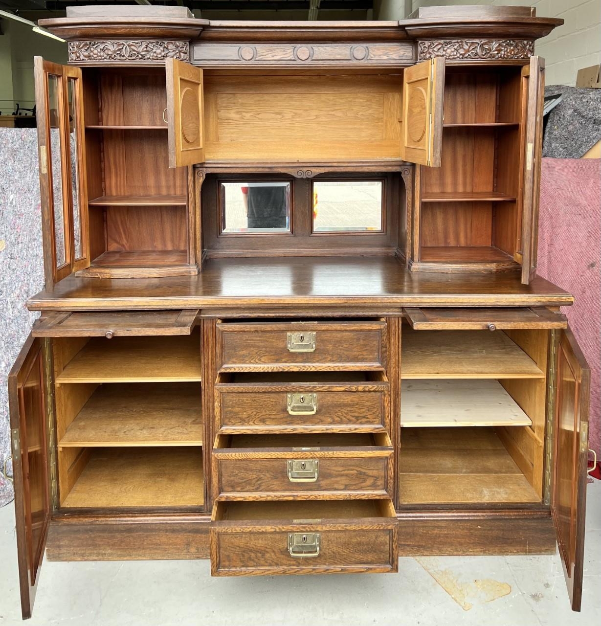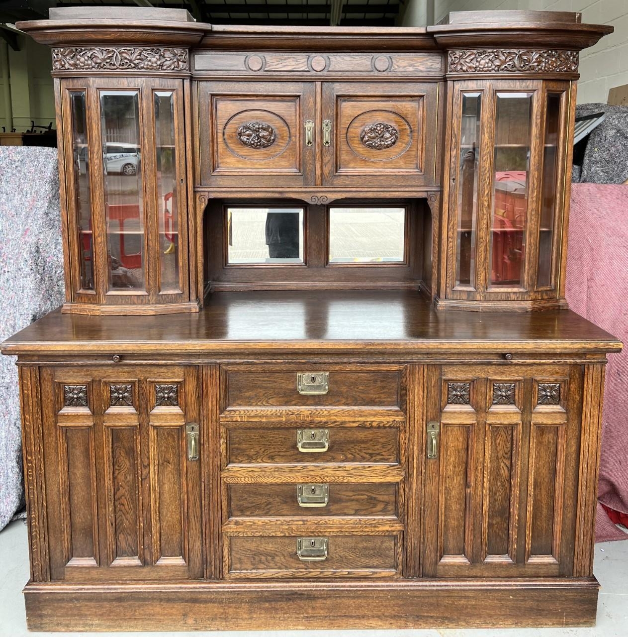 An arts & crafts, solid oak, display dresser. Bevelled glass doors, mirror backed. (key present).