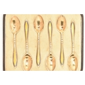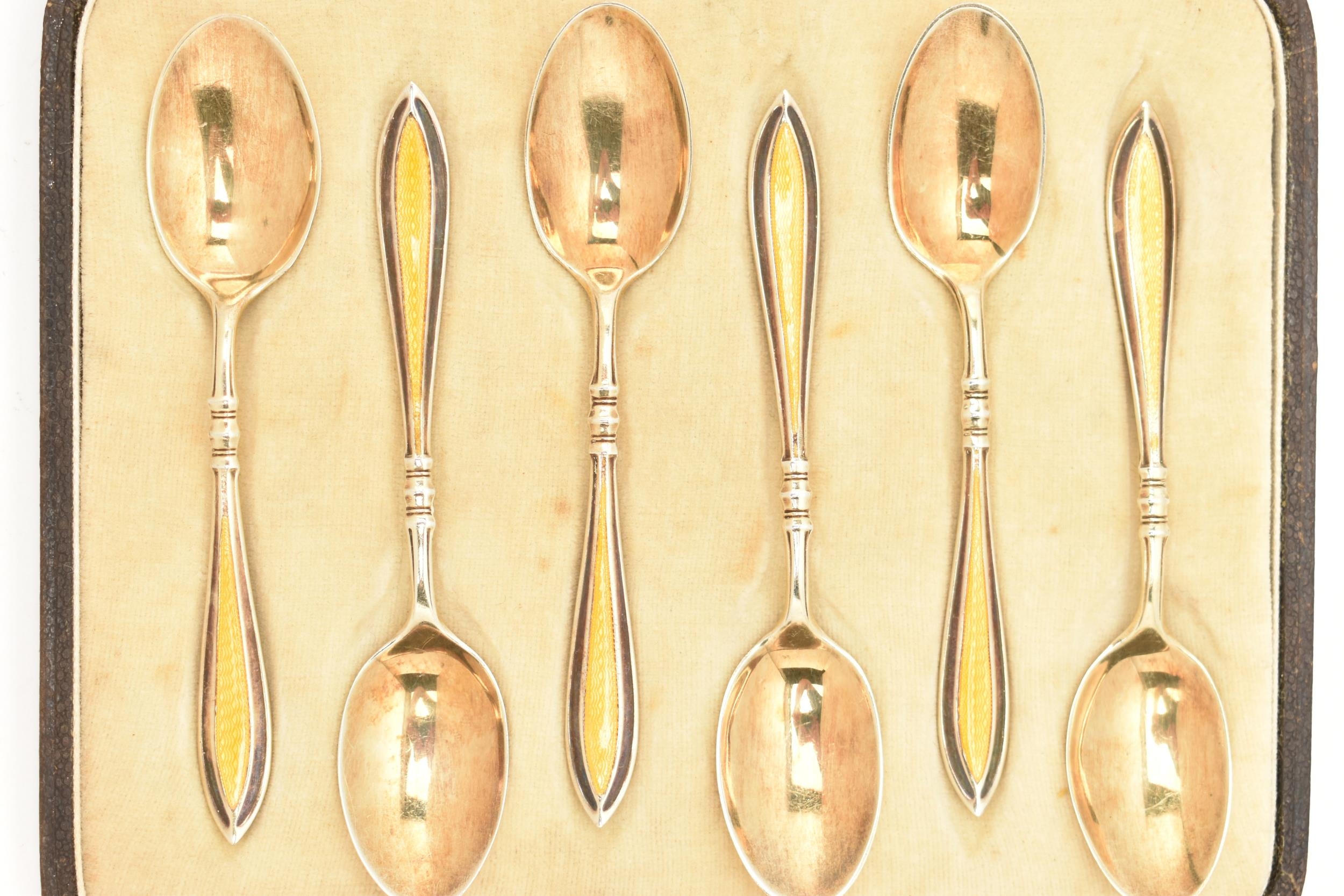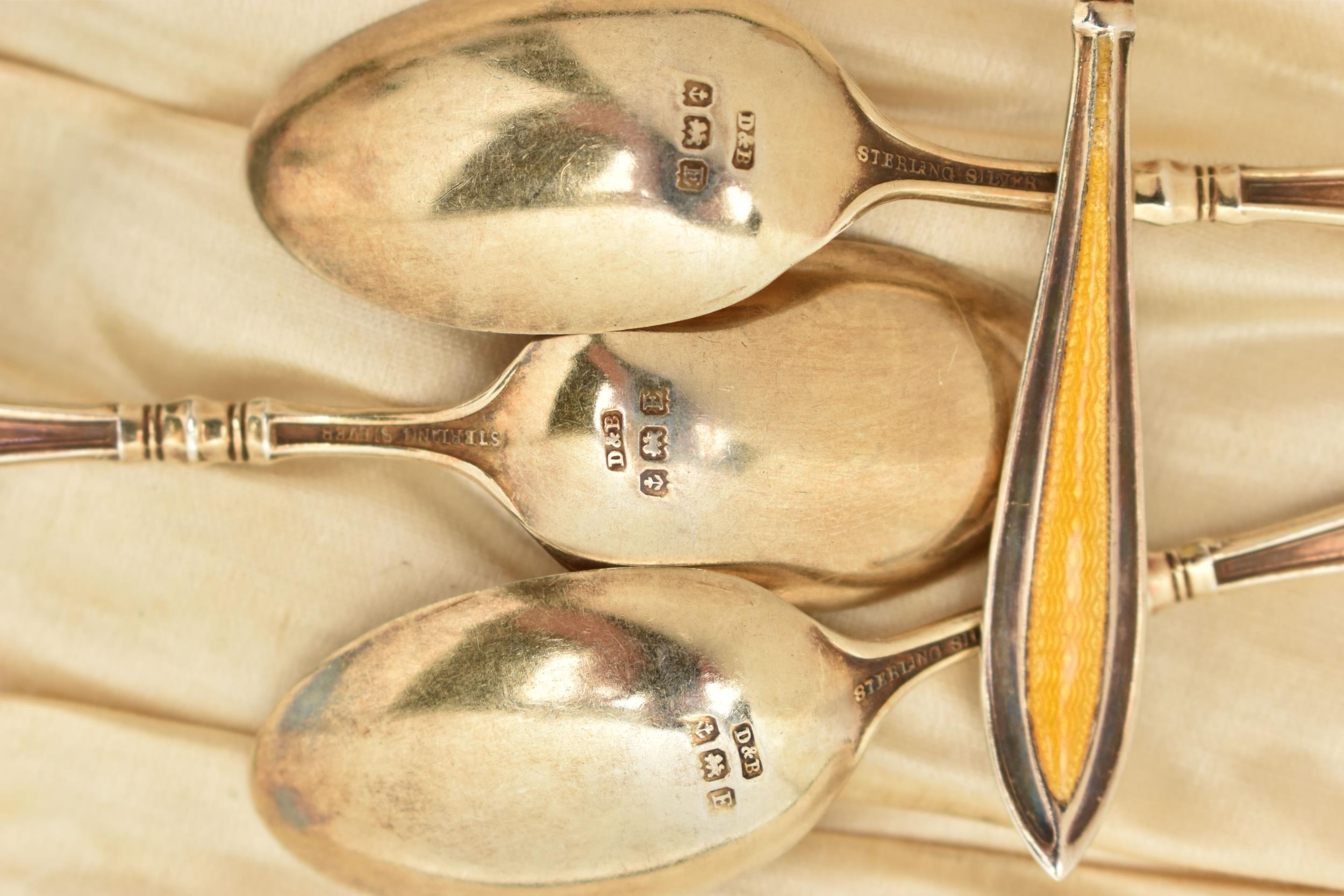 A CASED SET OF SIX EARLY 20TH CENTURY SILVER GILT AND ENAMEL TEAPSOONS, each spoon decorated with a yellow guilloche enamel handle, hallmarked 'Docker & Burn Ltd' Birmingham 1929, approximate gross weight 60 grams, 2.1 ozt (condition report: general light wear, some very light wear to the gilt in places, enamel in good condition)