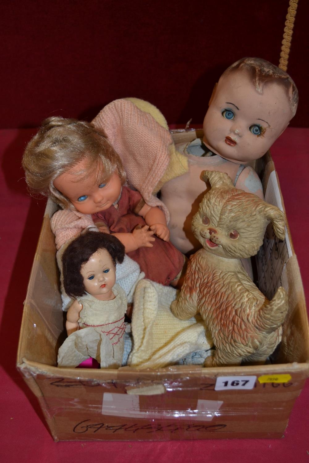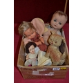 BOX OF DOLLS, RUBBER DOG, ETC