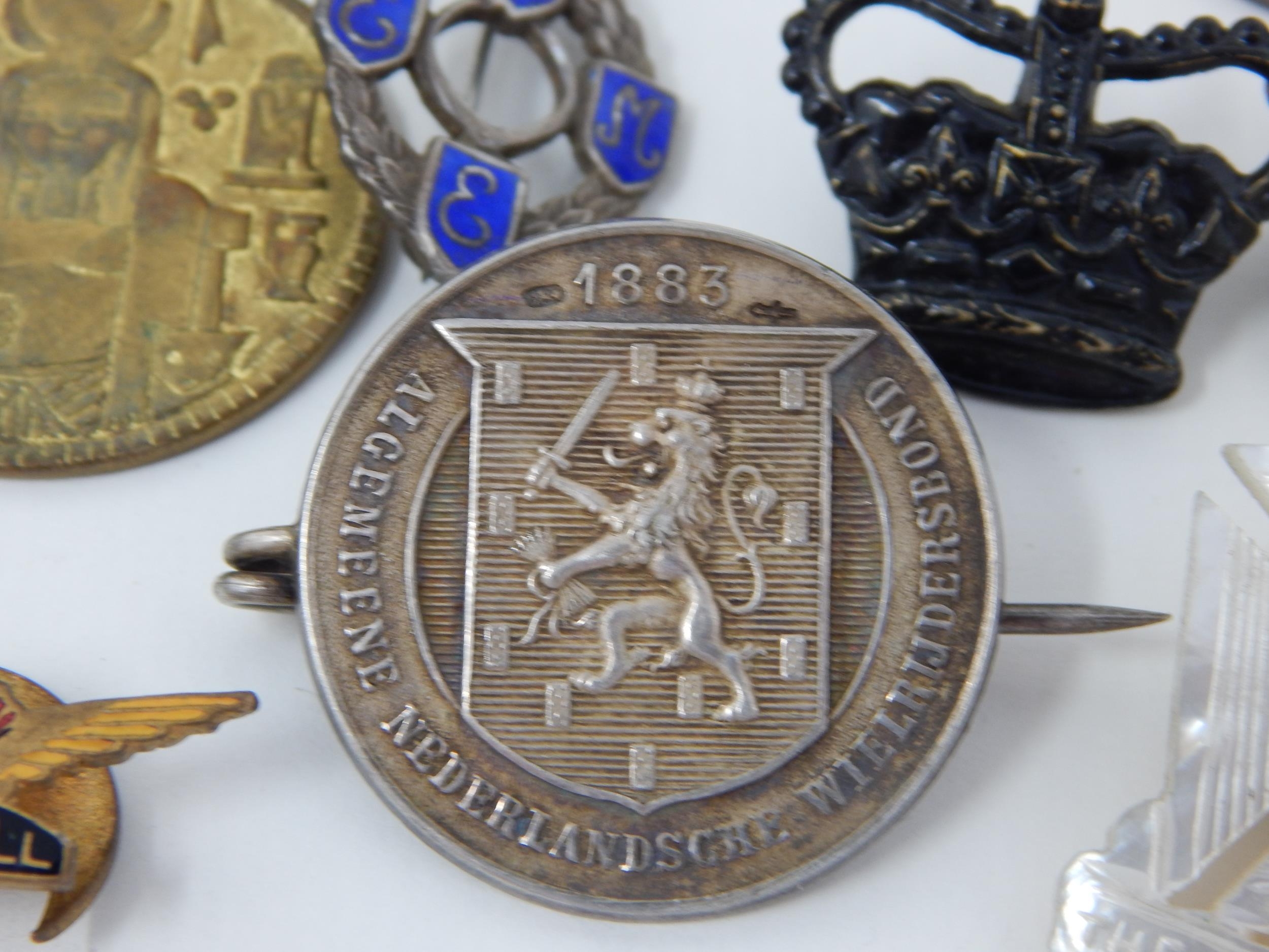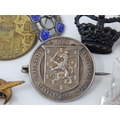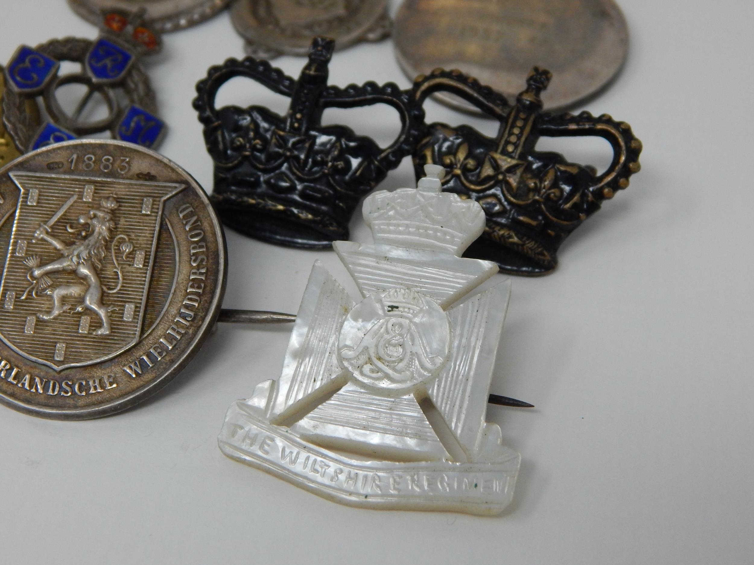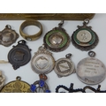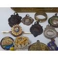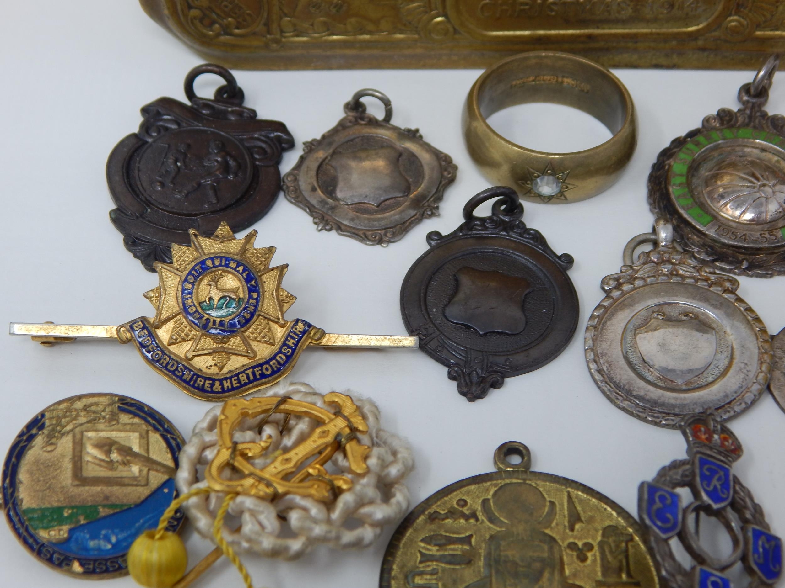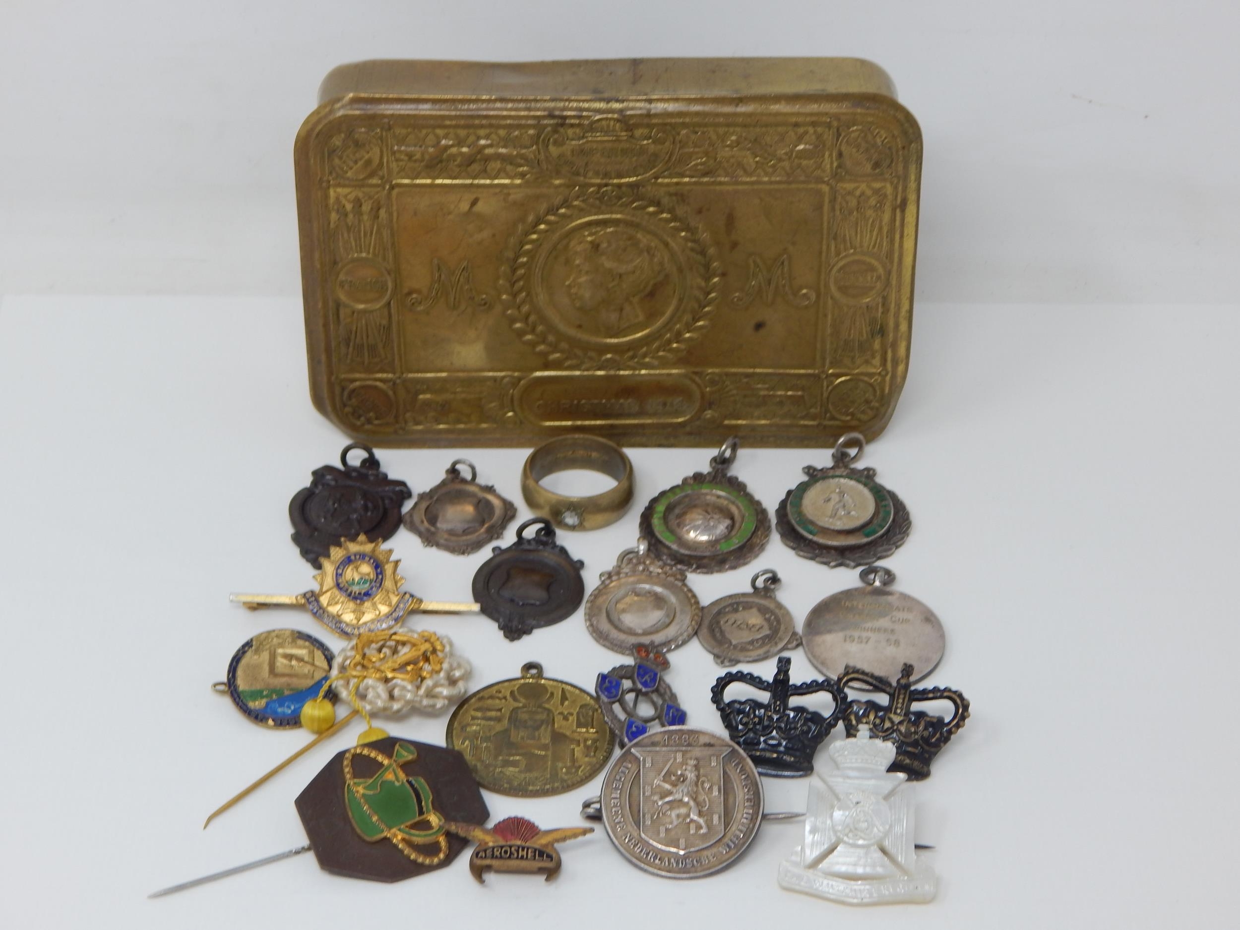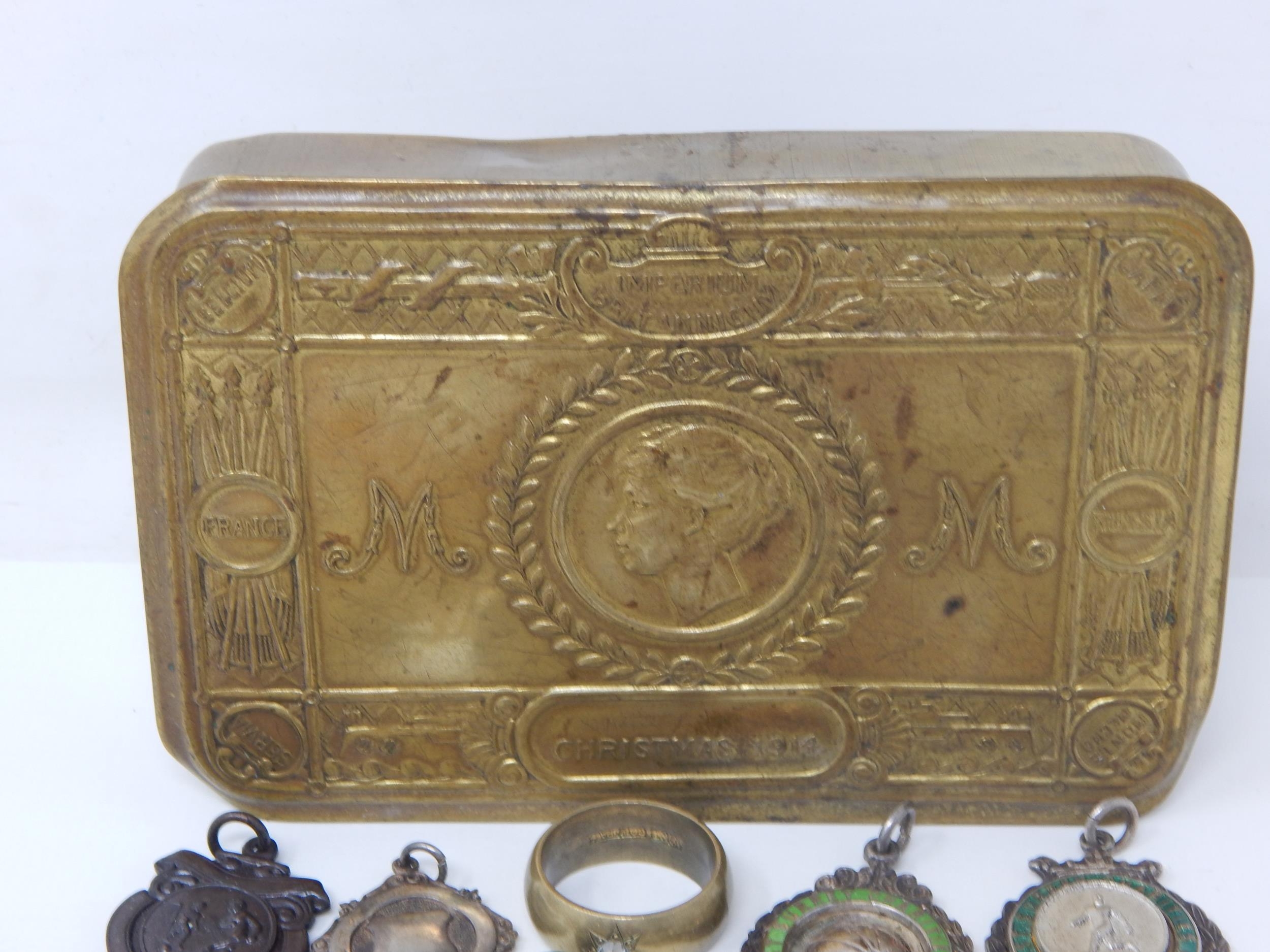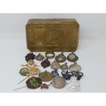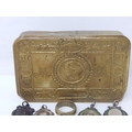 WWI Queen Mary Christmas Tin 1914 Containing a Quantity of Hallmarked Silver Fobs, Military Badges etc