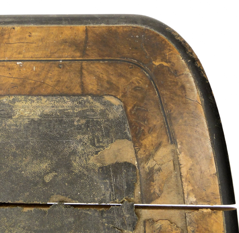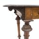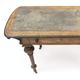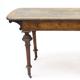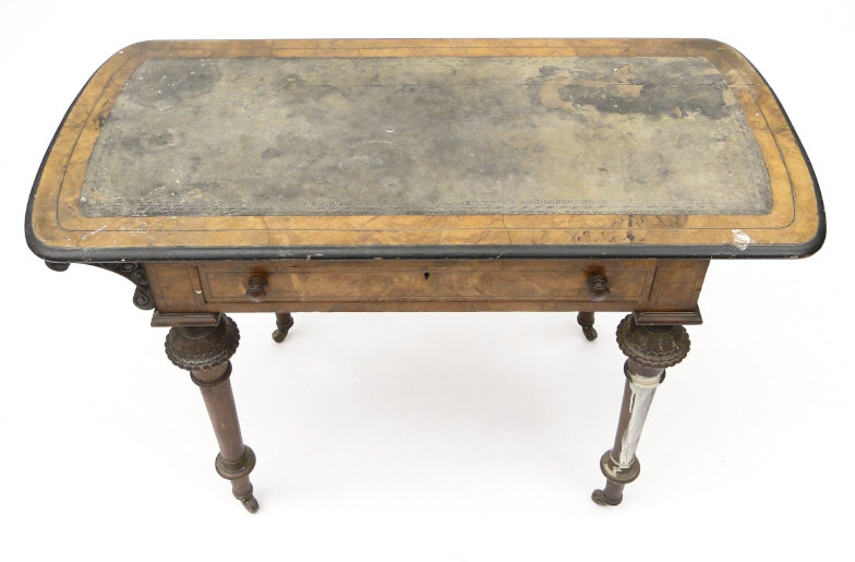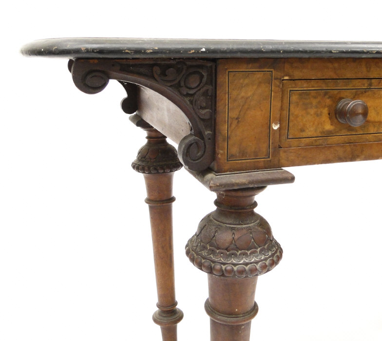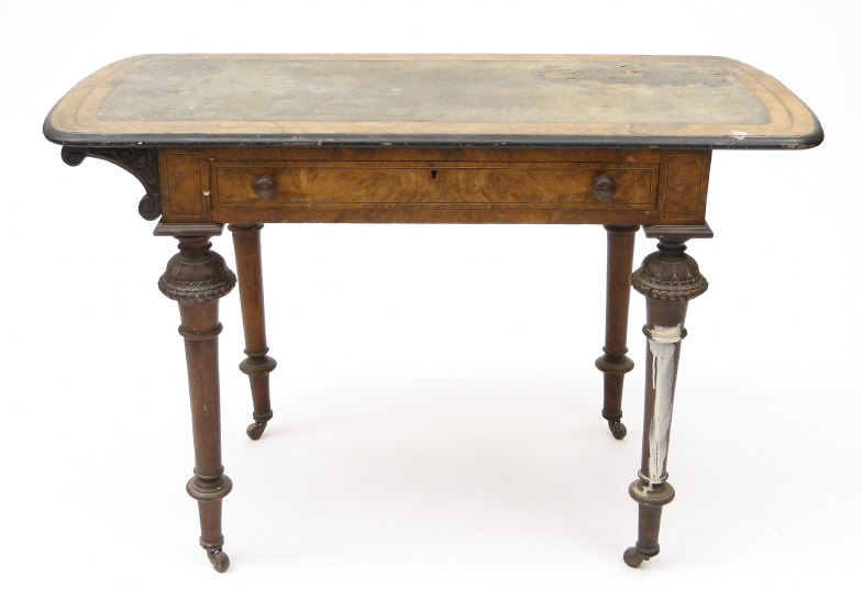 Victorian line inlaid walnut writing table, the rectangular top with rounded corners and tooled leather skiver above a frieze drawer, raised on carved and turned legs on china castors, 75cm high x 108cm wide x 55cm deep