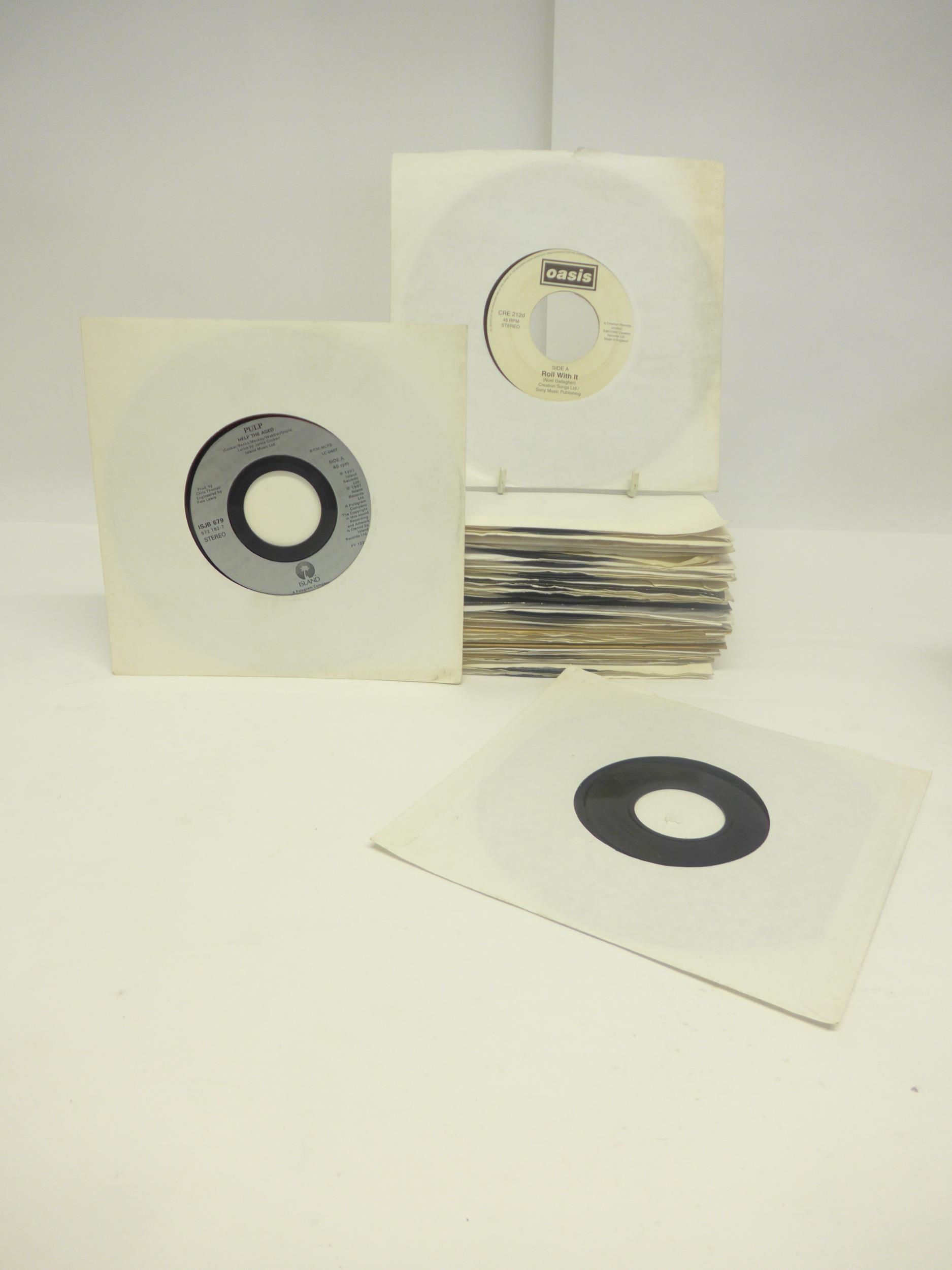 Indie / Britpop / Alt Rock - A collection of forty-five 1990s jukebox issue 7" singles to include RADIOHEAD: 'No Surprises / Palo Alto' (NODATALH 04, x2 copies) and 'Karma Police / Lull' (NODATALH 03), THE SMASHING PUMPKINS: 'Ava Adore / Czarina' (HUTLH 101), PULP: 'Help The Aged / Tomorrow Never Lies' (ISJB 679) and 'A Little Soul / Cocaine Socialism' (ISJB 708, vinyl P), OASIS: 'D'You Know What I Mean / Stay Young' (CRE 256) and 'Roll With It / It's Better People' (CRE 212d), BLUR: 'On Your Own / Beetlebum' (FOODLH 98), 'Beetlebum / Woodpidgeon Song' (FOODLH 89) and 'Country House / One Born Every Minute' (FOODLH 63), THE VERVE: 'Lucky Man / Never Wanna See You Cry' (HUTLH 92, x3 copies), SUEDE: 'Trash / Europe Is Our Playground' (NUD 21DS), CAST: 'Guiding Star / Out Of The Blue' (571 172-7), SUPERGRASS: 'Going Out / Melanie Davies' (R6428LH, x2 copies) and 'Sun Hits The Sky' (RLH 6469), IAN BROWN: 'My Star / See The Dawn' (571 986-7, x2 copies), JESUS JONES: 'The Devil You Know / Phoenix' (PERVDJ 1), OCEAN COLOUR SCENE: 'Traveller's Tune / Song For The Front Row' (MCS 40144) and 'The Day We Caught The Train / You've Got It Bad' (MCSJB 40046), THE LEVELLERS: 'Belaruse / 15 Years' (JBWOK2034, x3 copies), GARBAGE: 'Push It / Lick The Pavement' (MUSH 28SX), BLACK GRAPE: 'Get Higher / Rubberband (Live At Phoenix '97)' (RAXJB 32), THE BLUETONES: 'Solomon Bites The Worm' (BLUEH007), MONACO: 'Sweet Lips / Shattered' (LIPH 1), CHUMBAWUMBA: 'Tubthumping / Football Sing (Shit Ground, No Fans)' (EM486), EMBRACE: 'Come Back To What You Know / Love Is Back' (HUTLH 93), R. E. M.: 'Nightswimming / Losing My Religion (Live) (Previously Unreleased)' (W 0184), UGLY KID JOE: 'Cat's In The Cradle / Panhandlin Prince' (MER 385), FAITH NO MORE: 'I'm Easy / Be Aggressive' (LASH 44), BADDIEL & SKINNER & LIGHTNING SEEDS: 'Three Lions' (663273 7, x2 copies) and 'Three Lions 98' (666098 7), ENGLAND UNITED: '(How Does It Feel To Be) On Top Of The World' (LON414), GENE: 'We Could Be Kings / Dolce & Gabbana Or Nowt' (COSTS 10, x2 copies), THE WONDER STUFF: 'On The Ropes / Professional Disturber Of The Peace' (GONJB 15), NO DOUBT: 'Don't Speak / Greener Pastures' (INSJB 95515), JAMES: 'Sometimes / America' (JIM 13) (45, condition varies but vinyl generally VG-VG+)