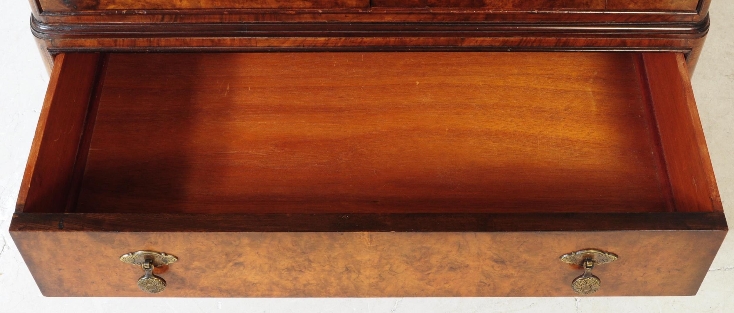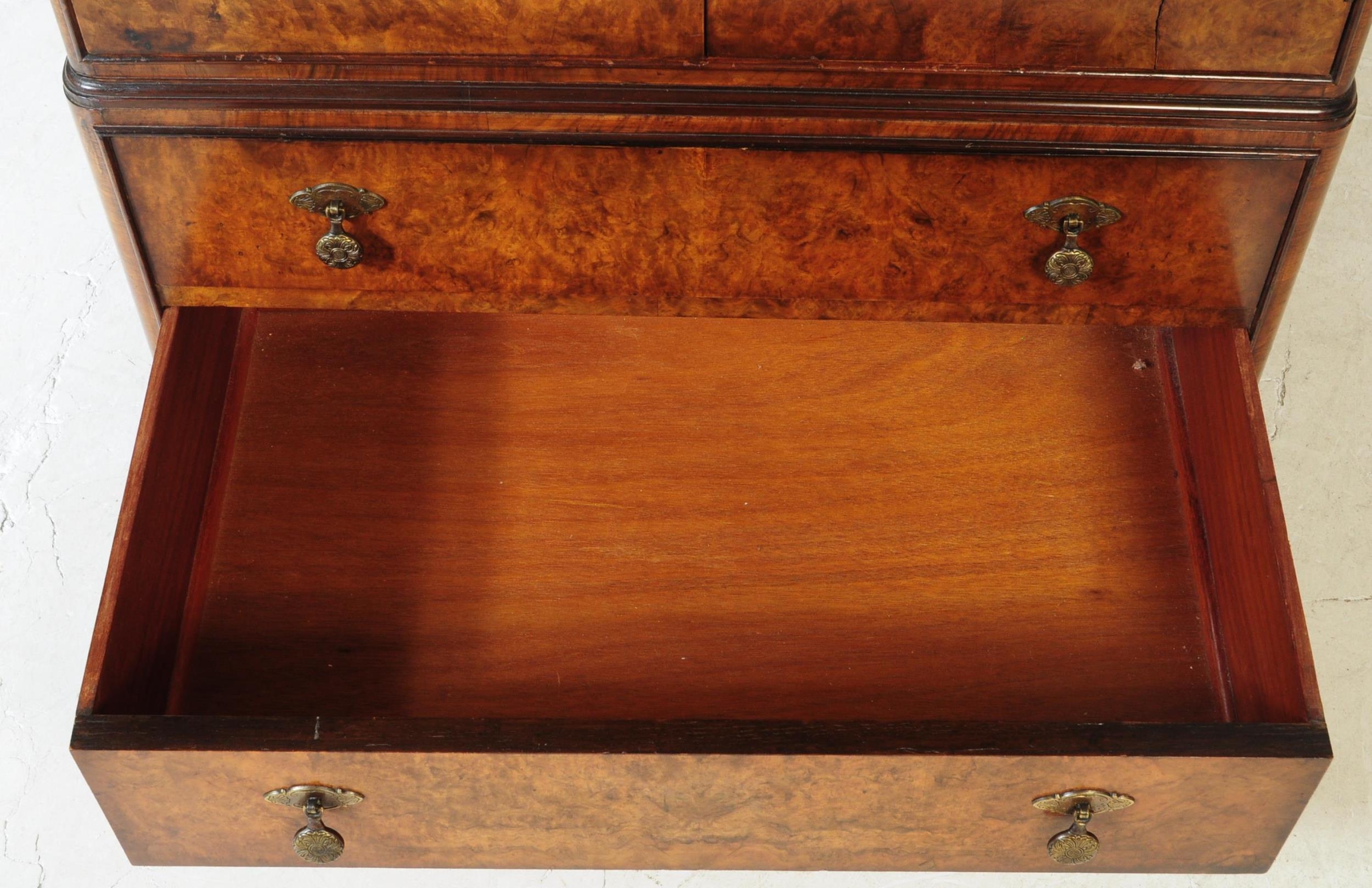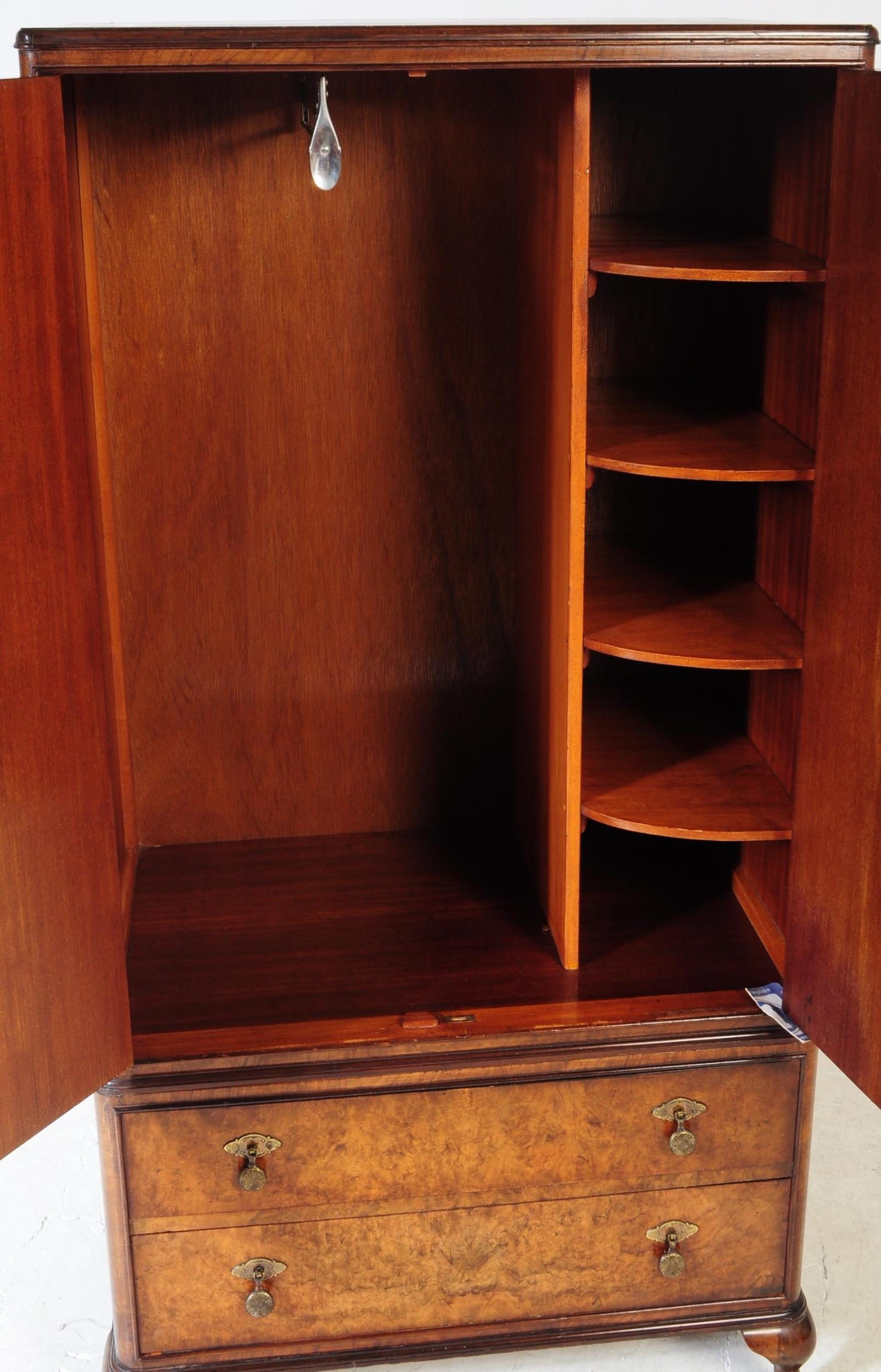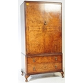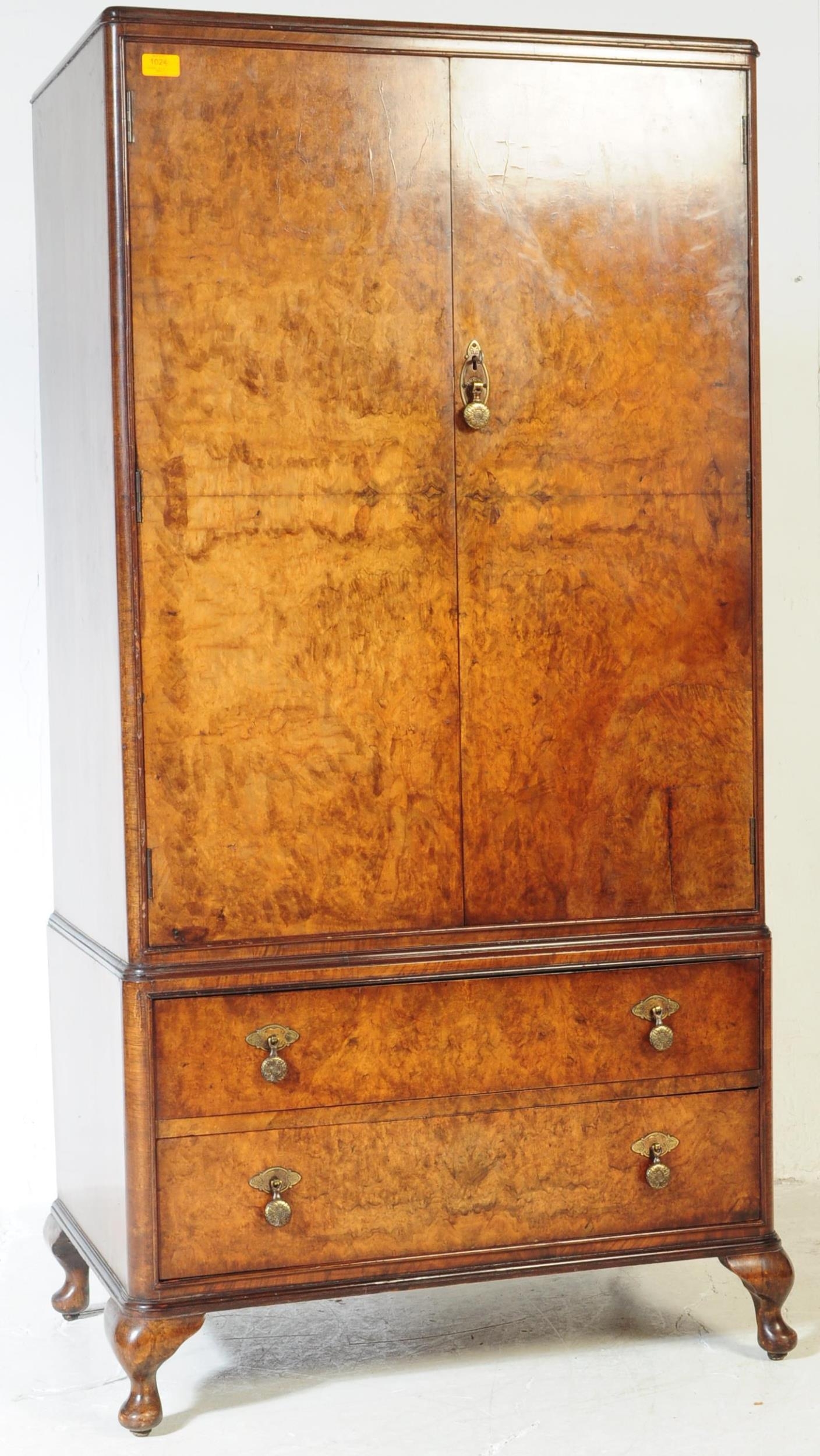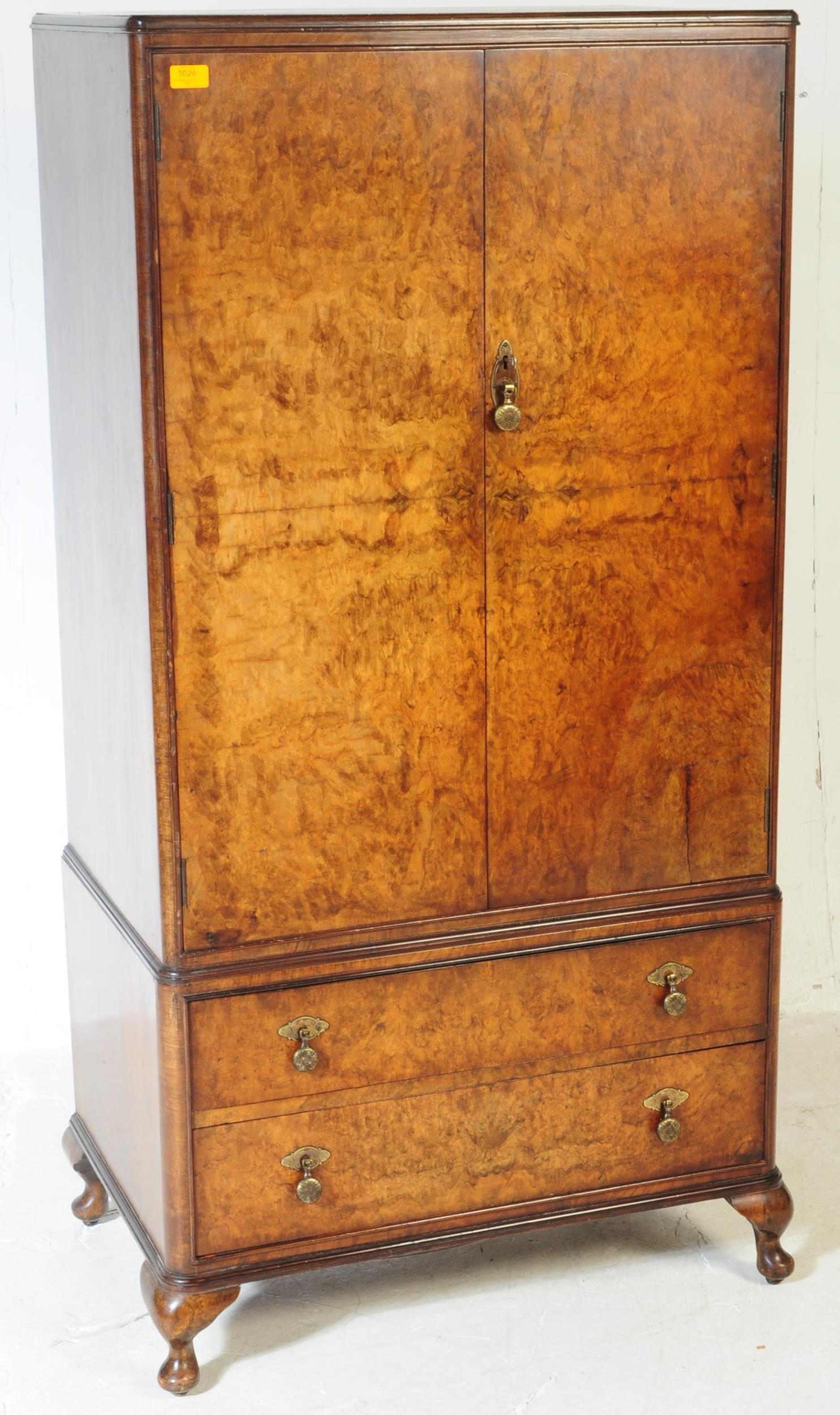 A vintage 20th century circa 1940s Queen Anne revival walnut tallboy bachelors gentleman's wardrobe closet. Rectangular form with two large cupboard doors above two full length garment drawers. All raised on stumped cabriole legs with metal pendant pulls. Measures approx. 149cm x 73cm x 47cm.