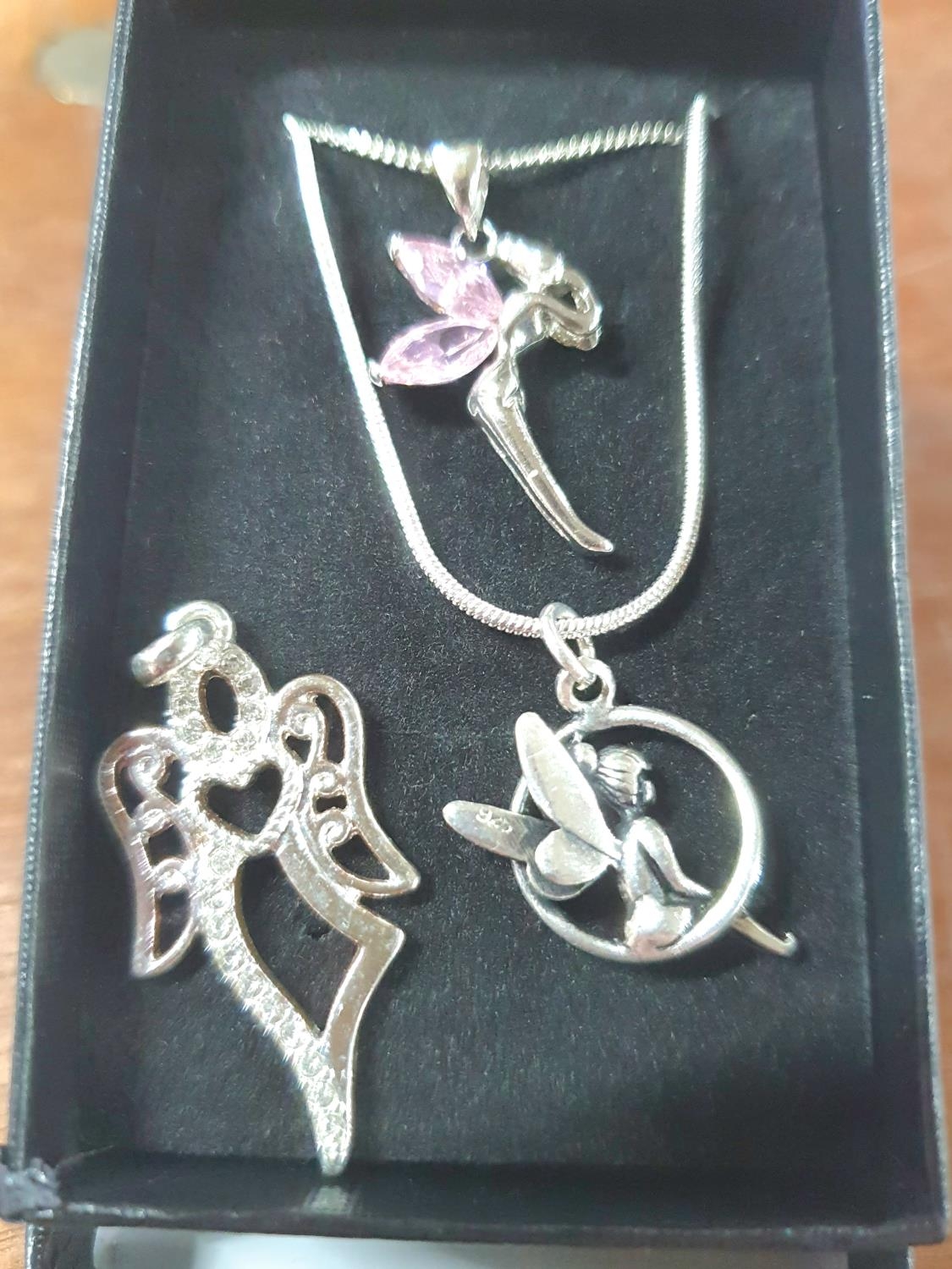 Two silver "fairy" pendants on silver chains together with another silver fairy pendant