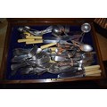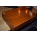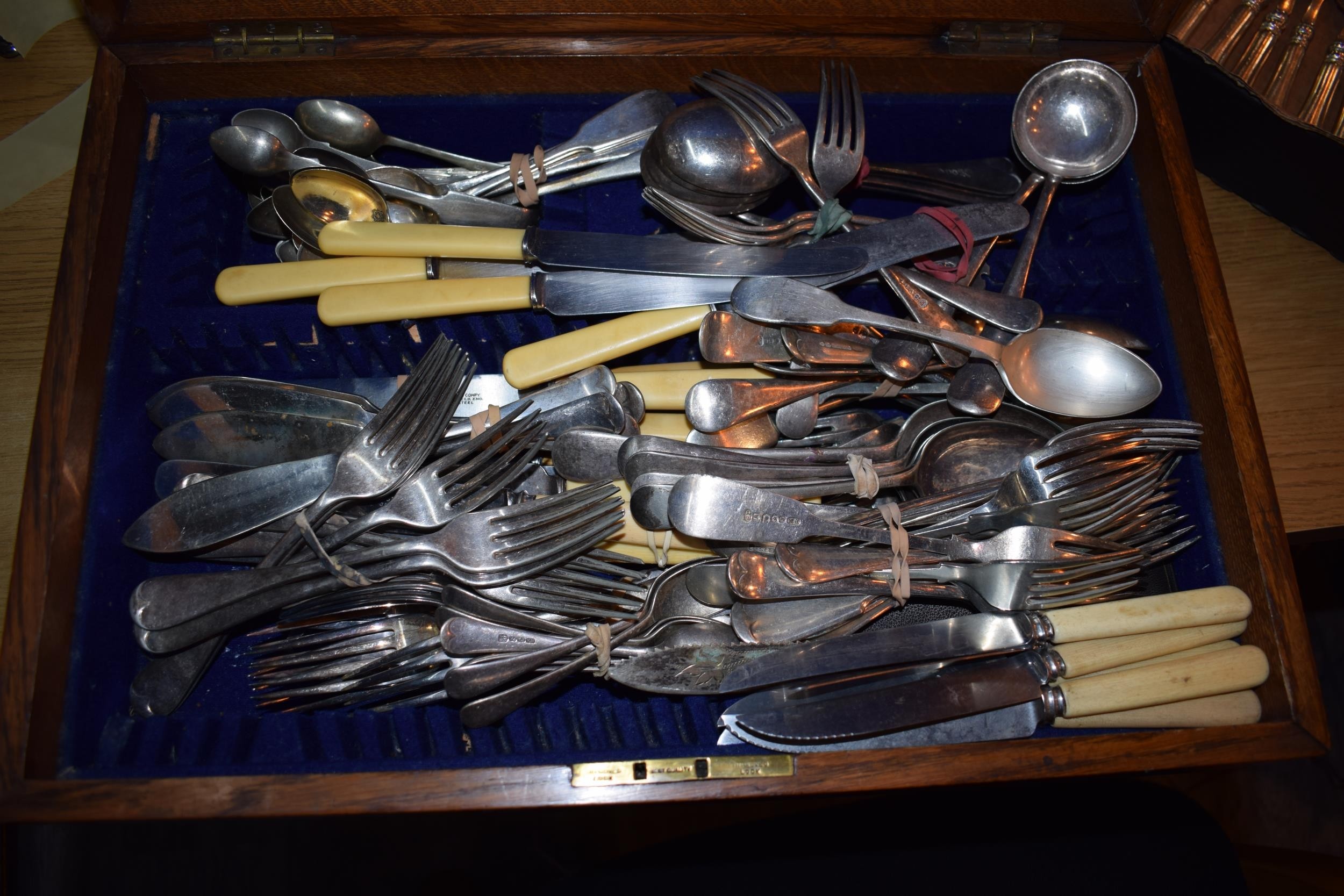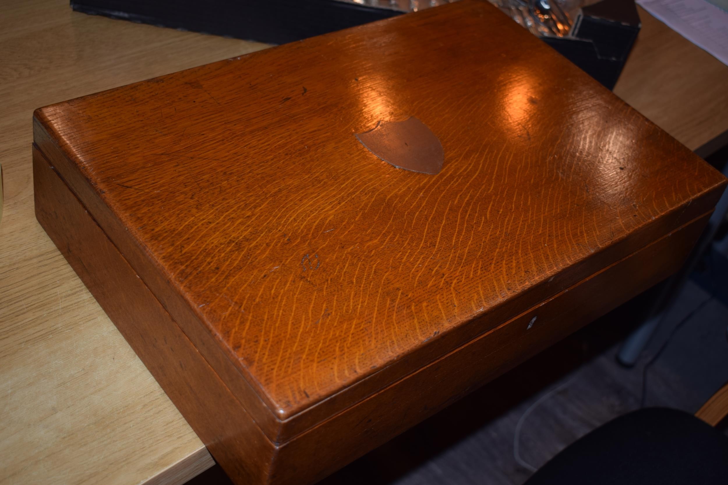 A good example of a cutlery canteen in golden oak with inlaid brass shield to lid complete with a large quantity of sheffield steel and silver plated cutlery. 32cm x 47cm x 10cm.