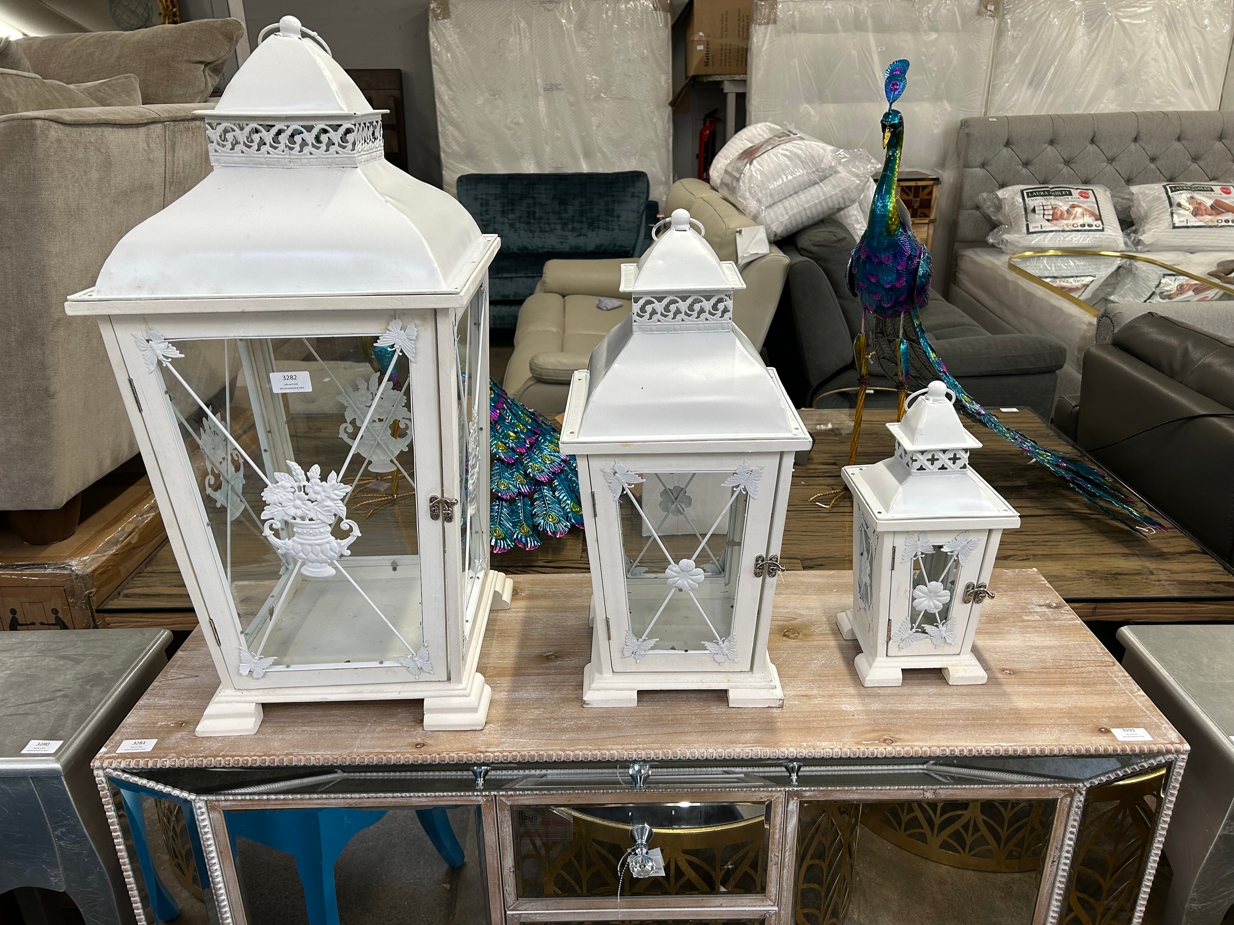 A set of three white graduated lanterns