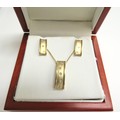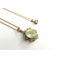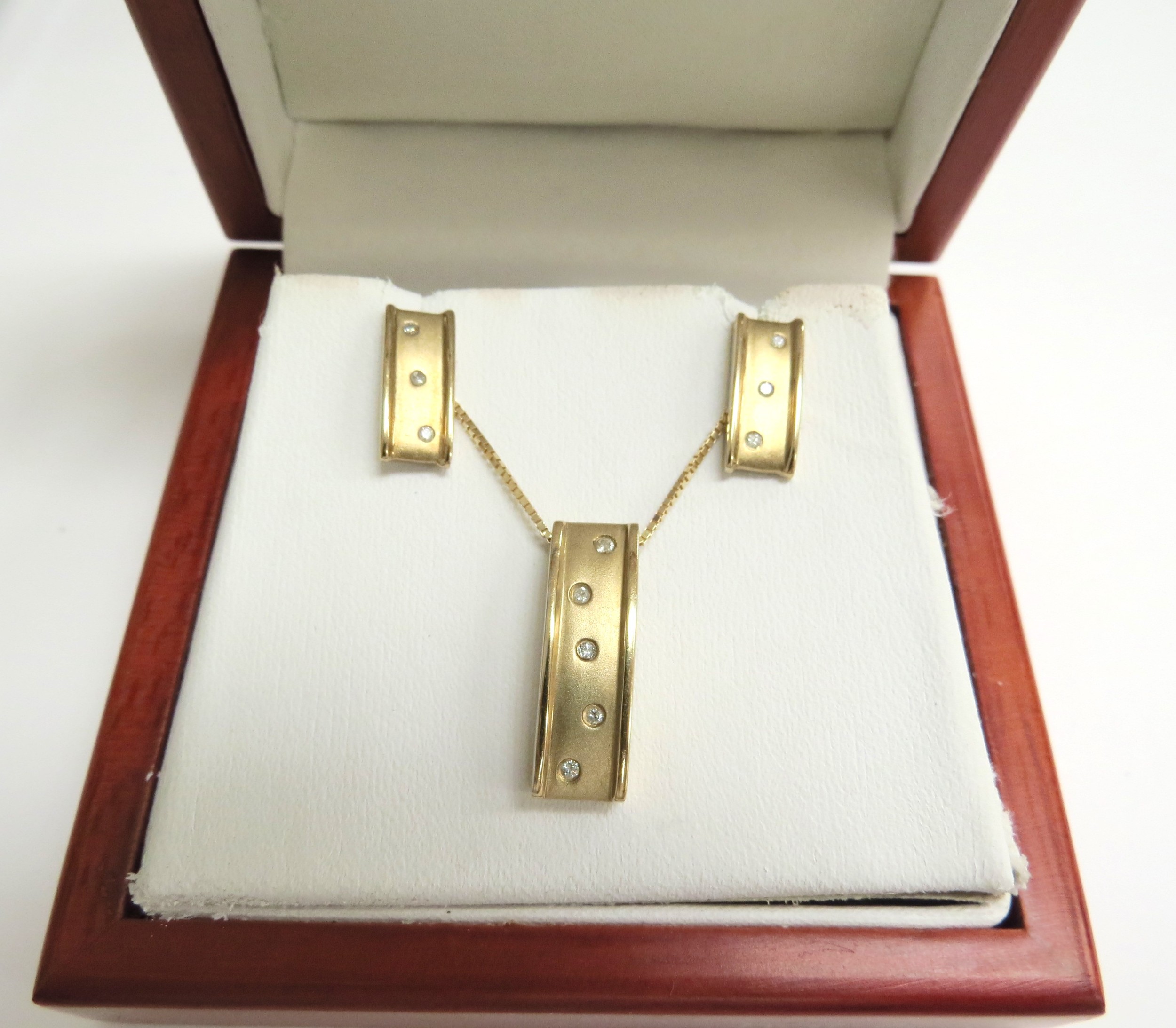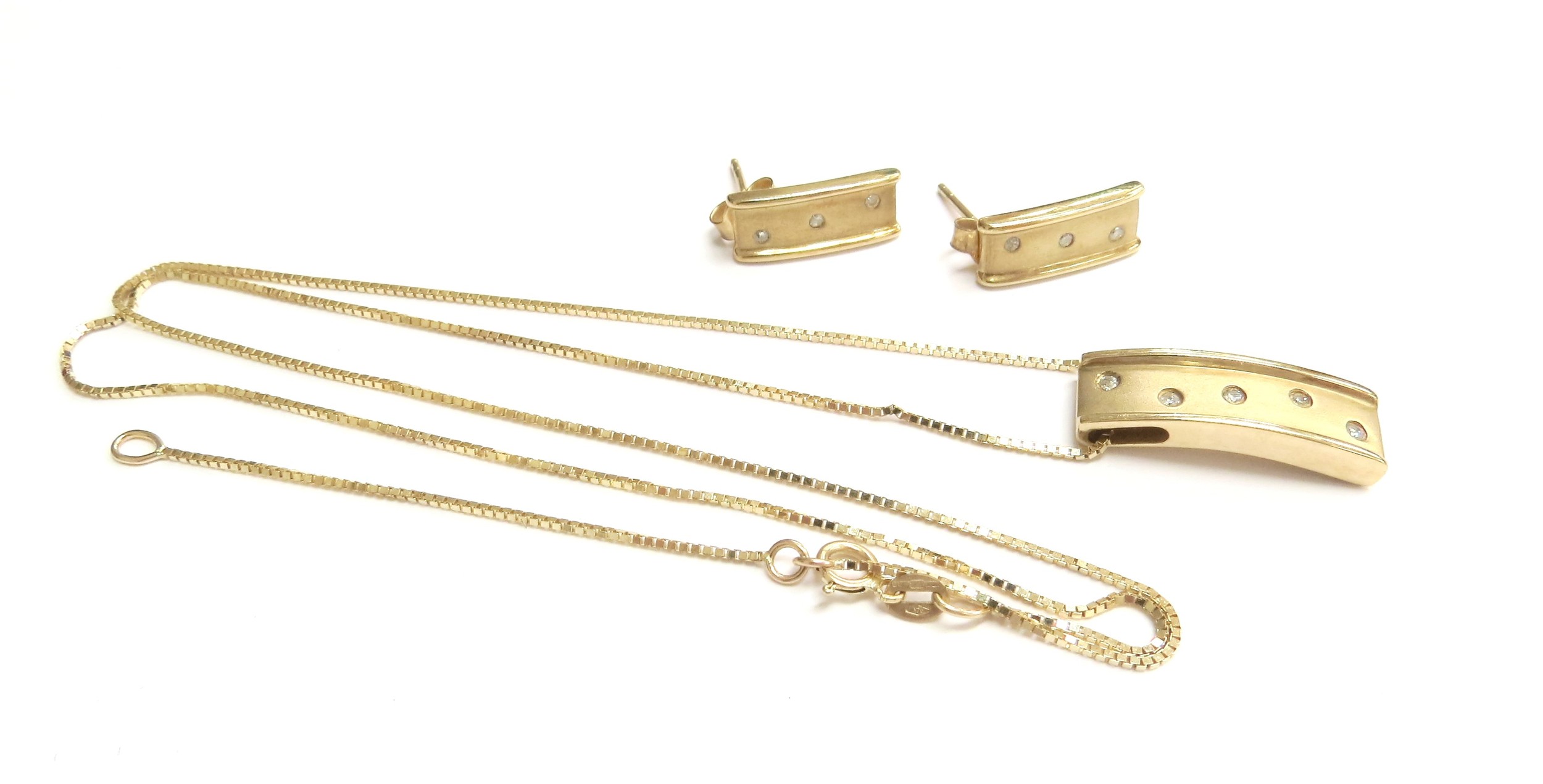 A 9ct gold pendant studded with small diamonds hung on a 9ct gold chain, 40cm long with a 5cm extension and a pair of matching earrings, 7.9g