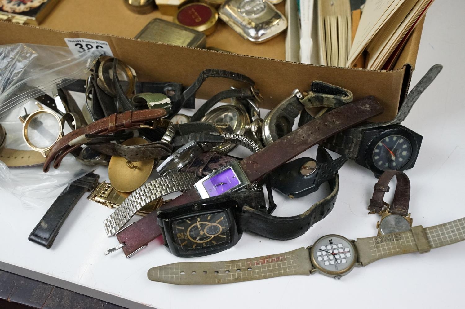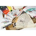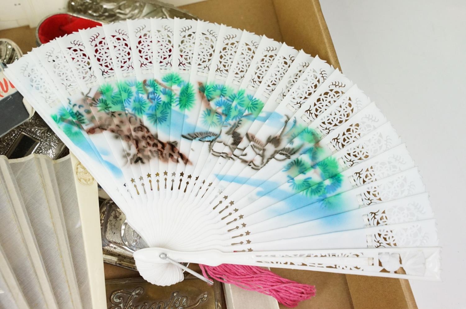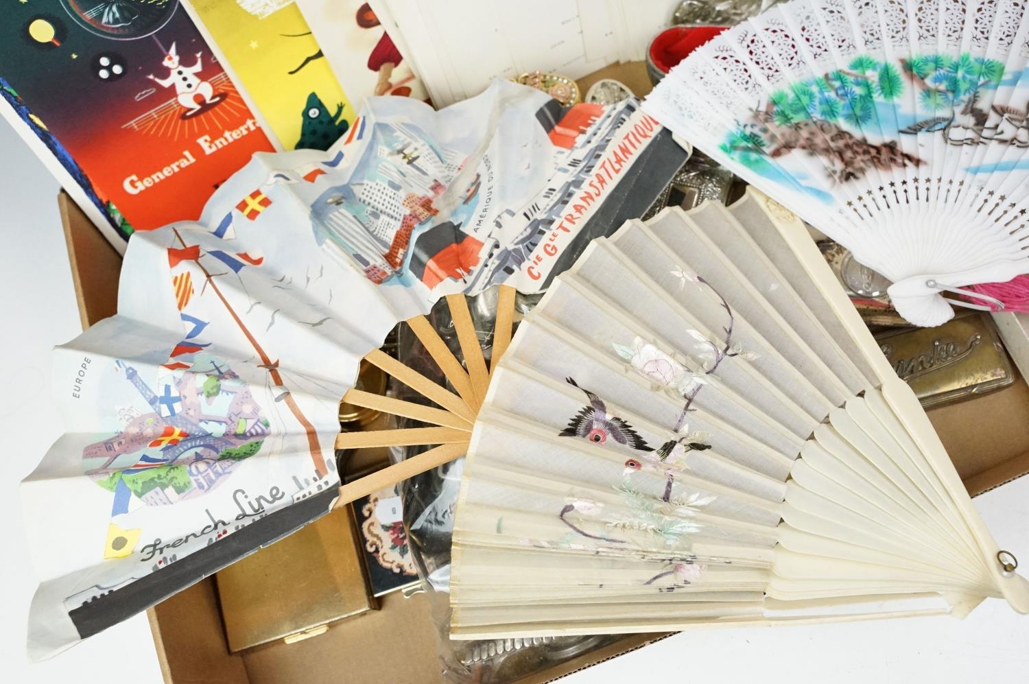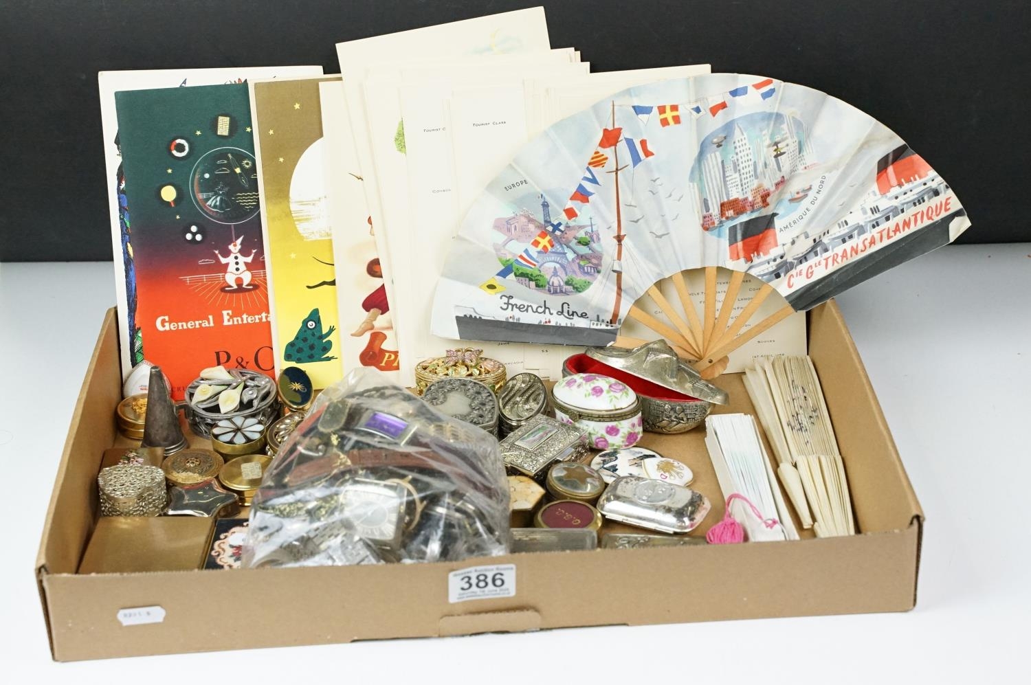 A group of mixed collectables to include pill boxes, watches, fans and a selection of ships menus.
