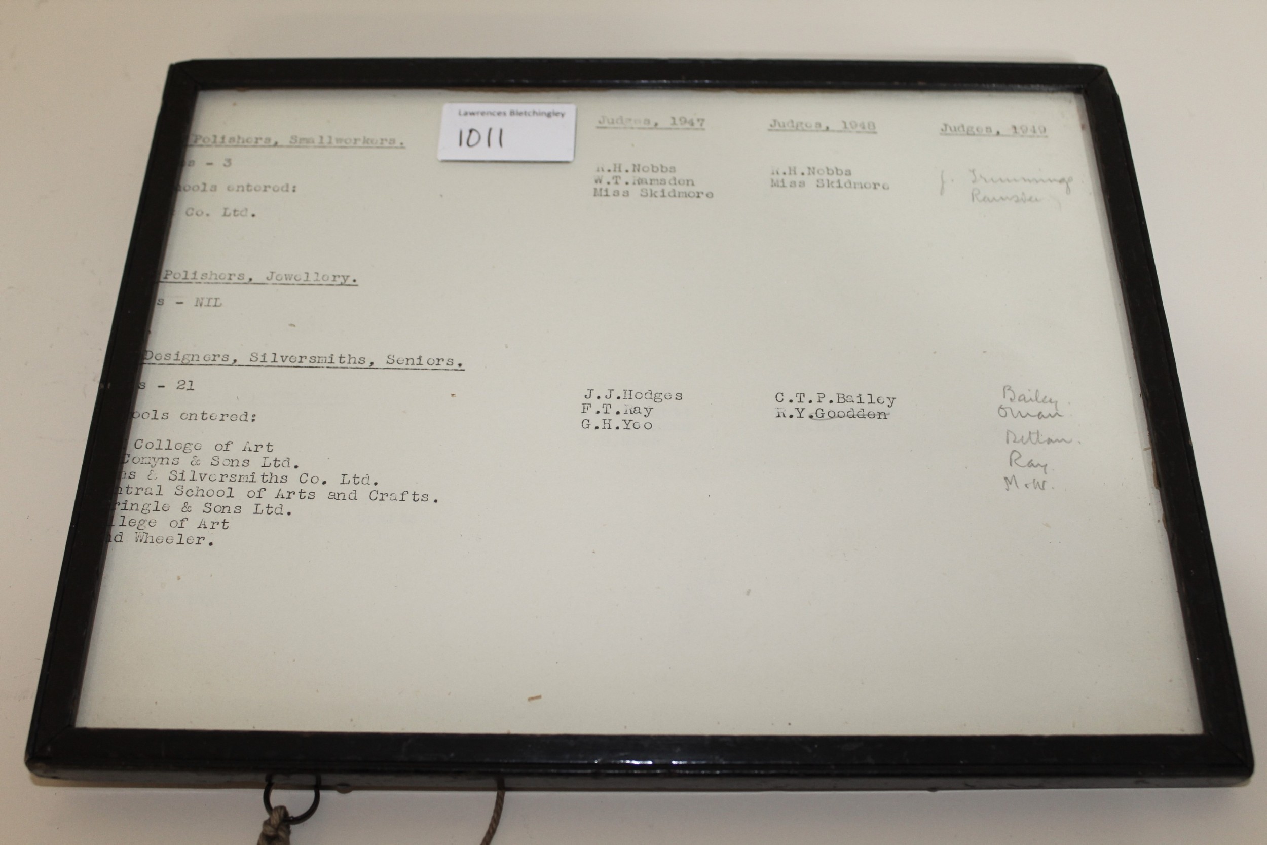 White metal plaque with miscellaneous specimen competition engravings, together with Judges certificate 1949, 9oz t