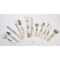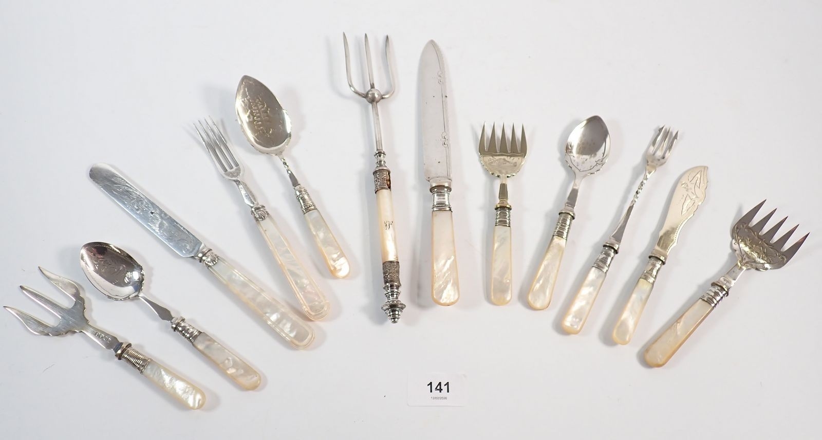 A group of antique serving cutlery with mother of pearl handles
