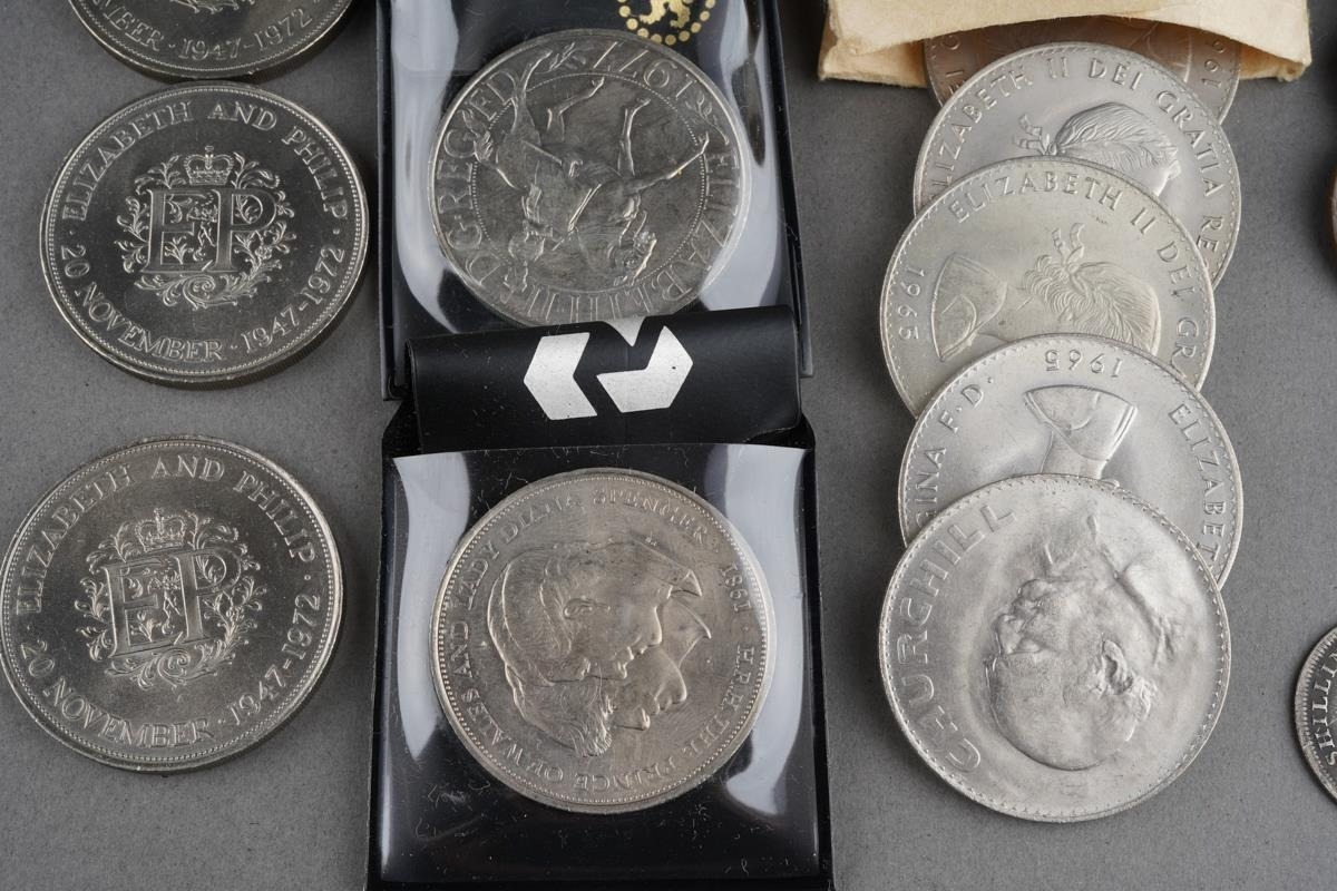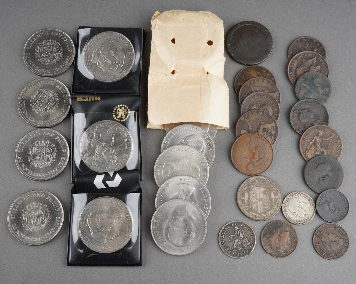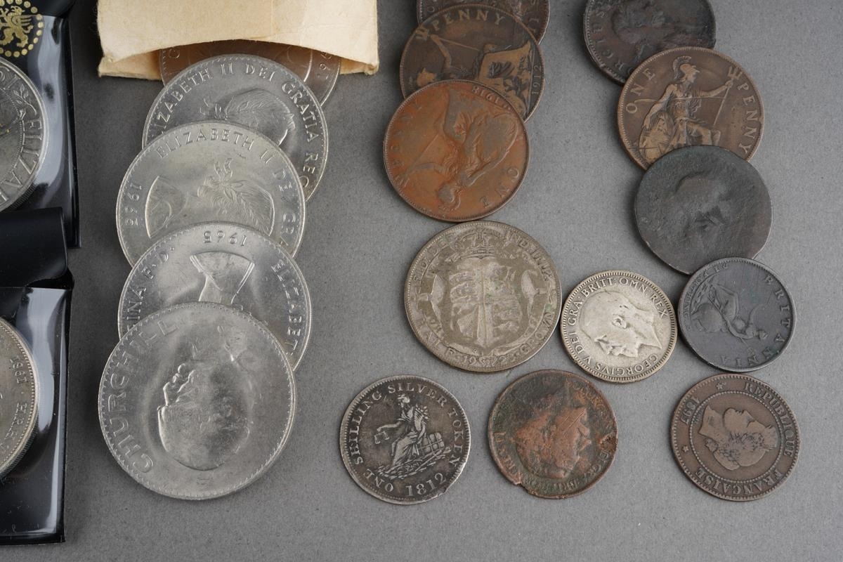 A collection of commemorative coins to inc. 1812 shilling from Leeds (Q)