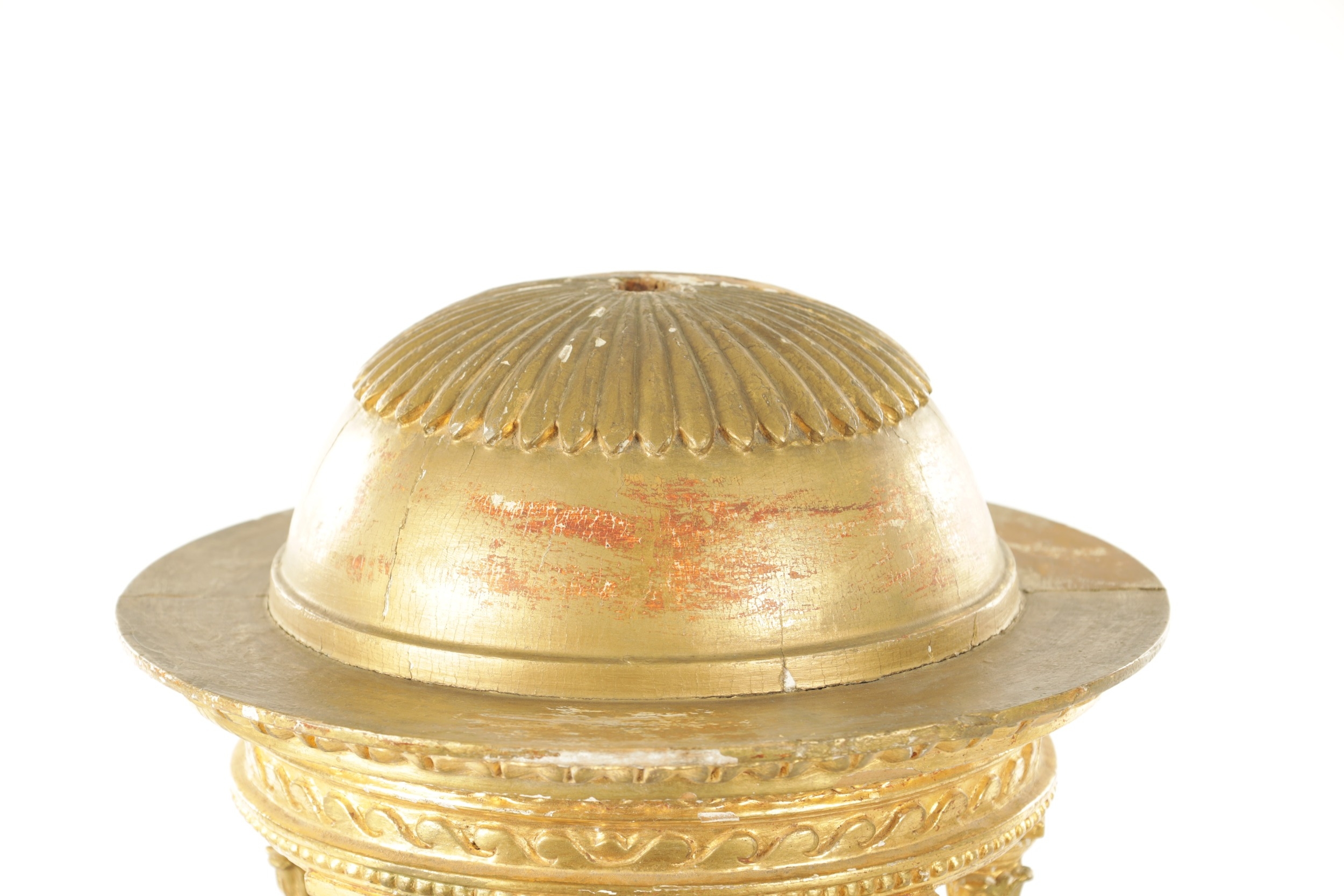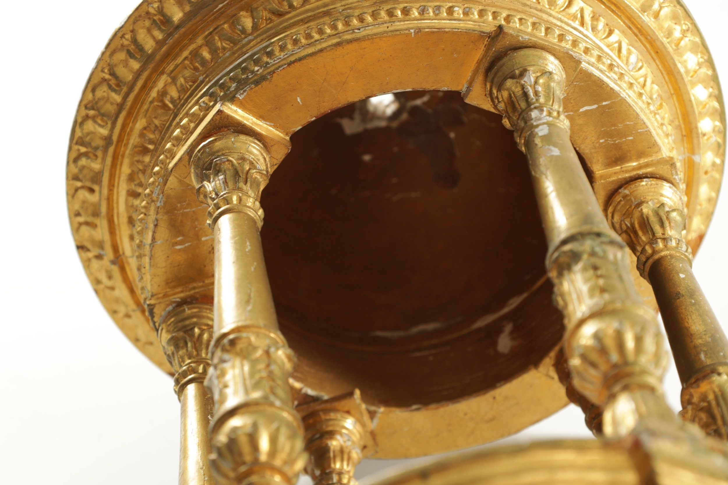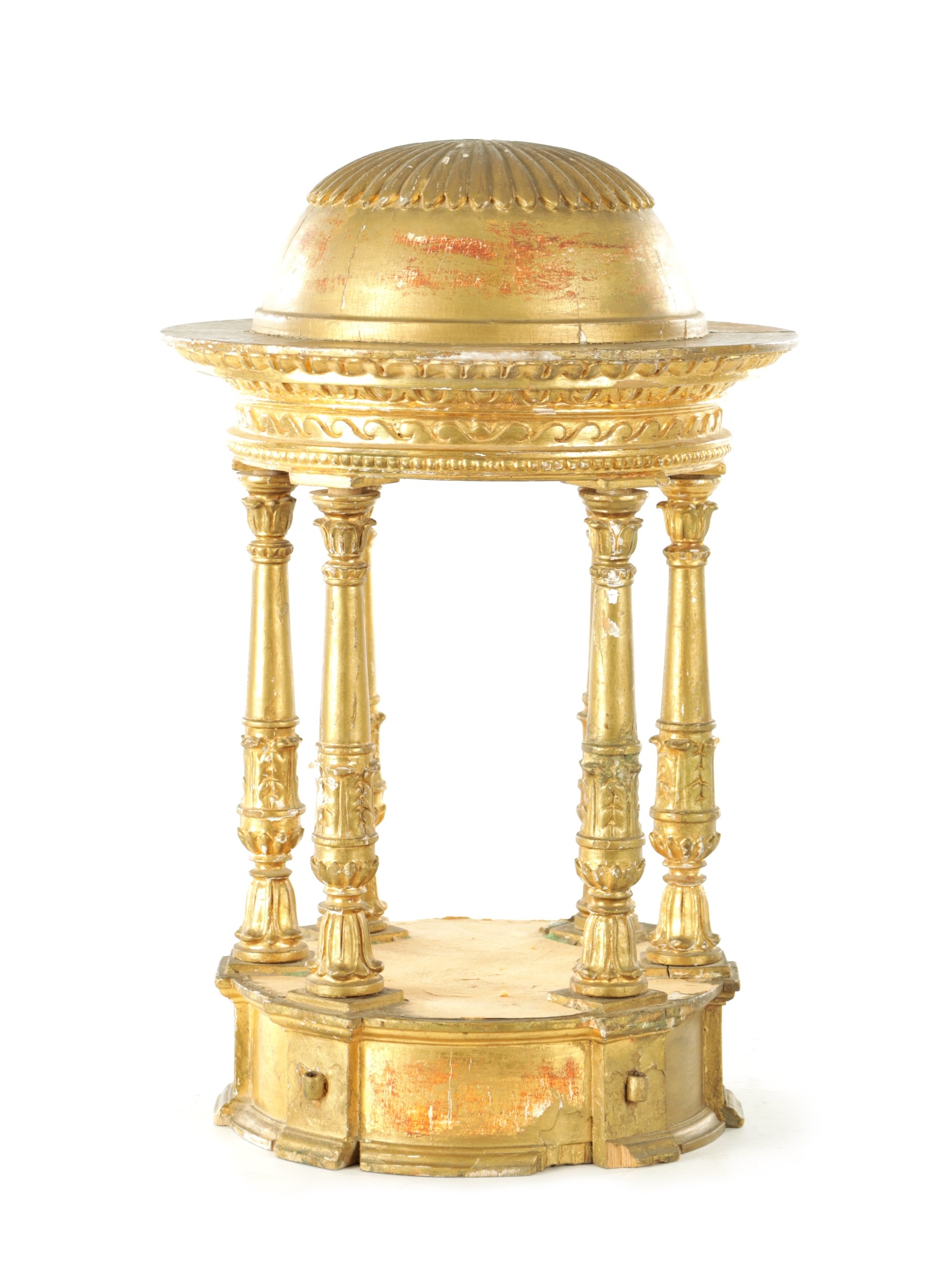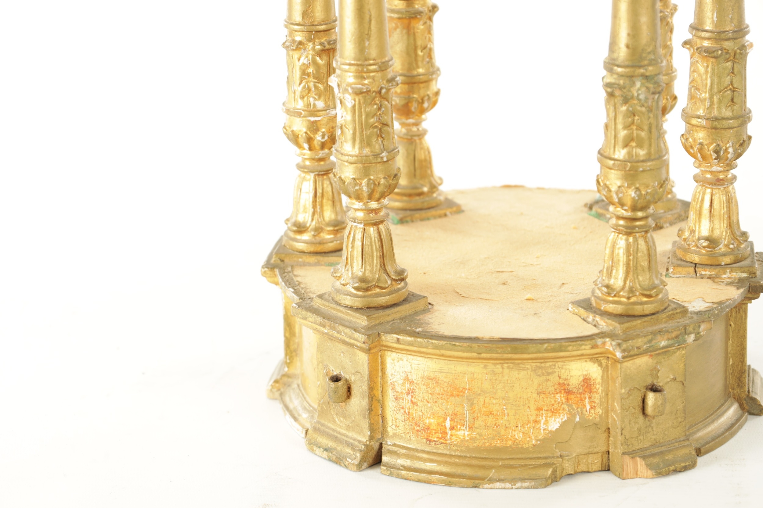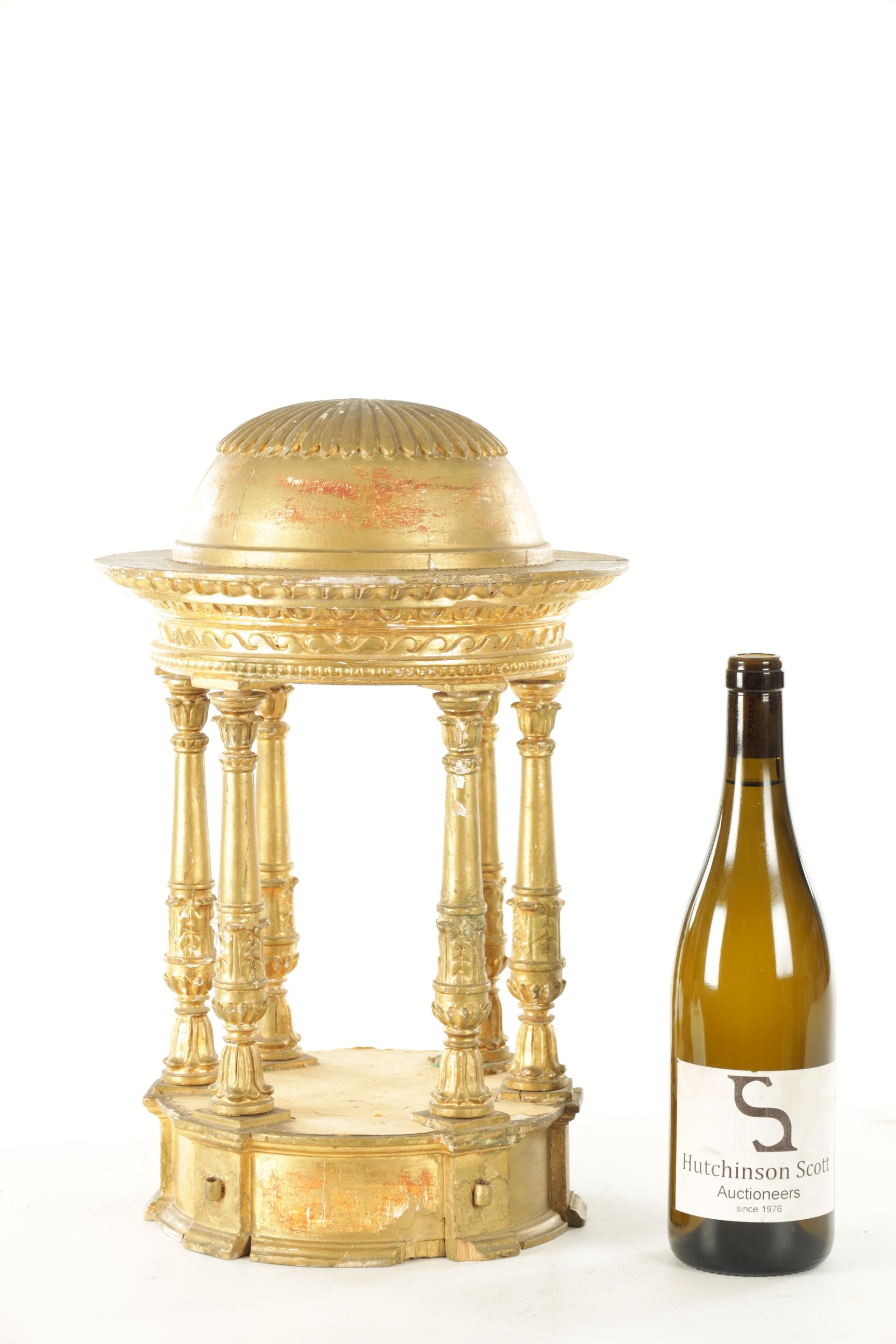 A 19TH CENTURY GILT GESSO GRAND TOUR LIBRARY PORTICO with domed top supported by leaf carved columns. (42cm high)
