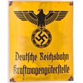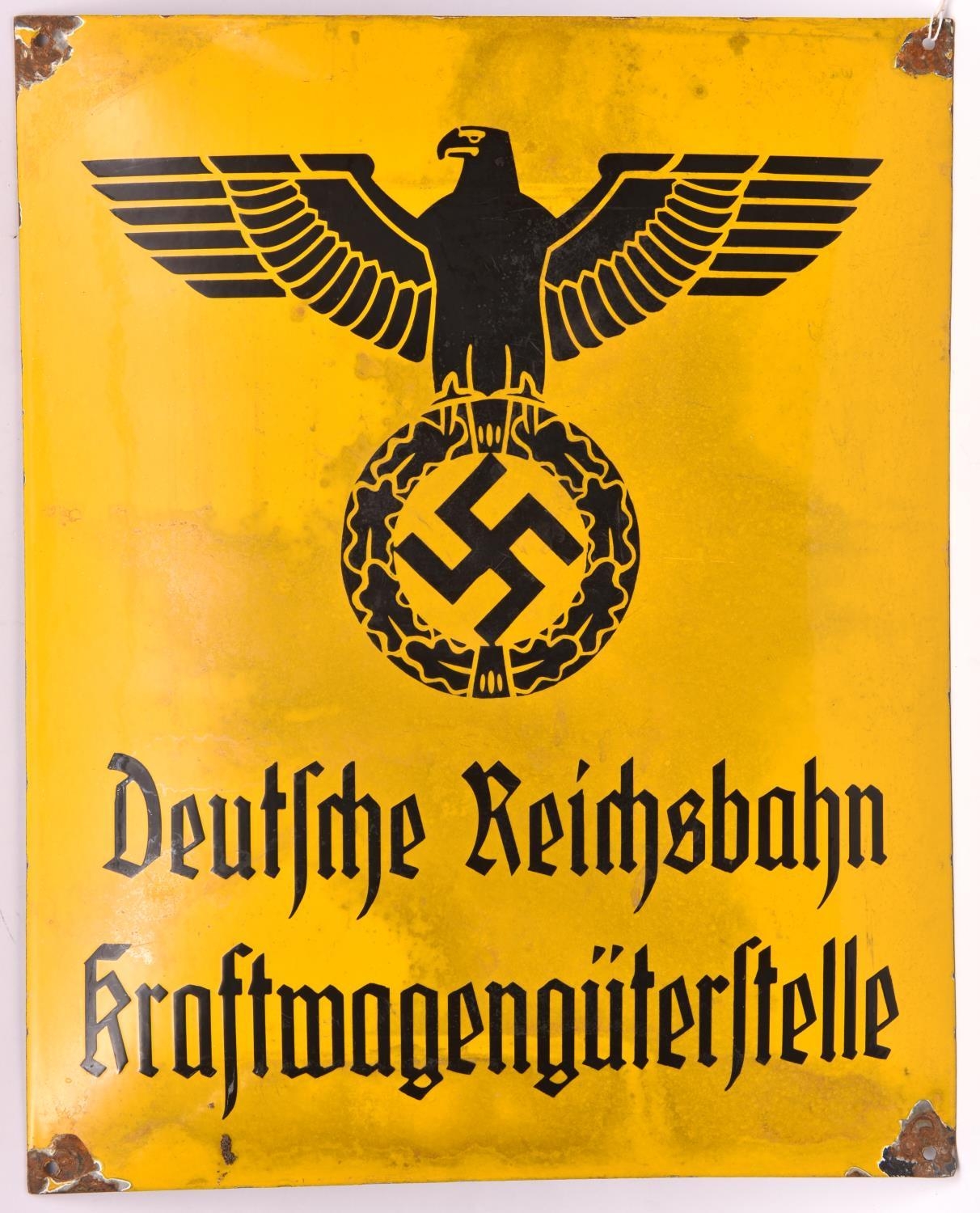 A black on yellow enamelled sign, bearing Third Reich eagle above “Deutsche Reichbahn Kraft-wagenguterstelle”, 17" x 21". GC (enamel chipped around the corner screw holes, some discolouring to the yellow enamel). £50-60