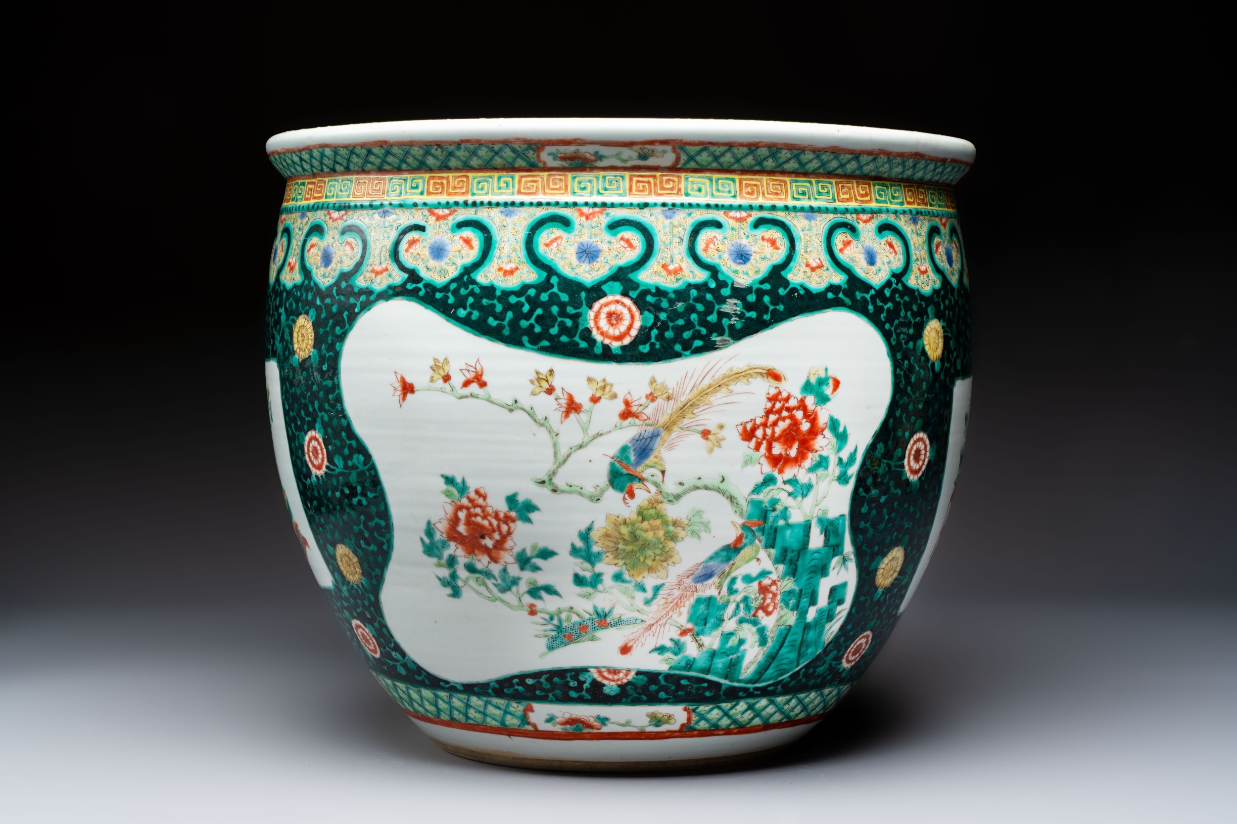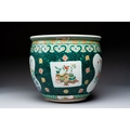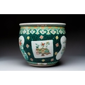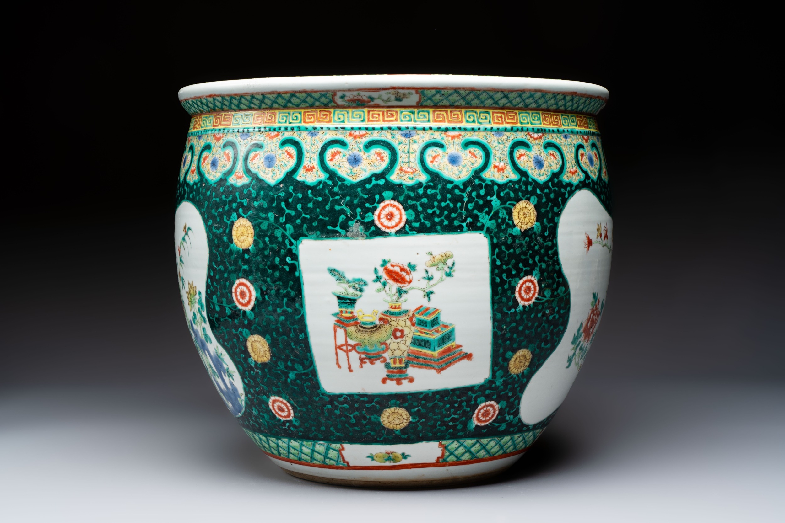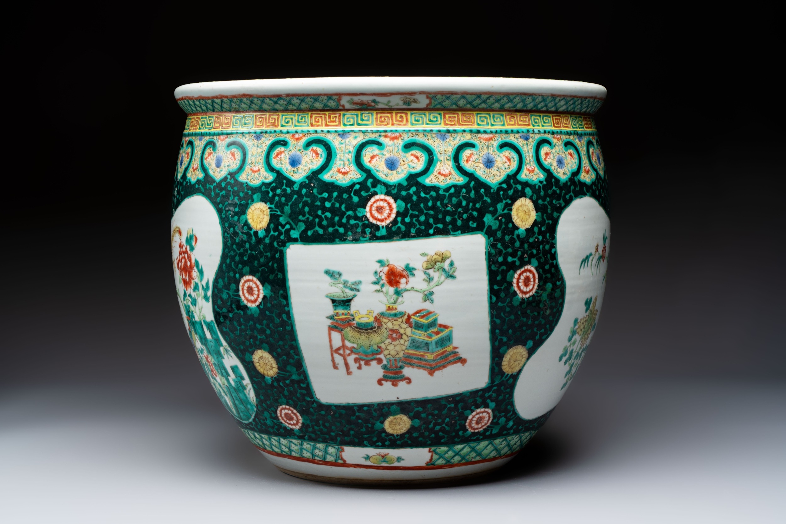 A Chinese famille verte black-ground jardinière with birds, antiquities and flowers, 19th C.