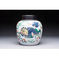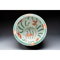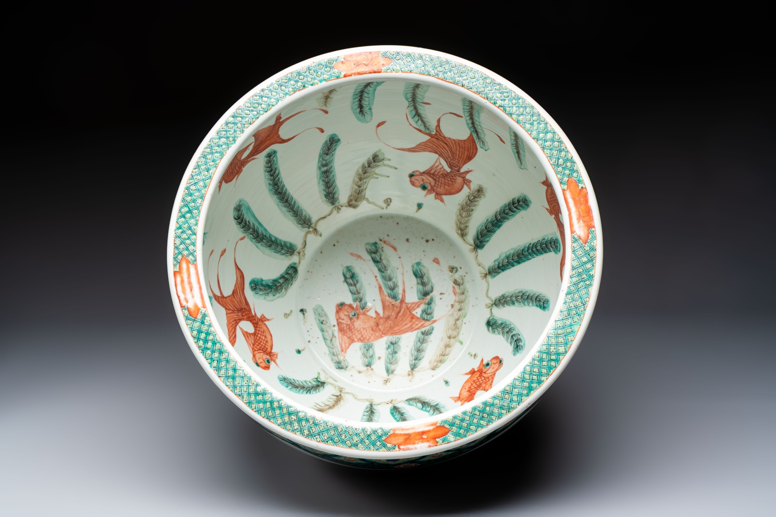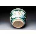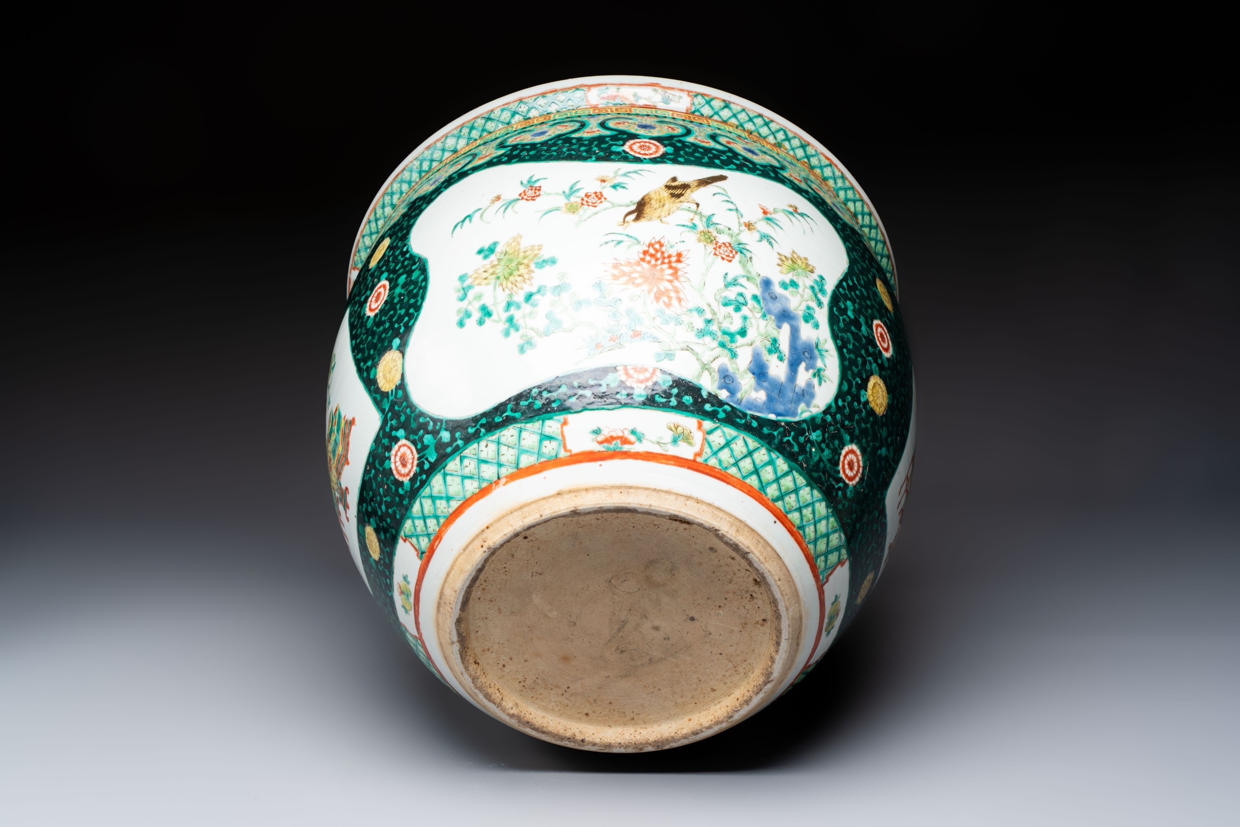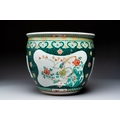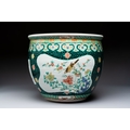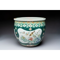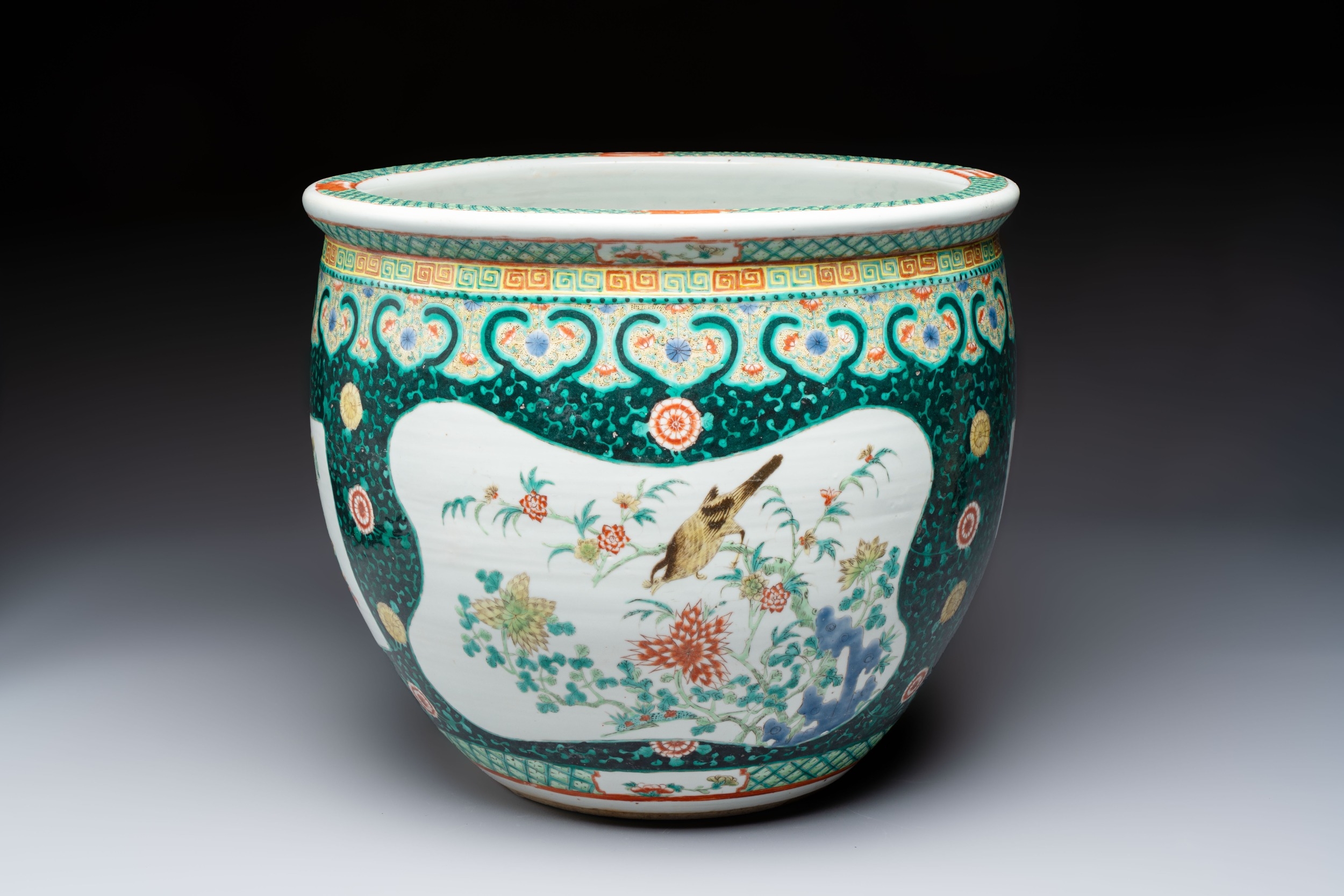 A Chinese famille verte black-ground jardinière with birds, antiquities and flowers, 19th C.