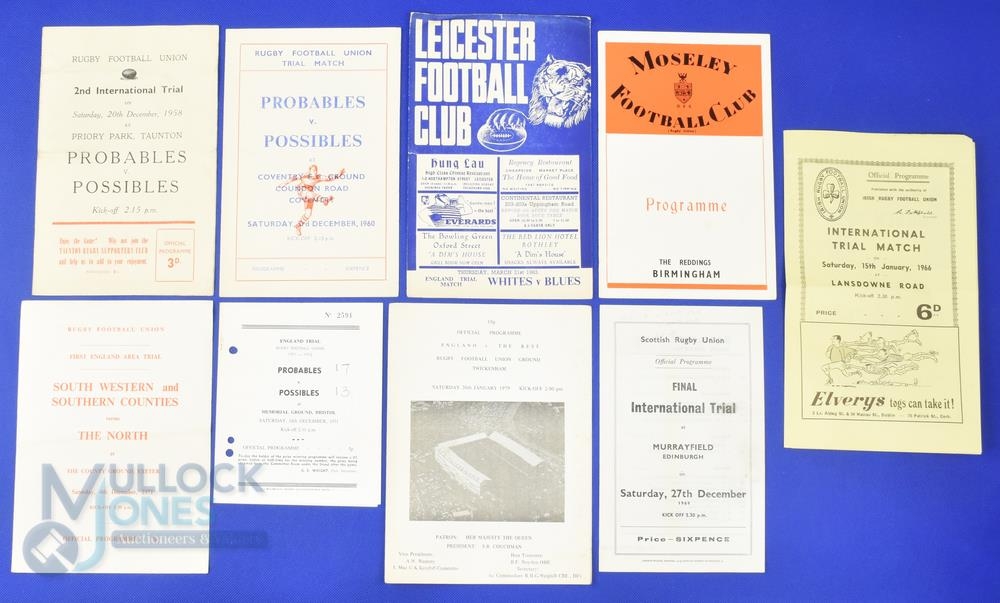 1958-79 Rugby Trials Programmes (9): English: 1960 (Coventry) and 1971 (Bradford), 1969 (Morley) and 1971 (Exeter), 1958 (Taunton), 1979 Jan, Final; and Tour Trial, 1963, Leicester. Irish: Final, Jan 1966; Scottish: Final, Dec 1969. Gen VG