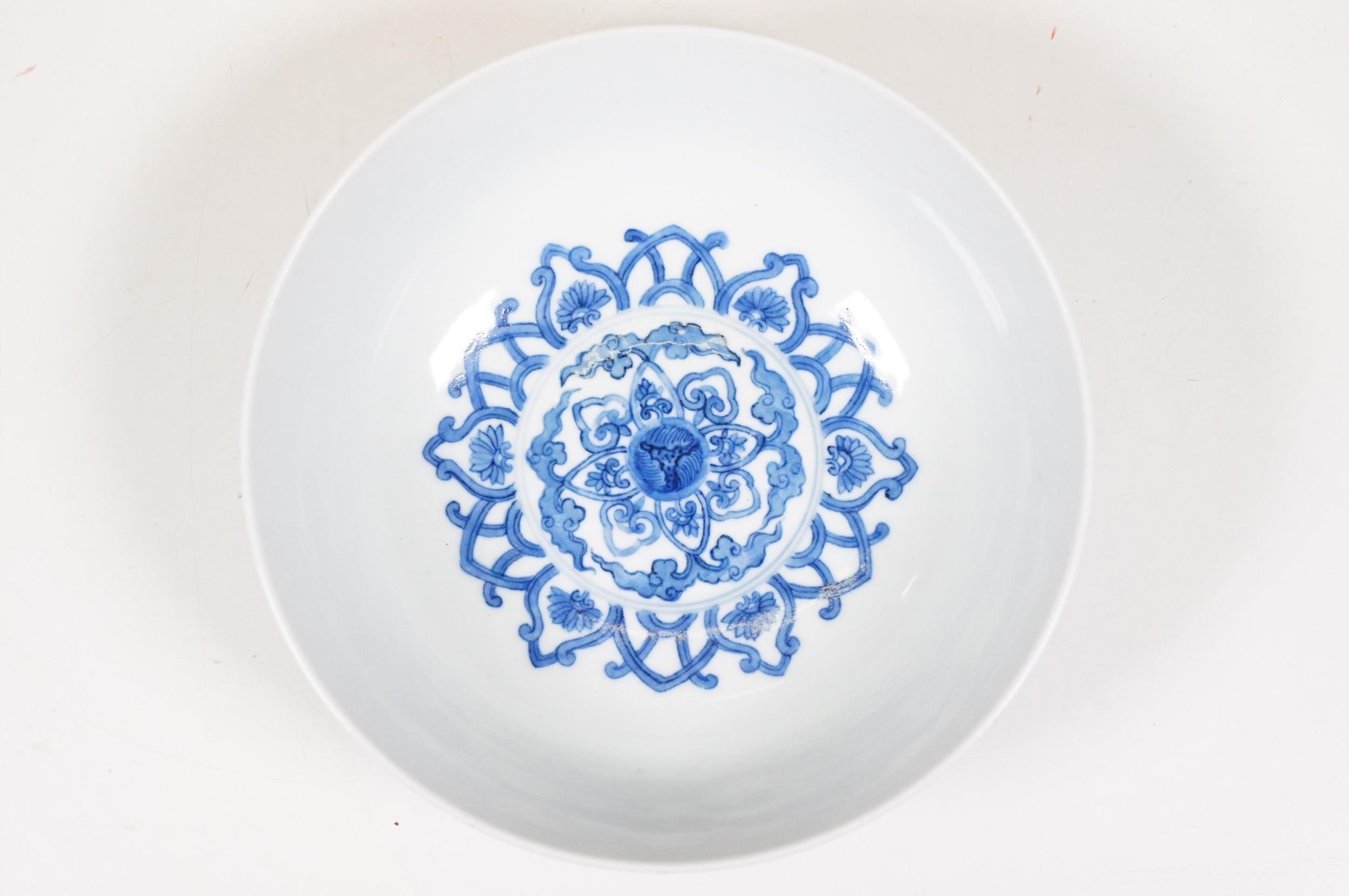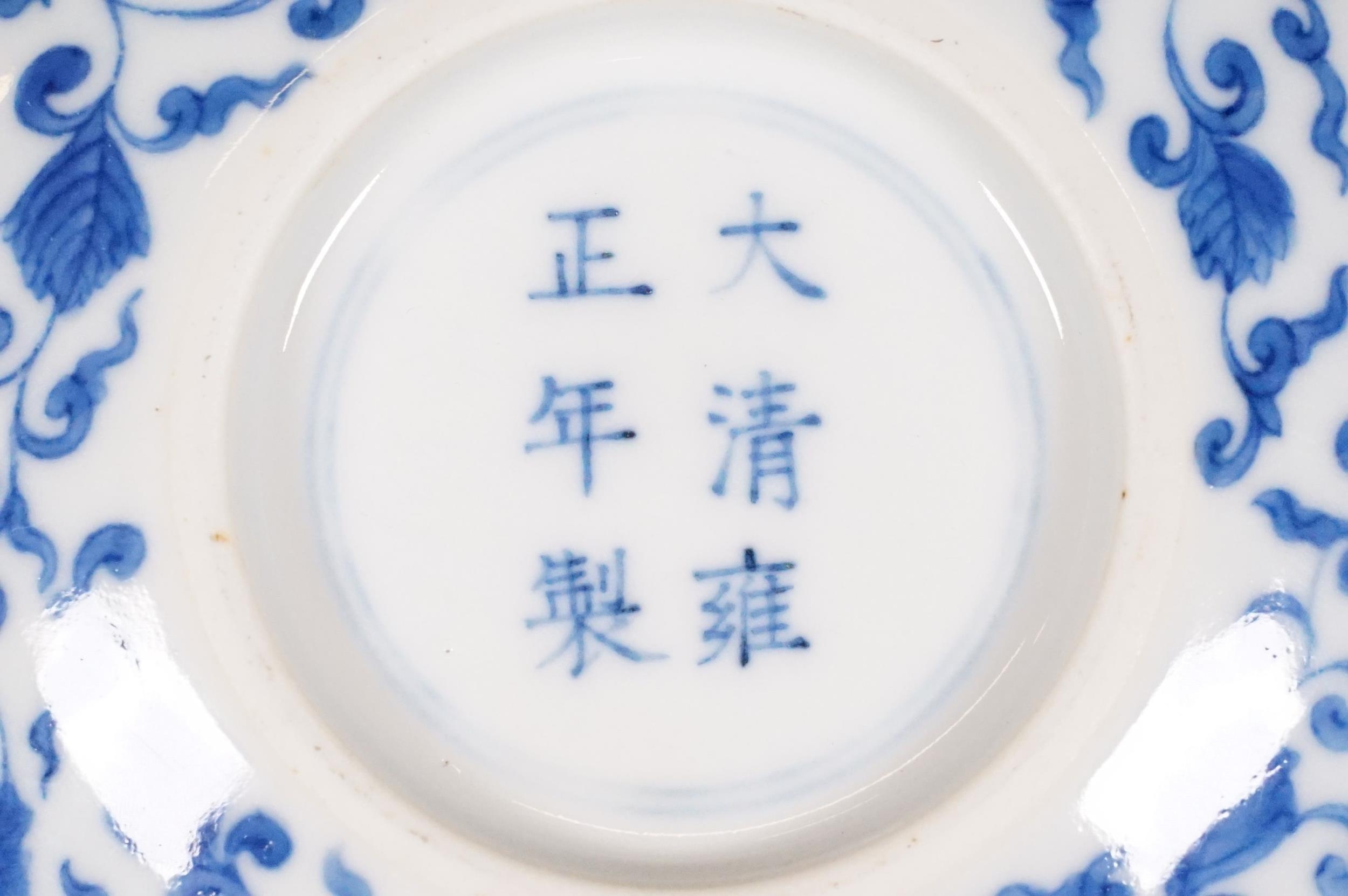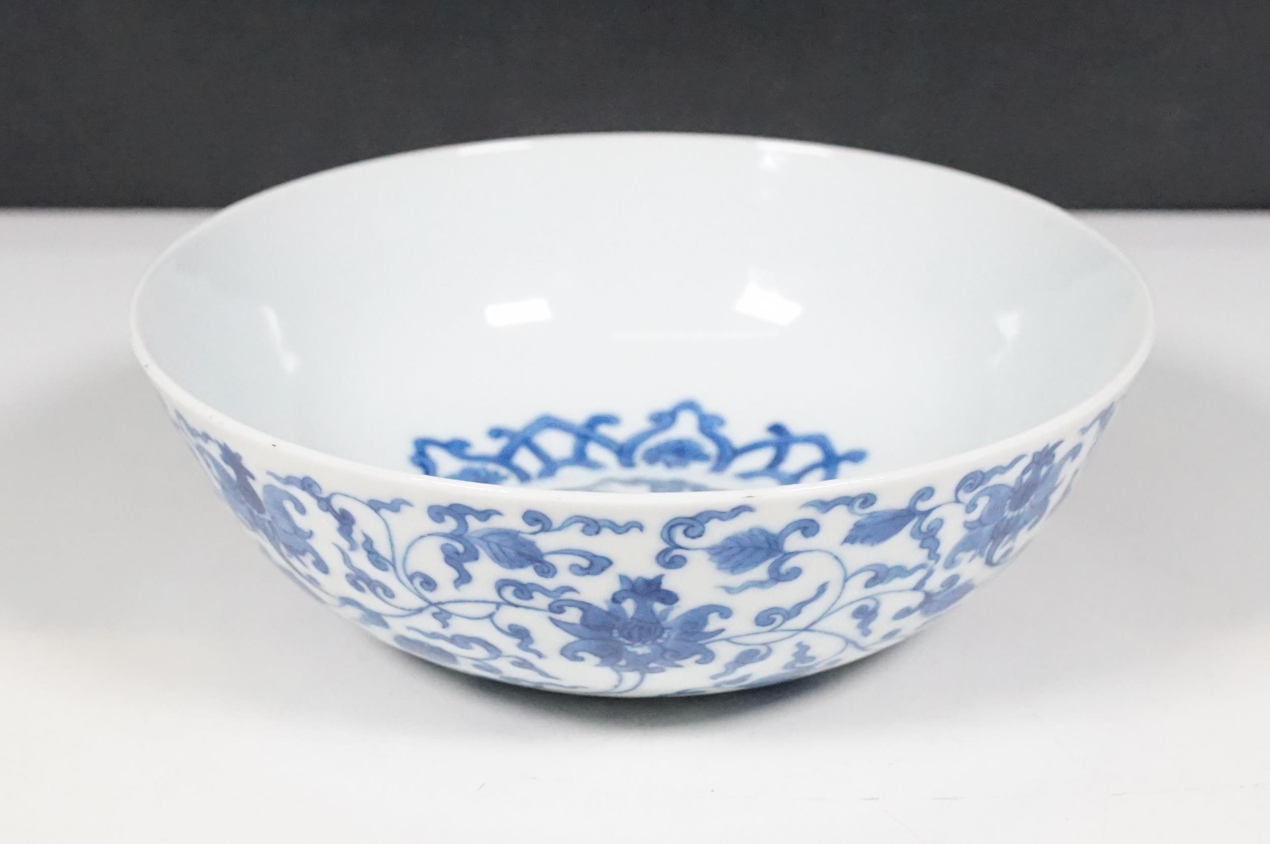 18th century Chinese blue and white bowl with floral outer detailing and inner pattern design, Yongzheng character mark to base, 15.5cm diameter